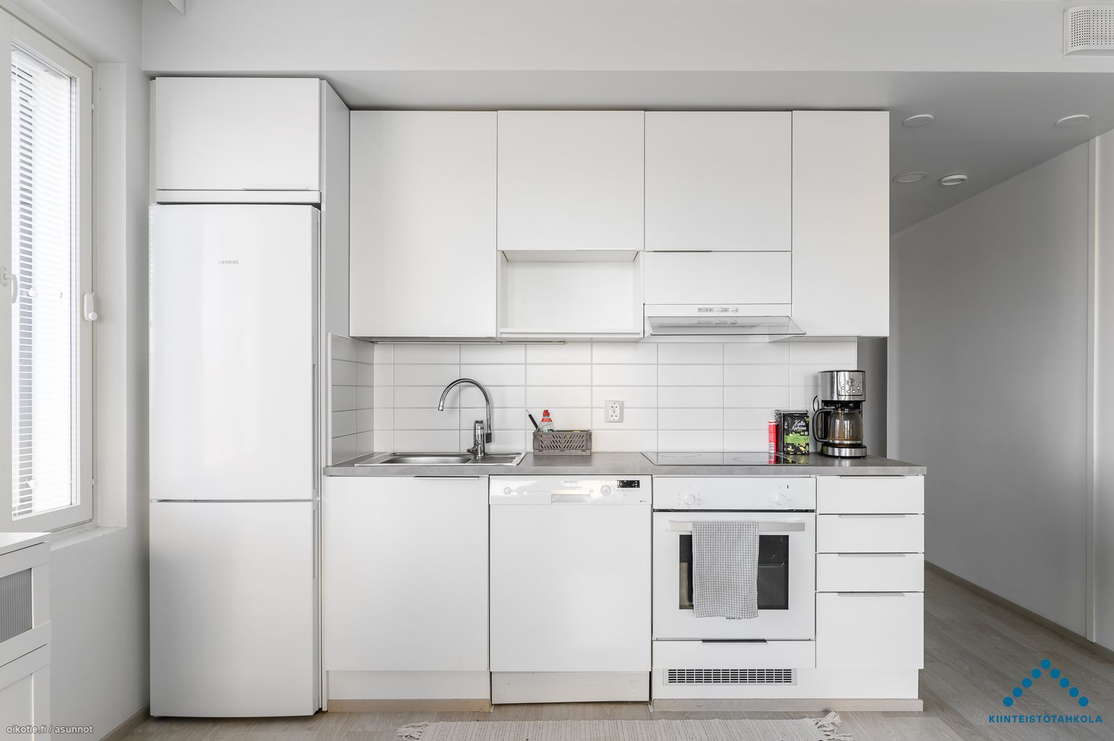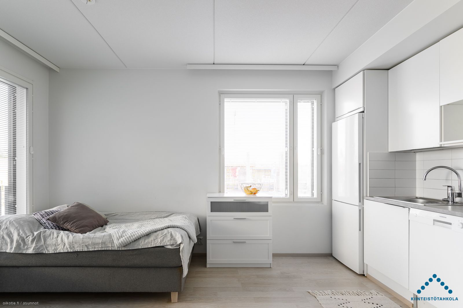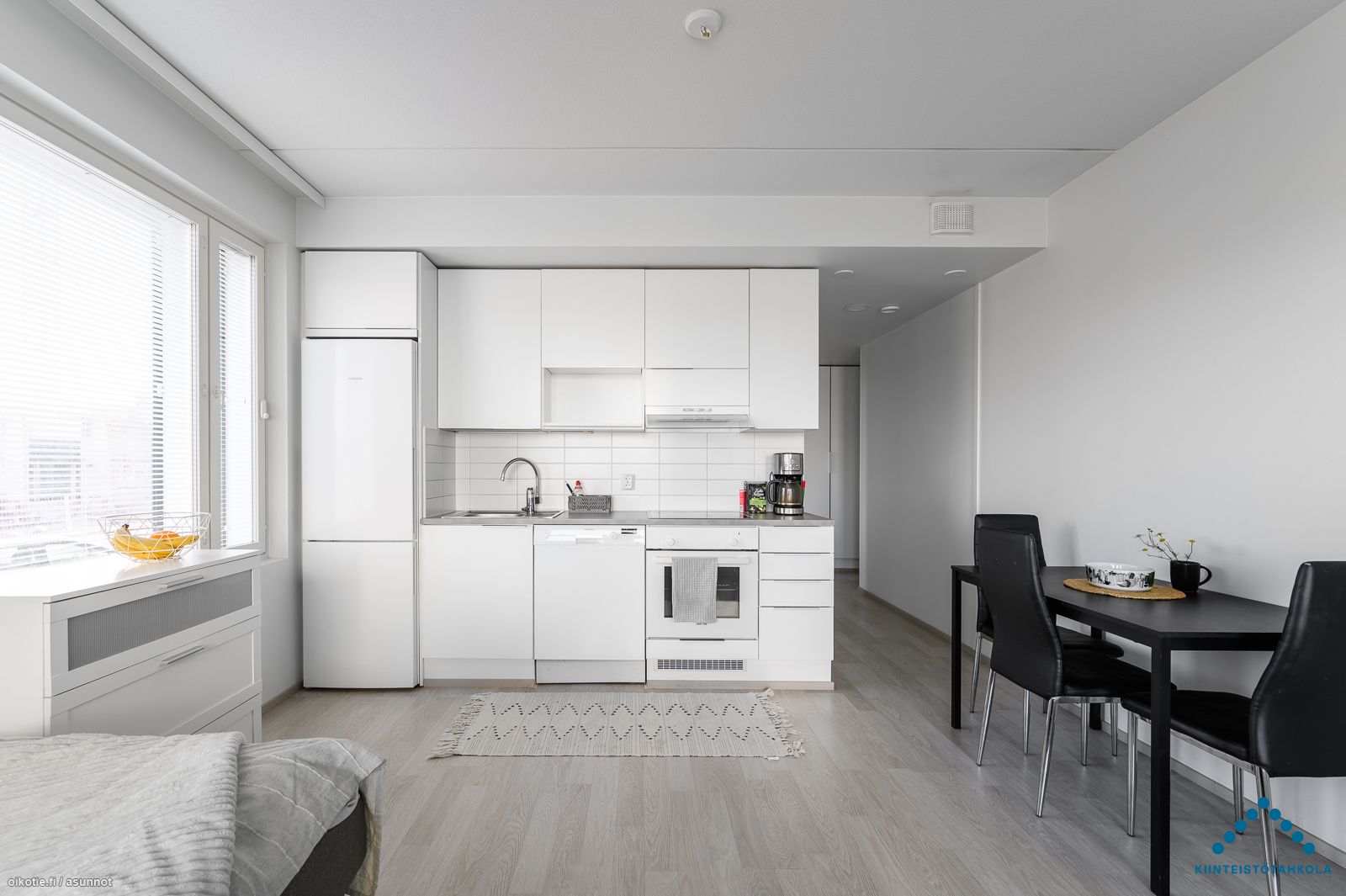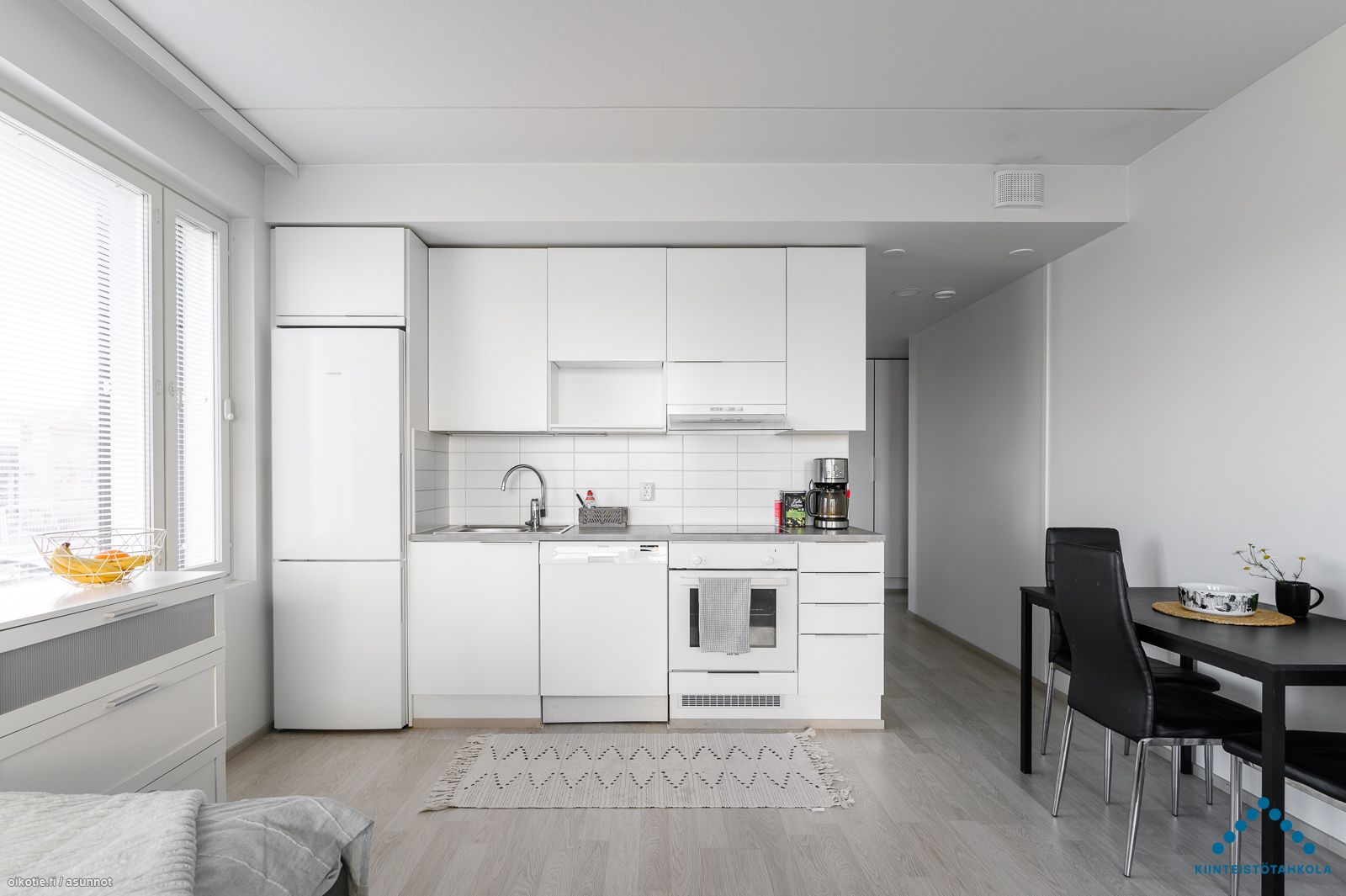 Tämä upea kaksio sijaitsee talon ensimmäisessä kerroksessa. Asunnossa on todella laadukkaat materiaalit, lattioissa laminaatit ja seinäpinnat valkoiseksi maalatut. Kosteissa tiloissa materiaalina on kaakeli.