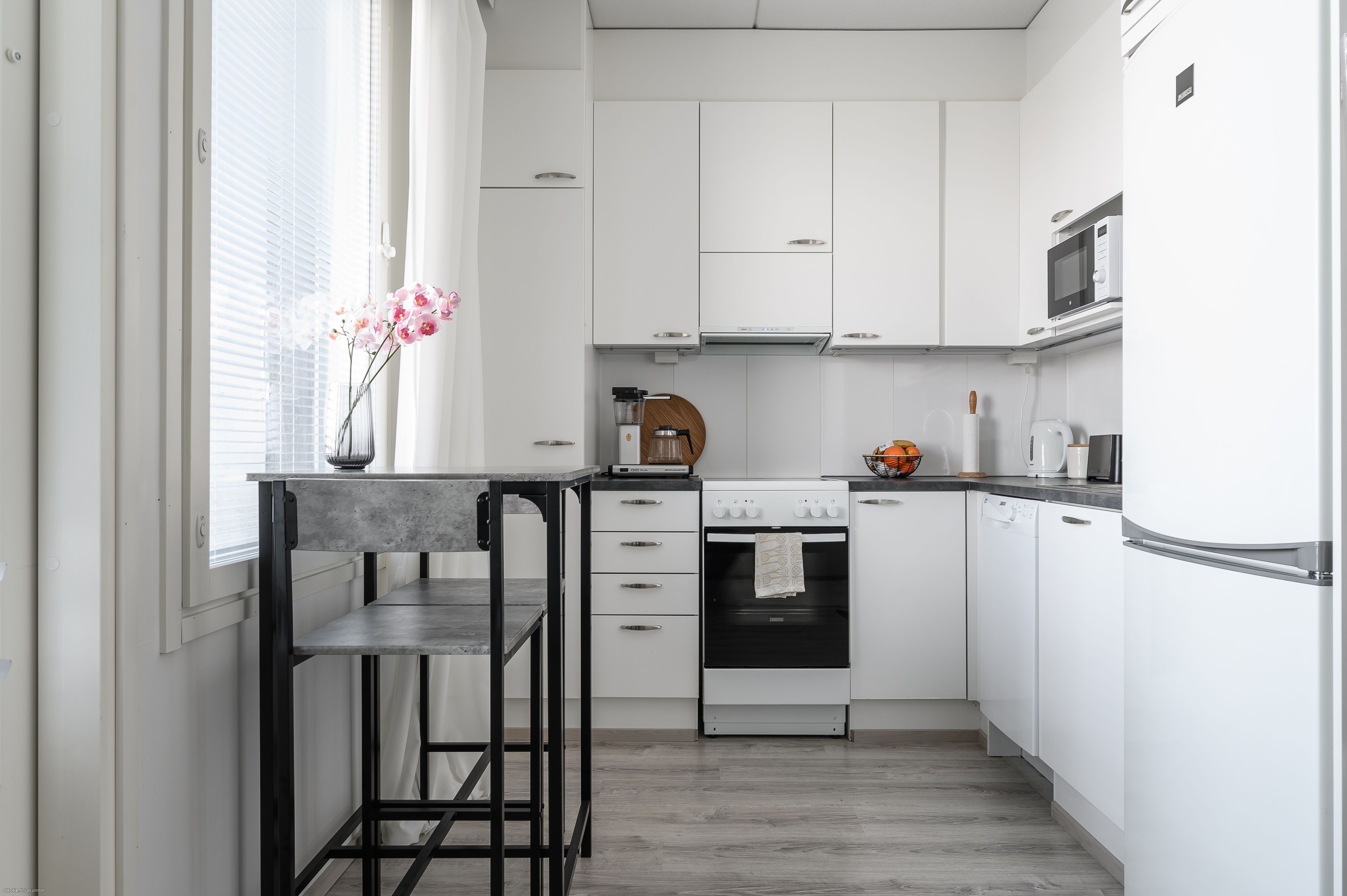 | Keittiön varusteet | Liesi: keraaminen. Työtasot: laminaatti. Kylmäsäilytys: jääkaappi/pakastin. Varustus: liesikupu, astianpesukone, kiinteät valaisimet. |