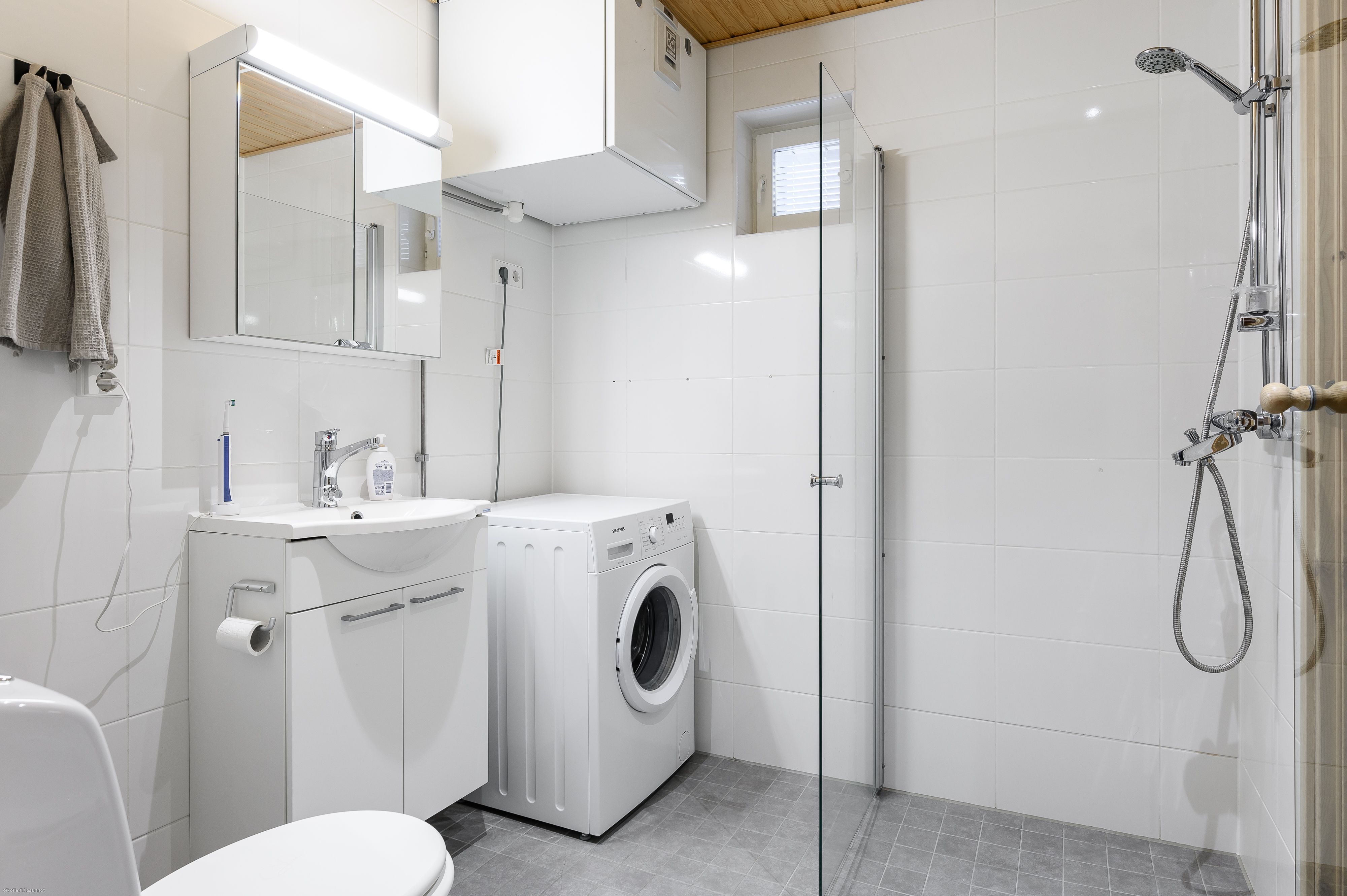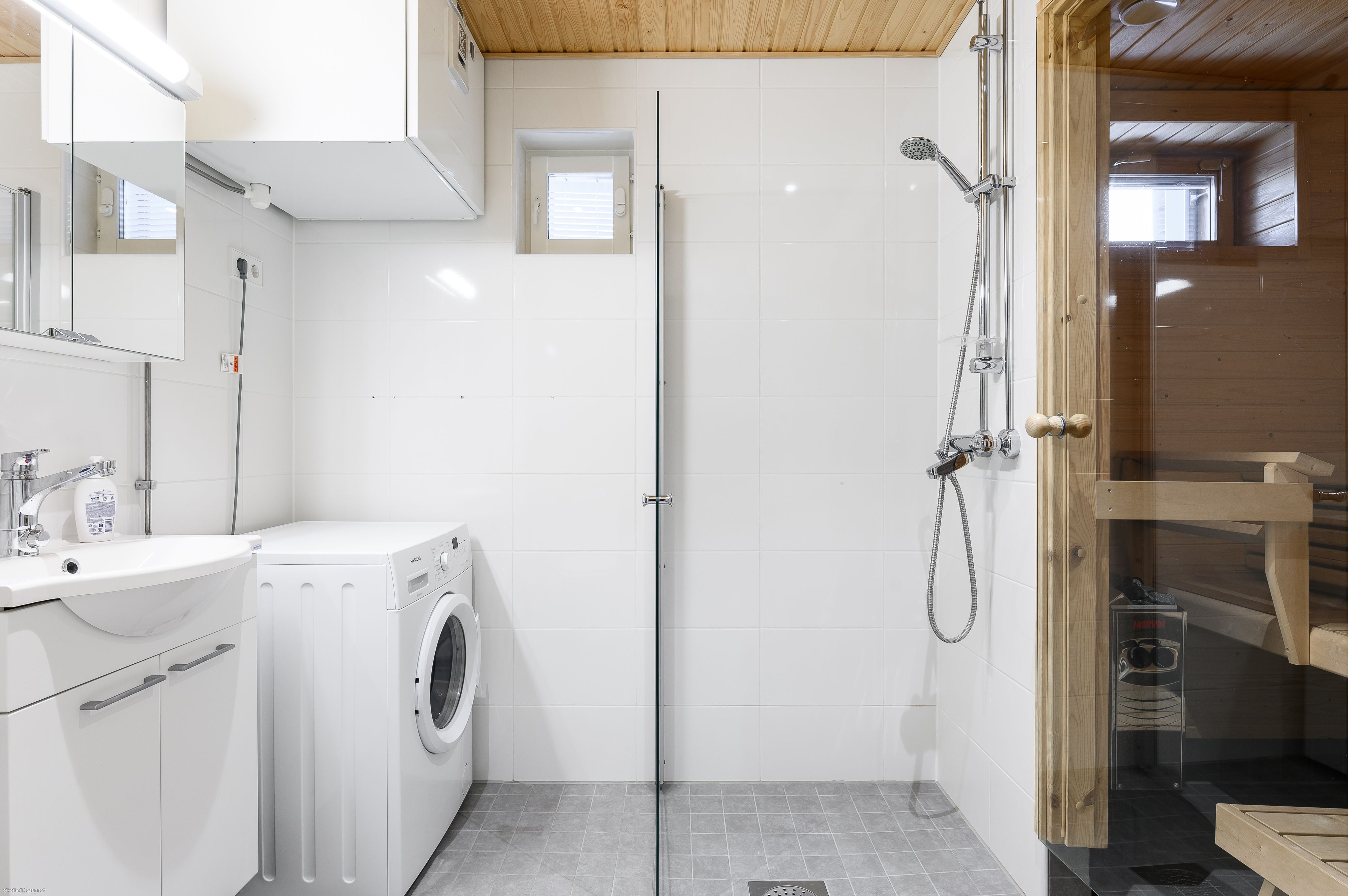 | Kylpyhuoneen varusteet | Varustus: suihkuseinä, pesukoneliitäntä, lattialämmitys, wc-istuin, suihku, peilikaappi, kiinteät valaisimet. |
