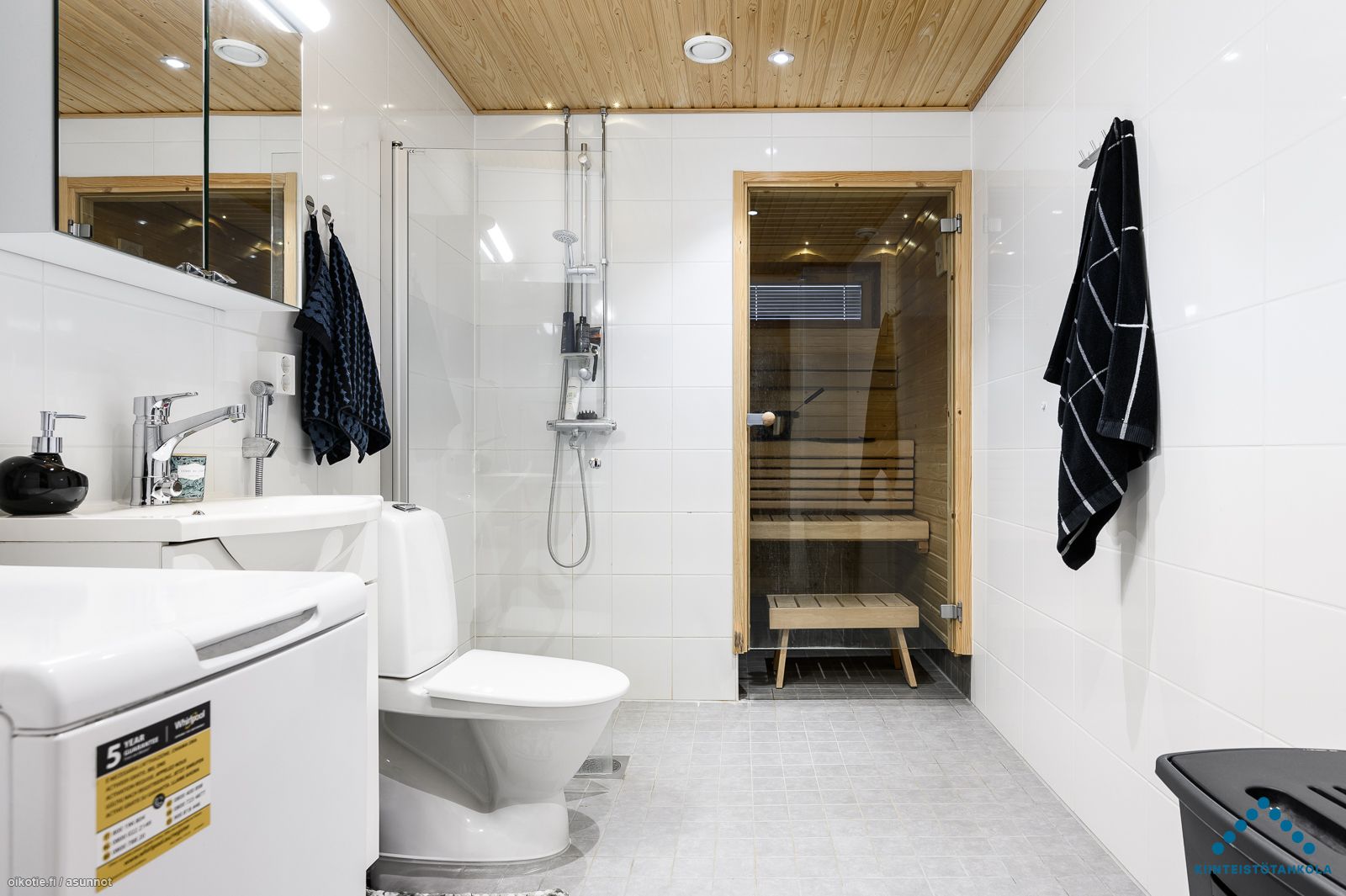 | Kylpyhuoneen varusteet | Varusteet: Suihkuseinä, Pesukoneliitäntä, Lattialämmitys, WC, Suihku, Peilikaappi, Kiinteät valaisimet |