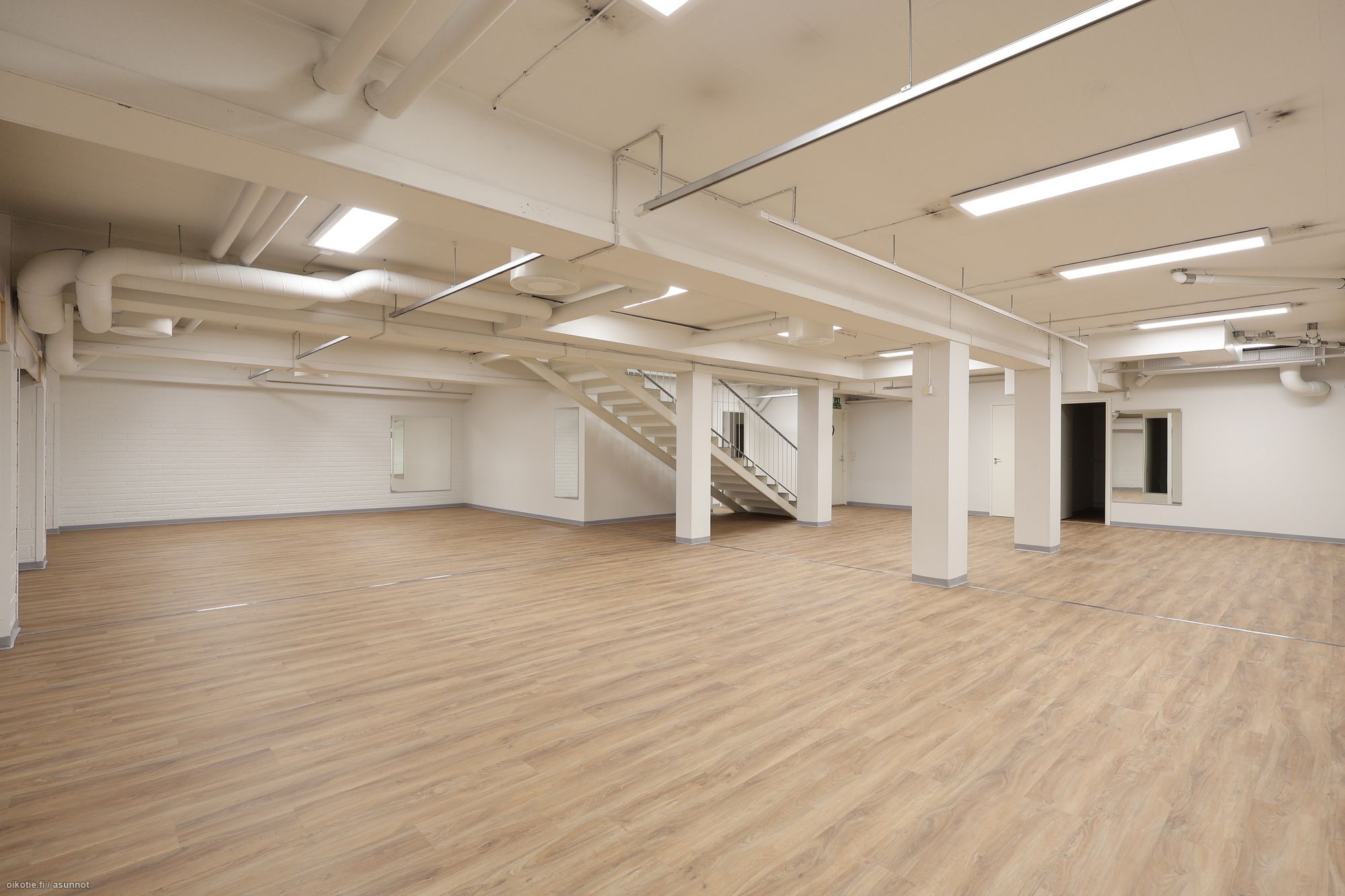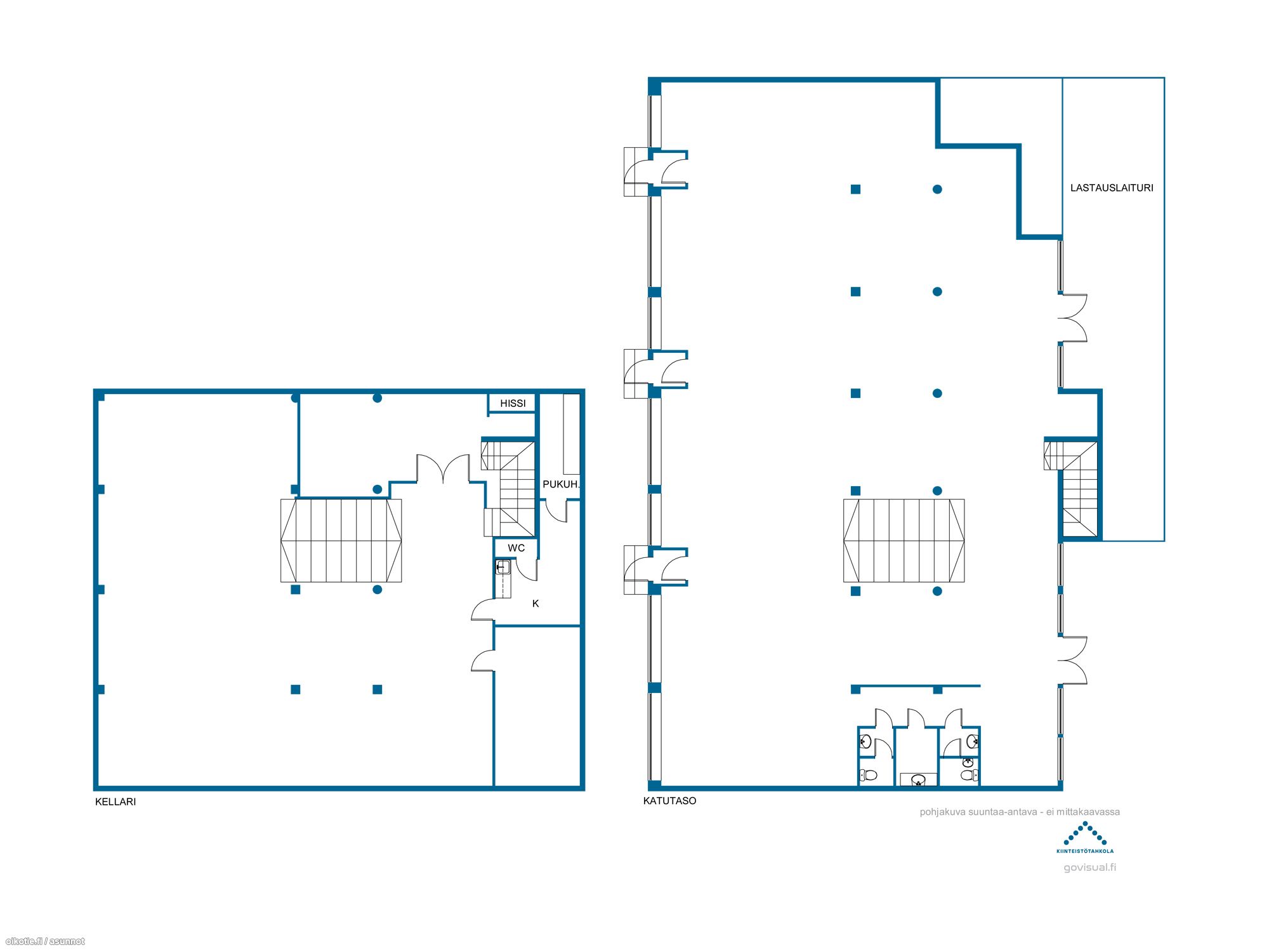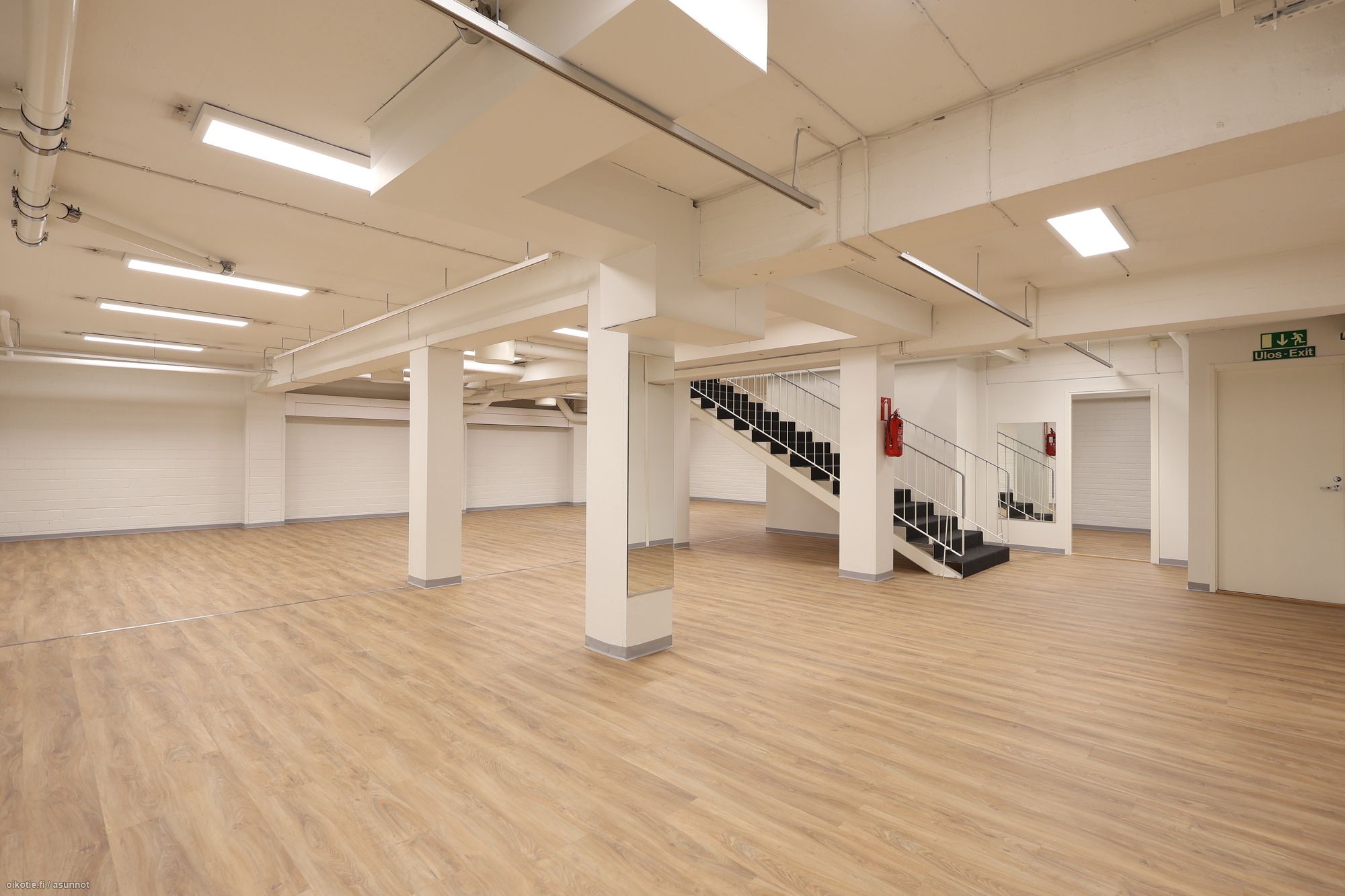 – Alakerta: Varasto- ja monitoimitilaa 212 m², jossa keittiö, sosiaalitilat ja toimistohuone.