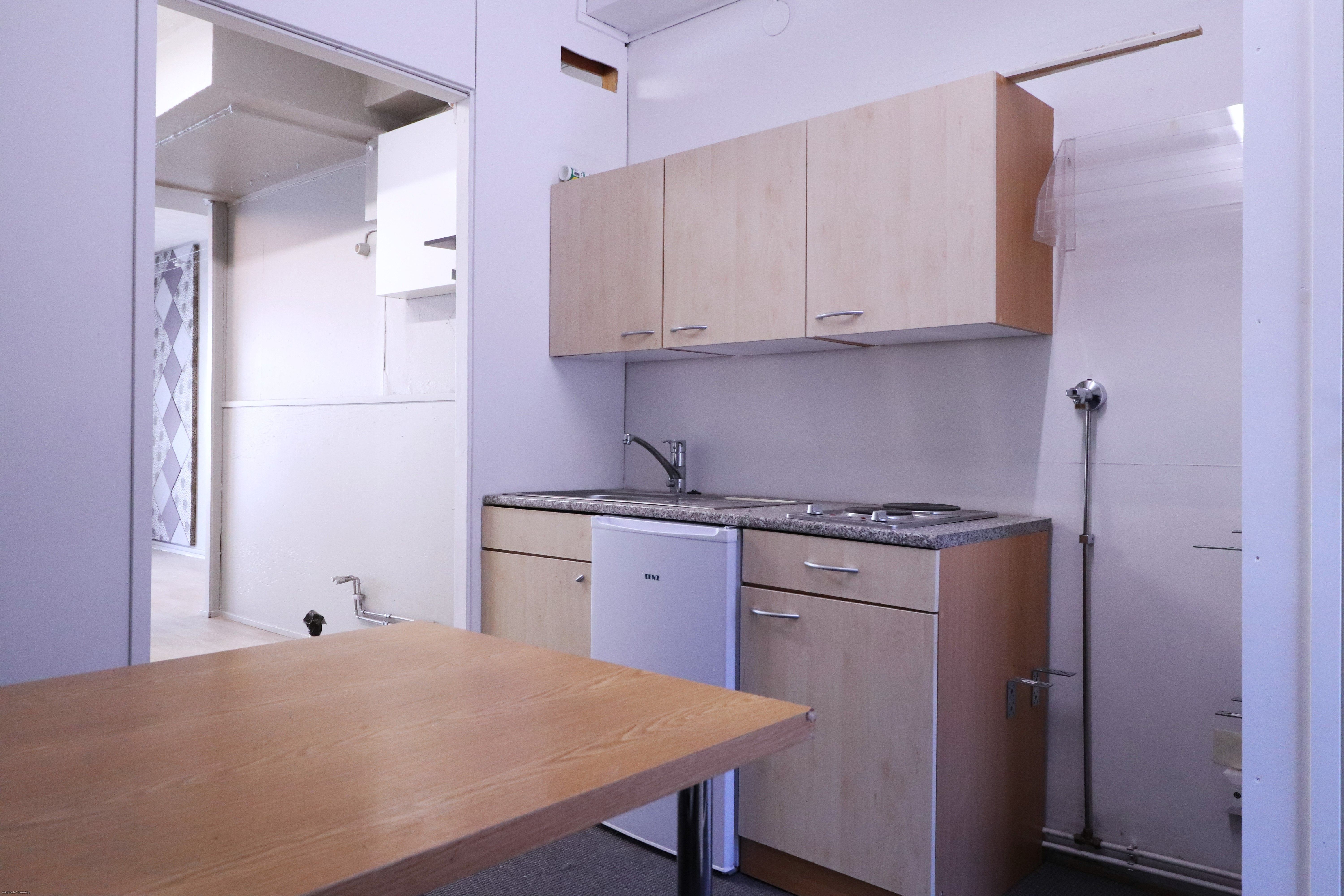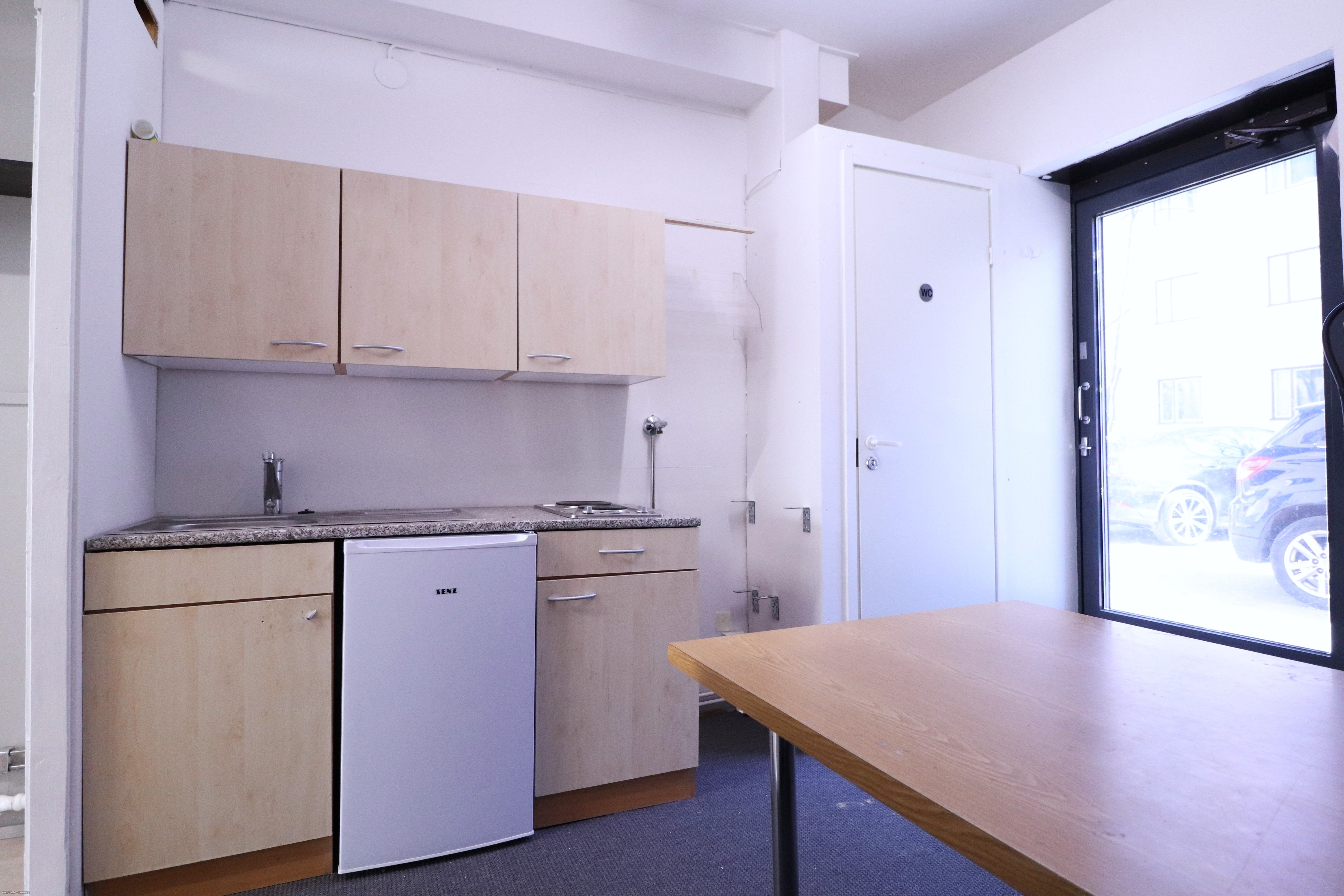 Tila on pääasiassa avotilaa, jonka perällä on erillinen pienempi takatila. Takatilassa on minikeittiön kalustus ja erillinen wc.