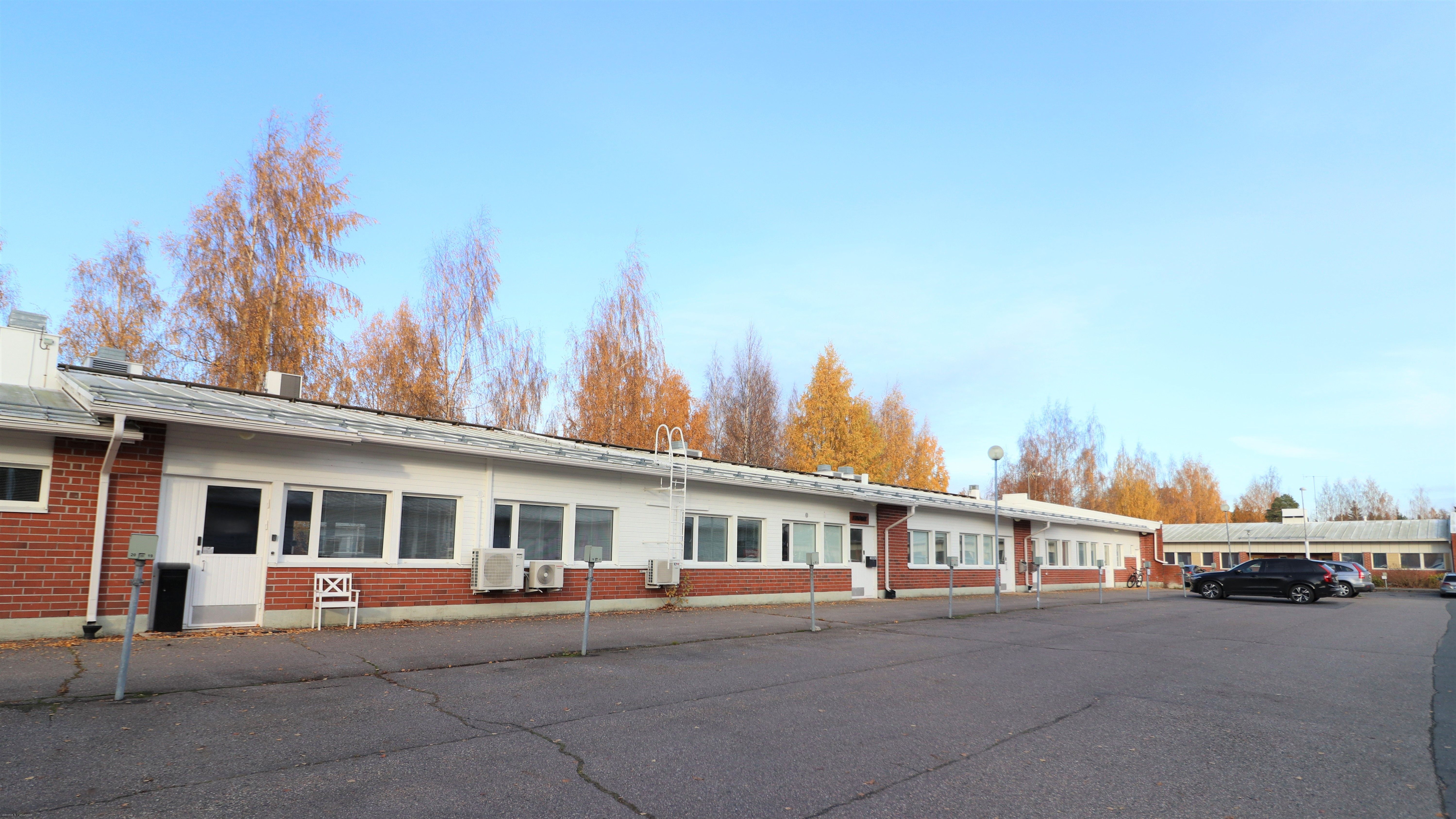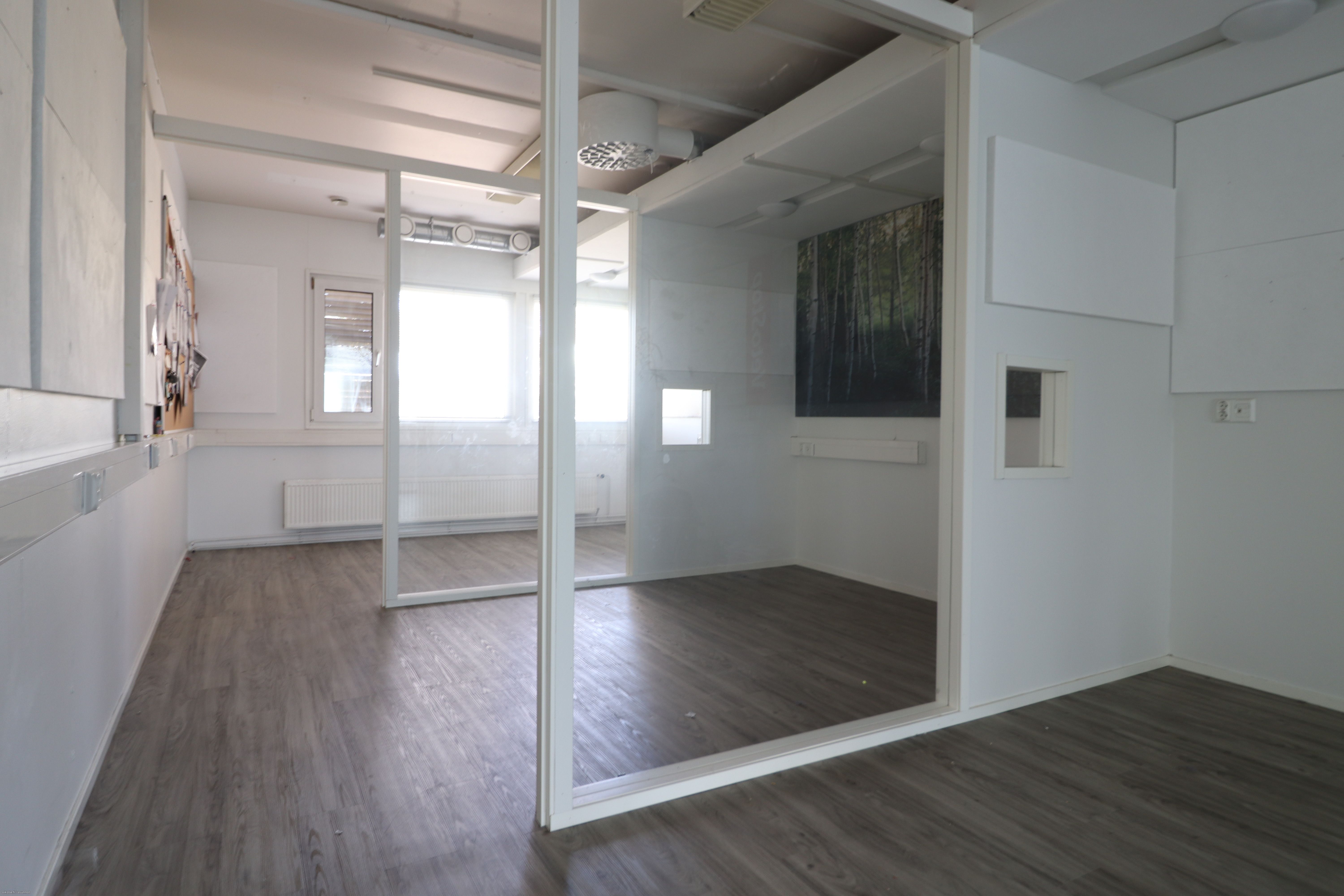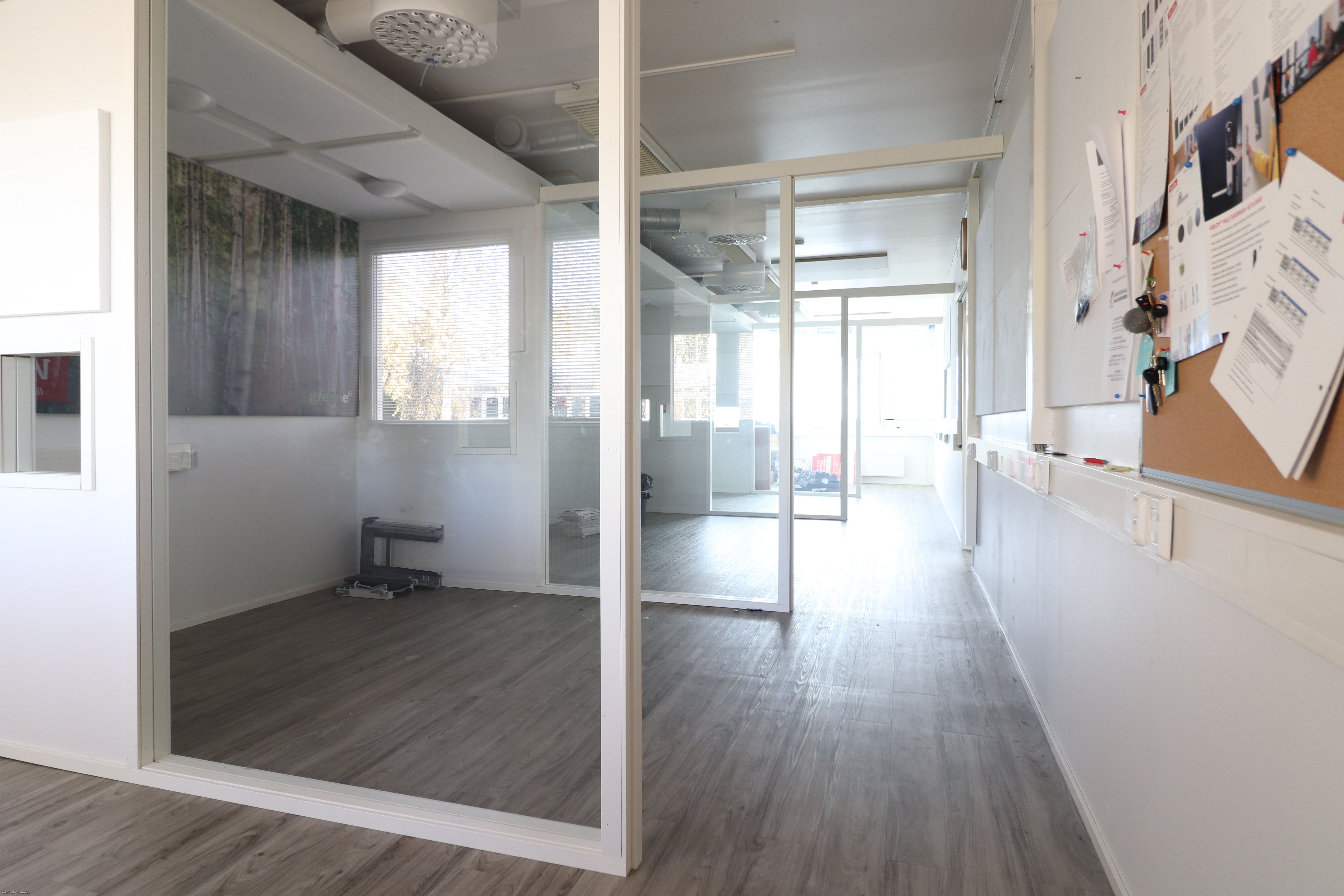 Siisti toimistotila on jaettu taukotilaa lukuun ottamatta osiin. Tiloista 58,6m2 tila on jaettu neljään osaan lasiseinäkkeillä, jotka ovat helposti purettavissa. Taukotilan yhteydessä on 10m2 toimistohuone, kaksi vessaa sekä pieni varastokoppi. Toisessa vessassa suihkukaappi. Tiloissa on koneellinen ilmanvaihto ja viilennys, valokuituverkko ja hyvä valaistus. Lämmitystolpallisia autopaikkoja löytyy pihasta mukavasti. Tila on mahdollista jakaa kahteen osaan, jotka kooltaan 194m2 ja 78m2.