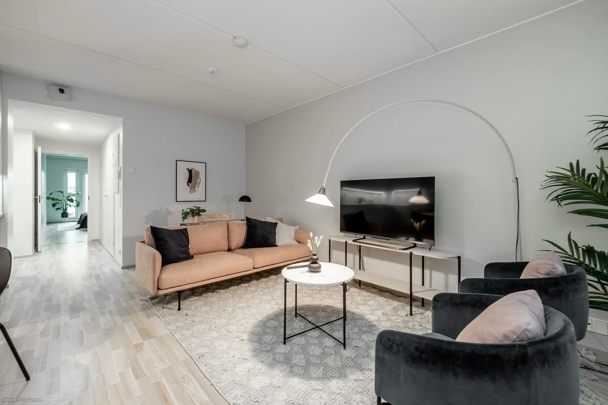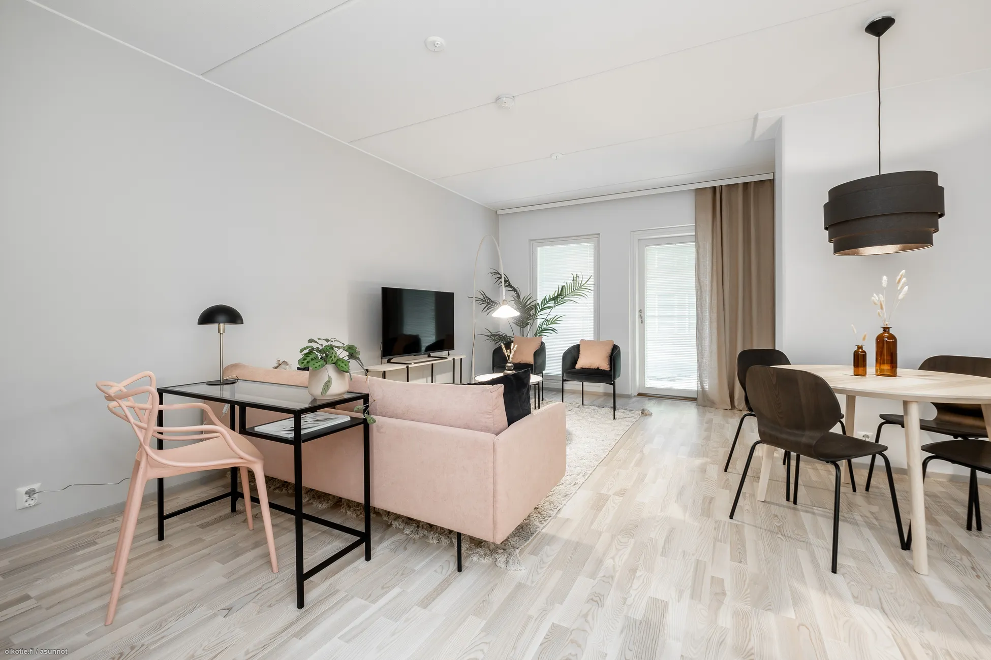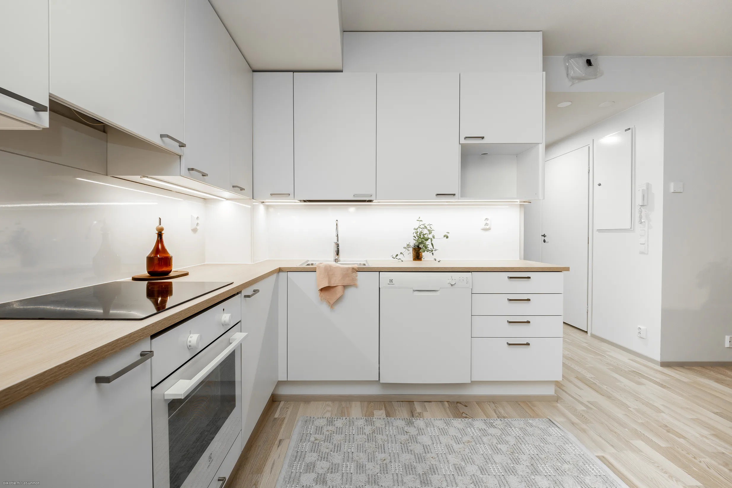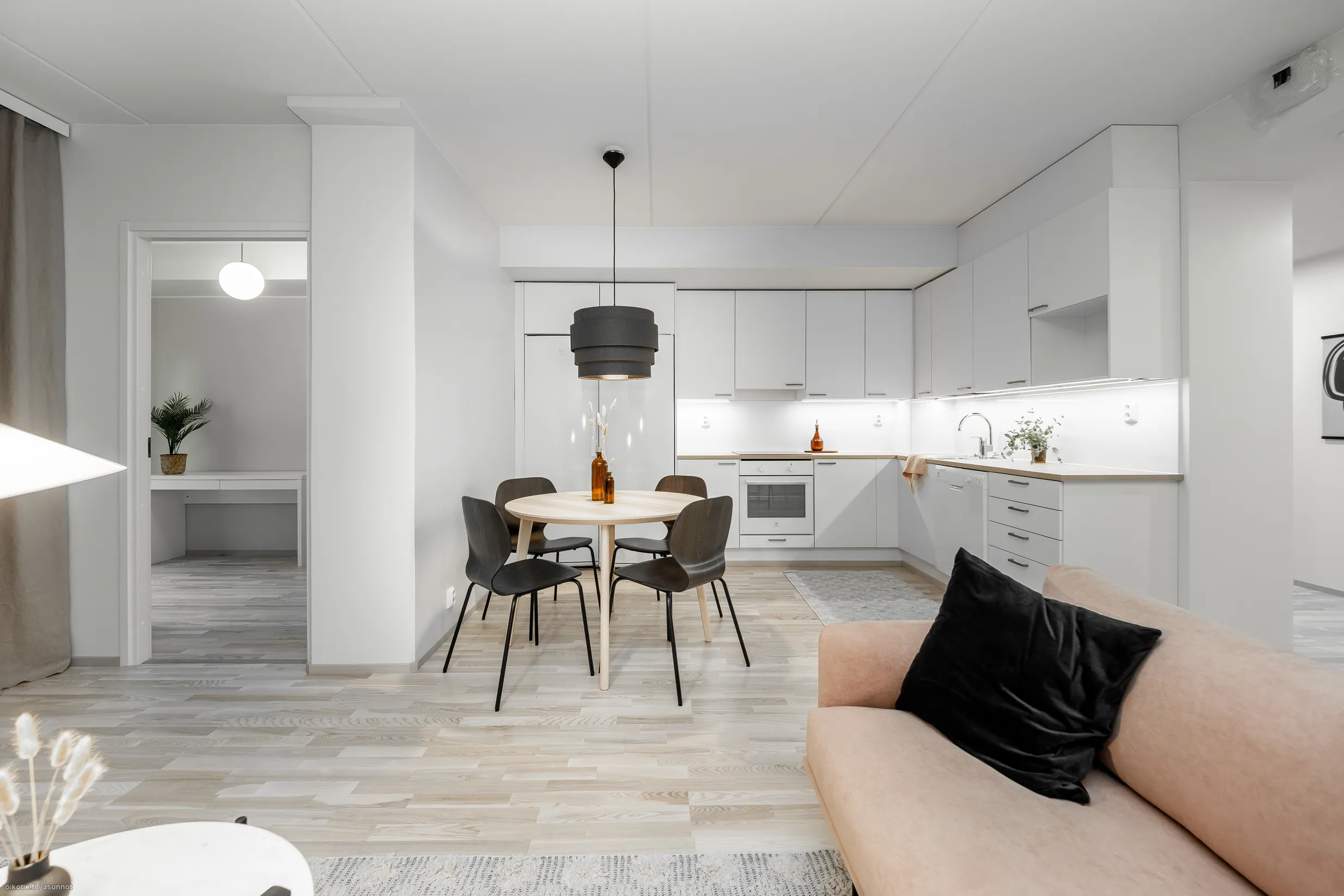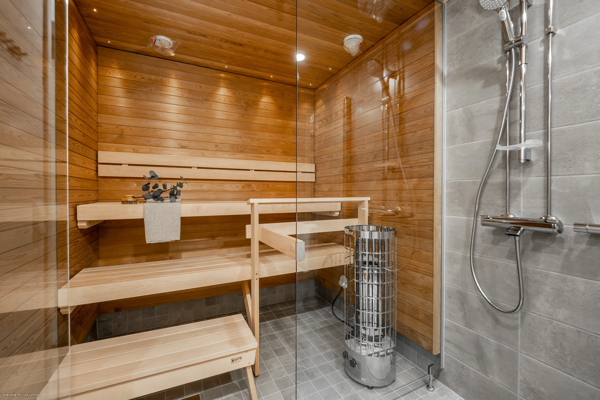 Asunnon oleskelutila on helppo kalustaa moneen makuun sopivaksi. Puustellin kalusteet, laadukkaat kodinkoneet sekä lattialämmitys tekevät asumisesta nautinnollista. Tyyliä uuteen kotiisi tuo myös saunan lasiseinä ja sadesuihku.