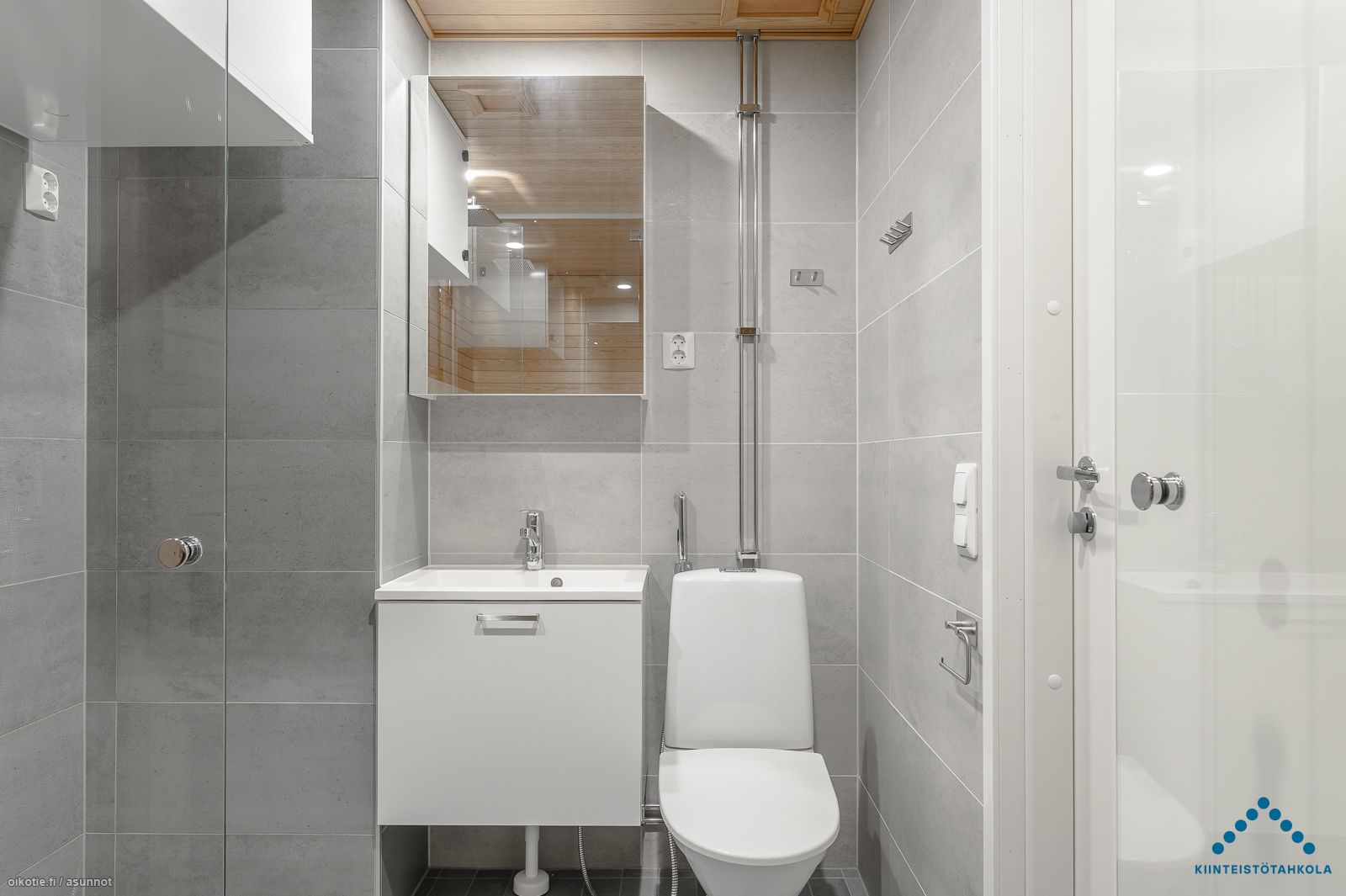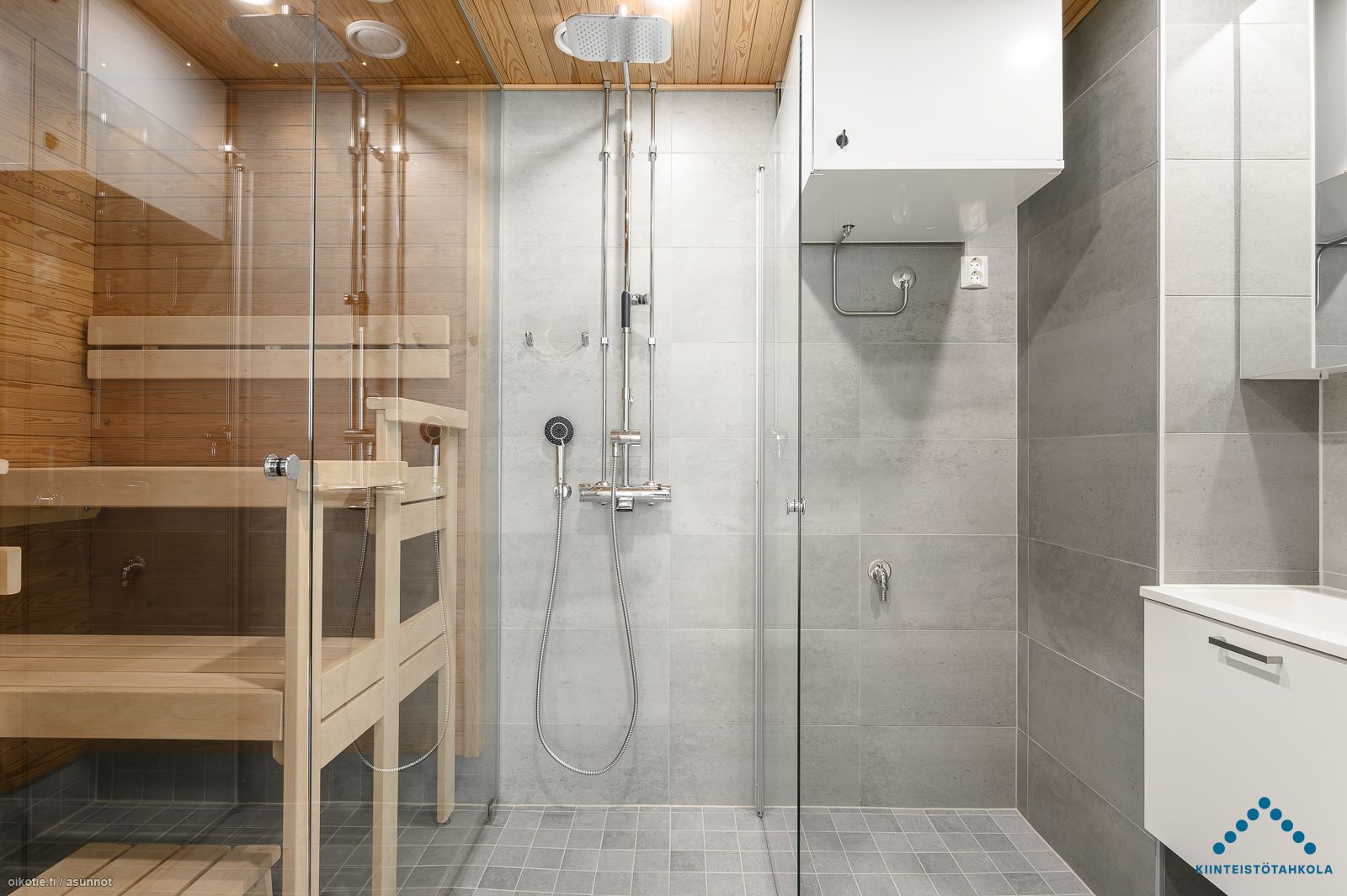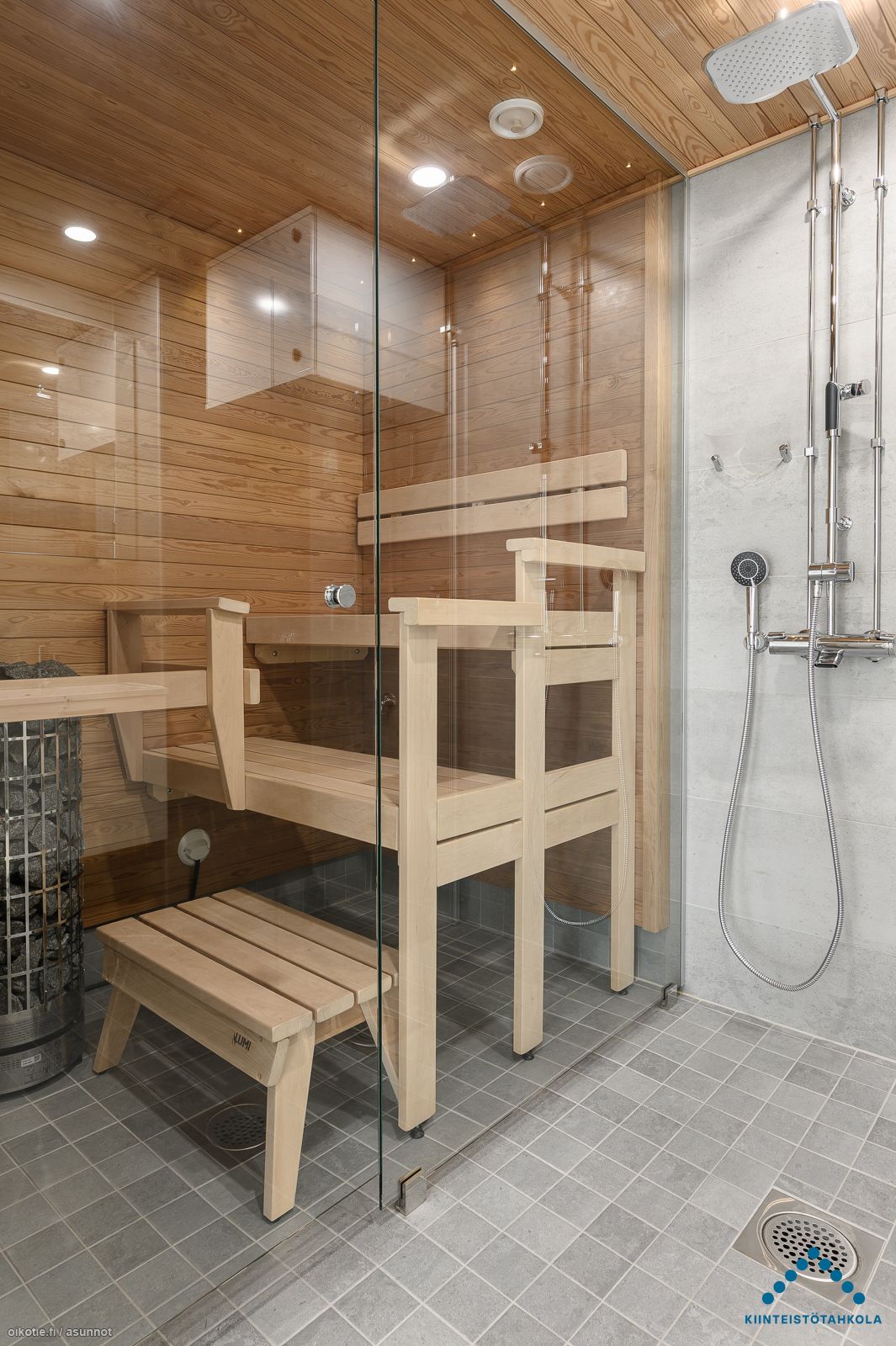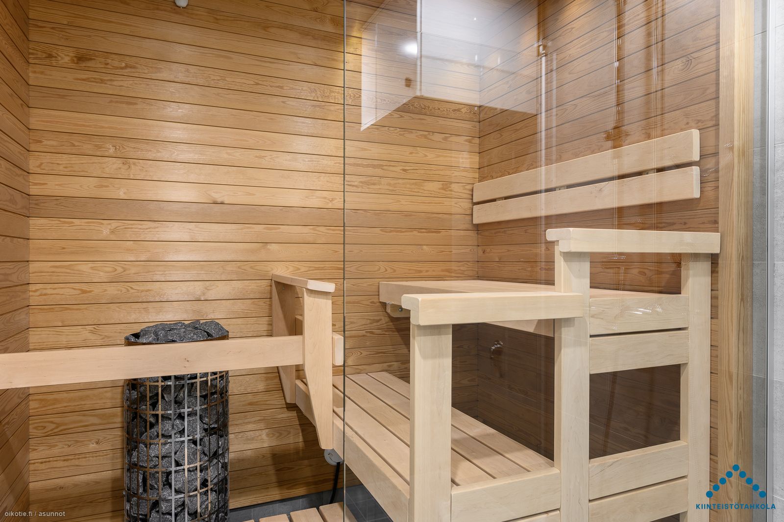 Asunnon oleskelutila on helppo kalustaa moneen makuun sopivaksi. Puustellin kalusteet, laadukkaat kodinkoneet sekä lattialämmitys tekevät asumisesta nautinnollista. Tyyliä uuteen kotiisi tuo myös saunan lasiseinä ja sadesuihku.