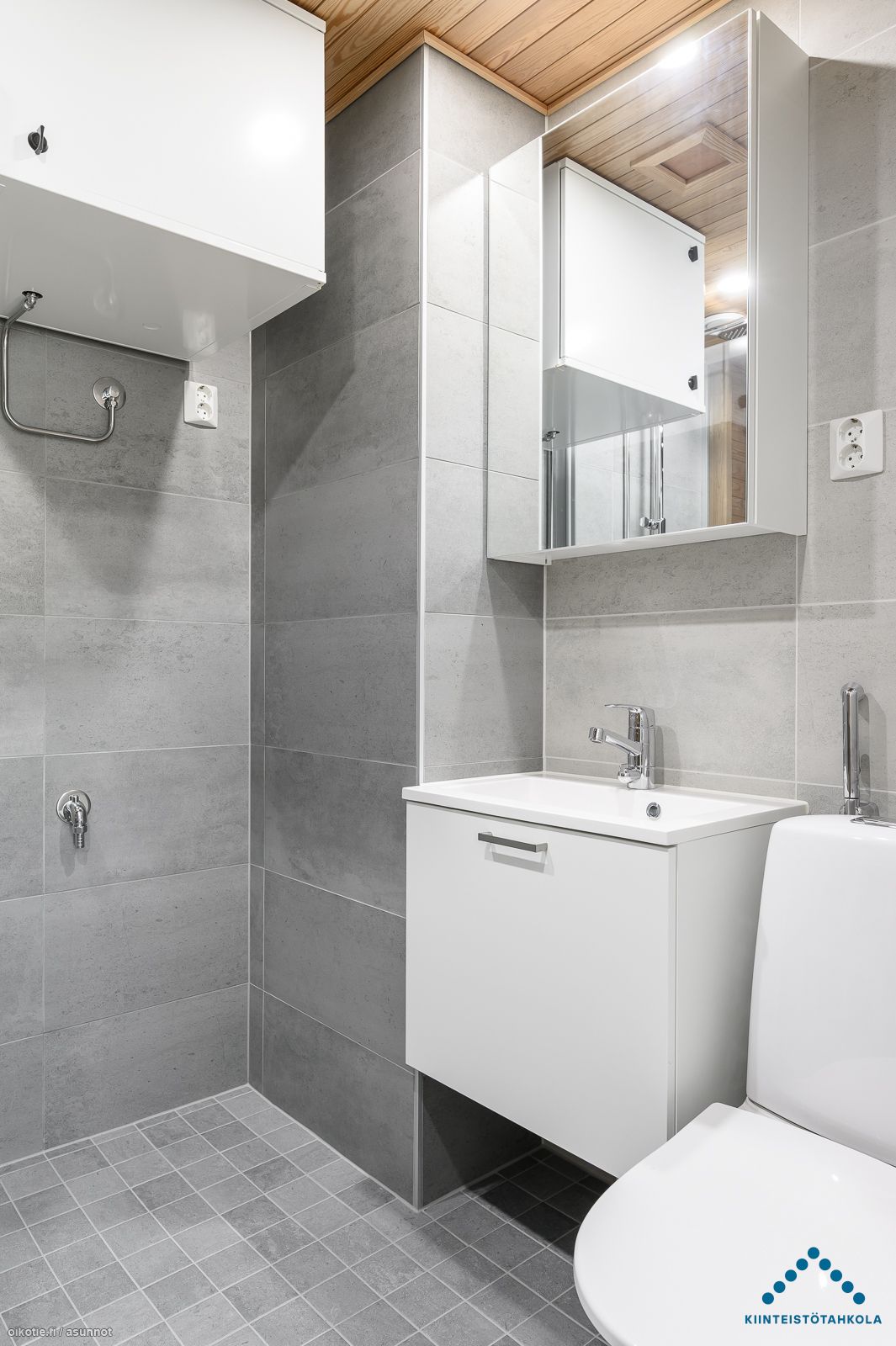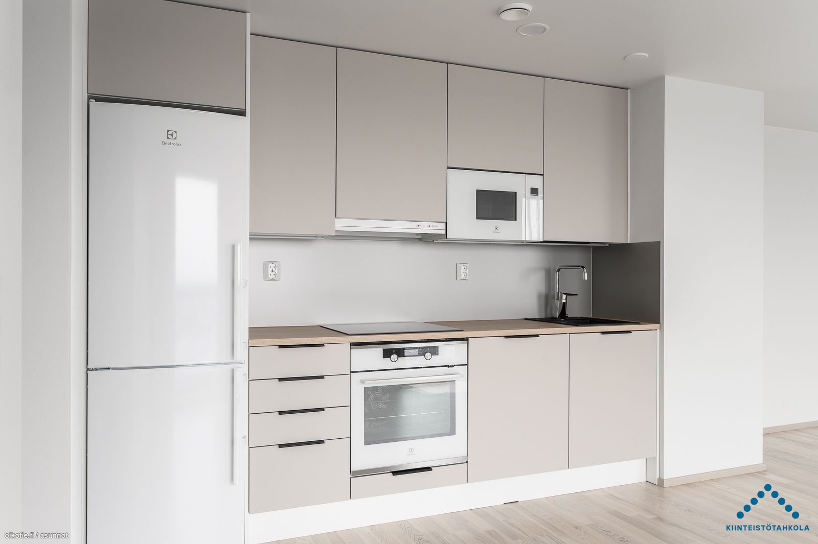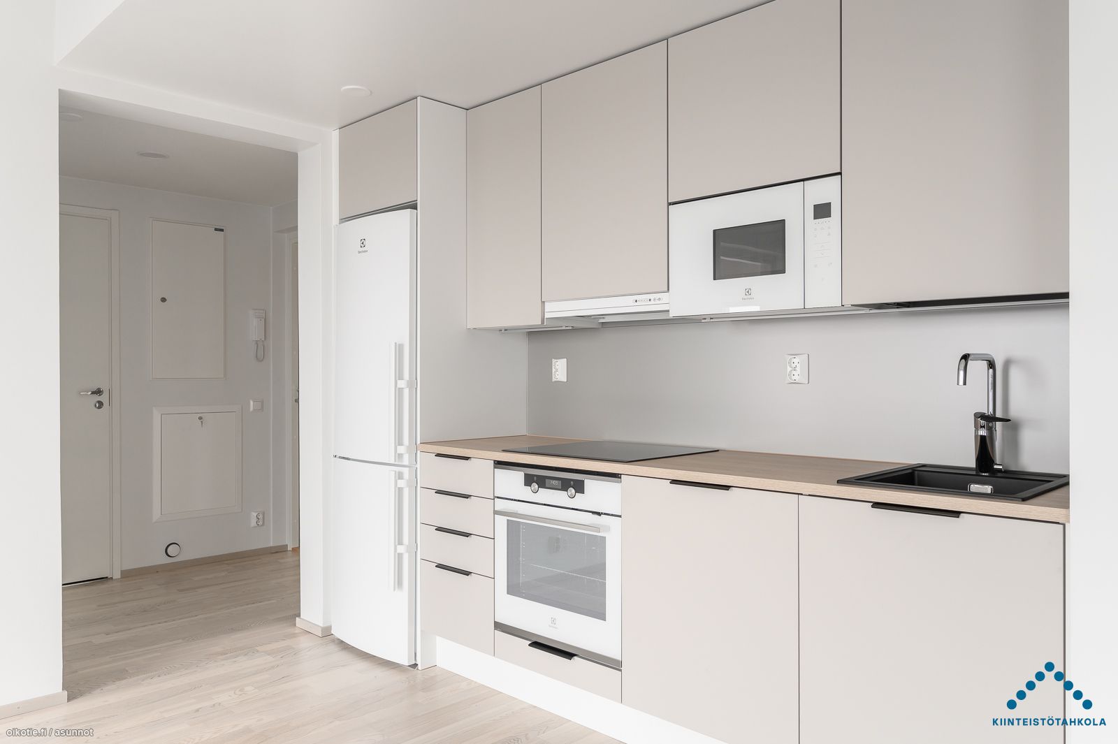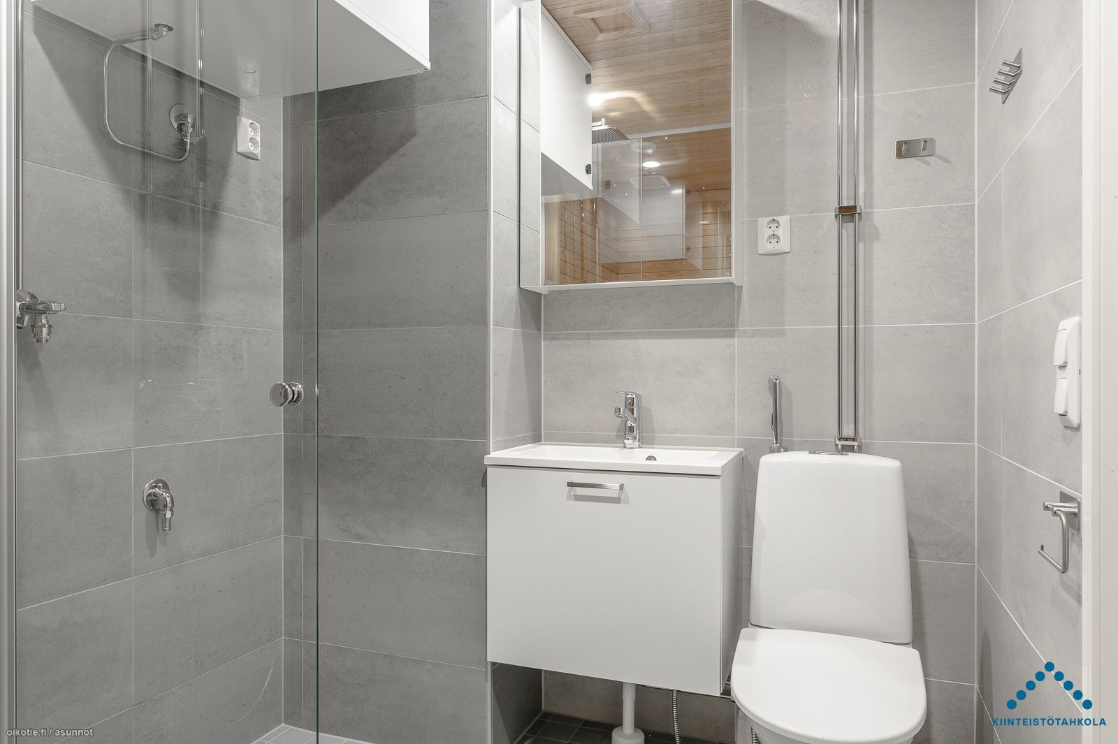 Asunnon oleskelutila on helppo kalustaa moneen makuun sopivaksi. Puustellin kalusteet, laadukkaat kodinkoneet sekä lattialämmitys tekevät asumisesta nautinnollista. Tyyliä uuteen kotiisi tuo myös saunan lasiseinä ja sadesuihku.
