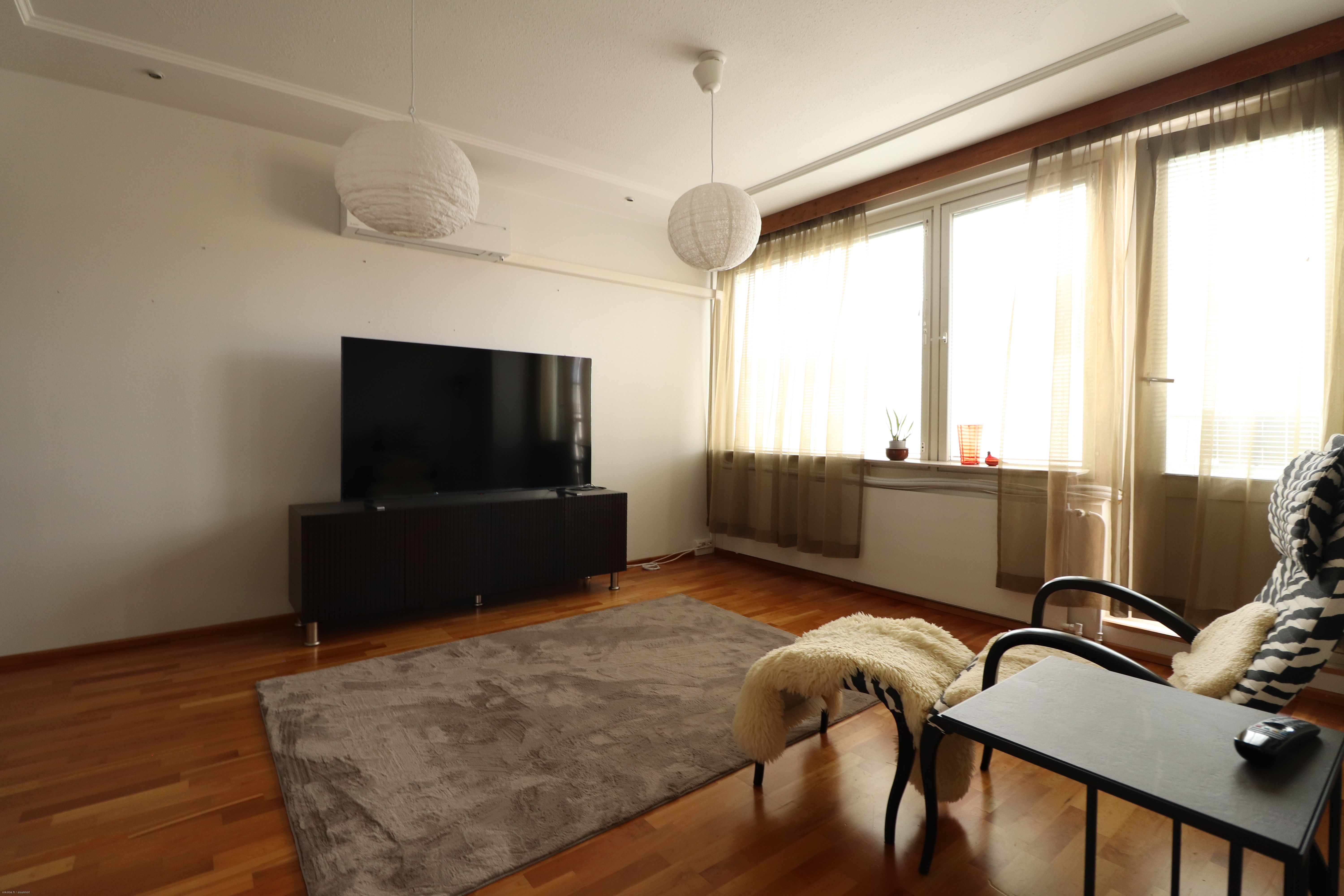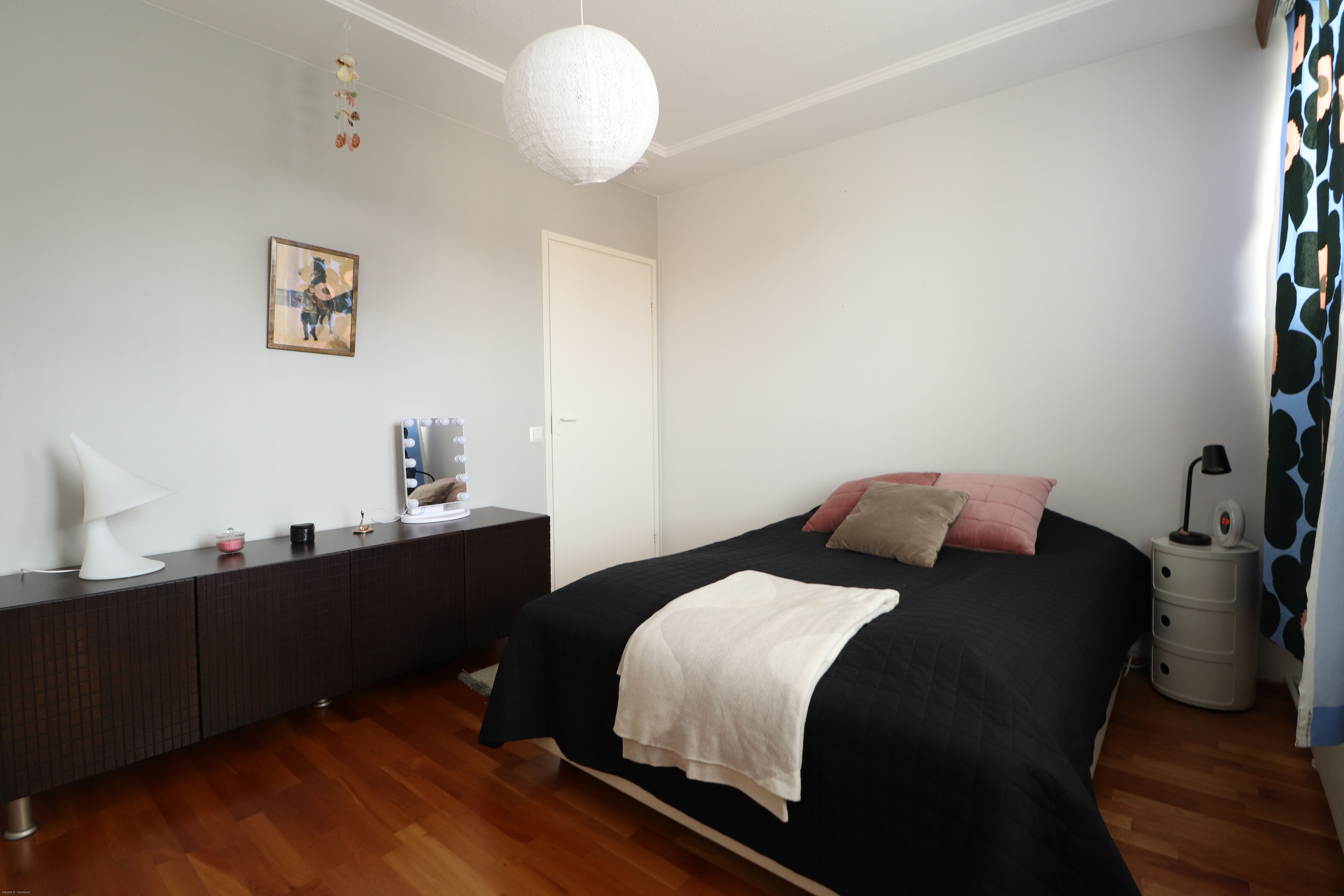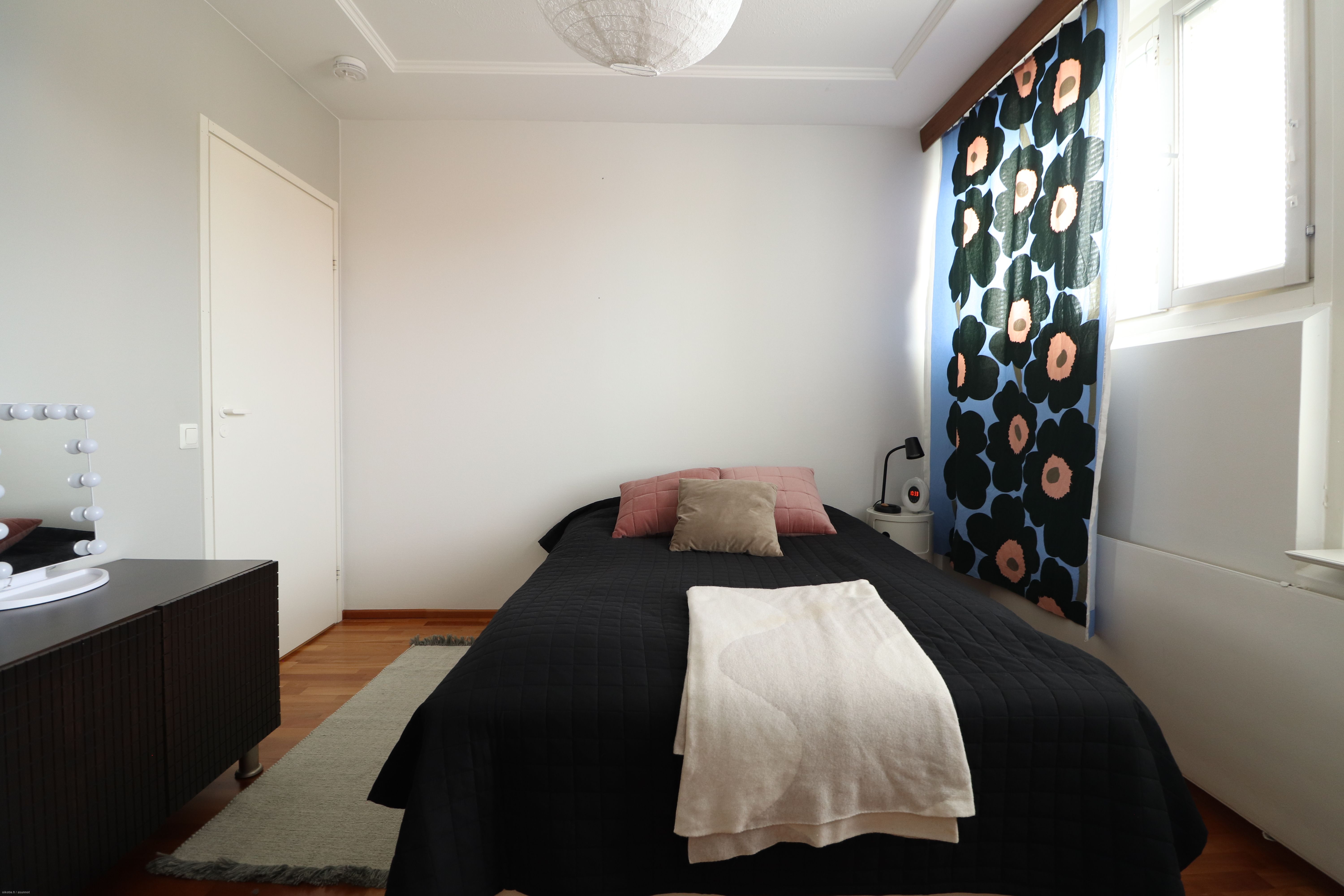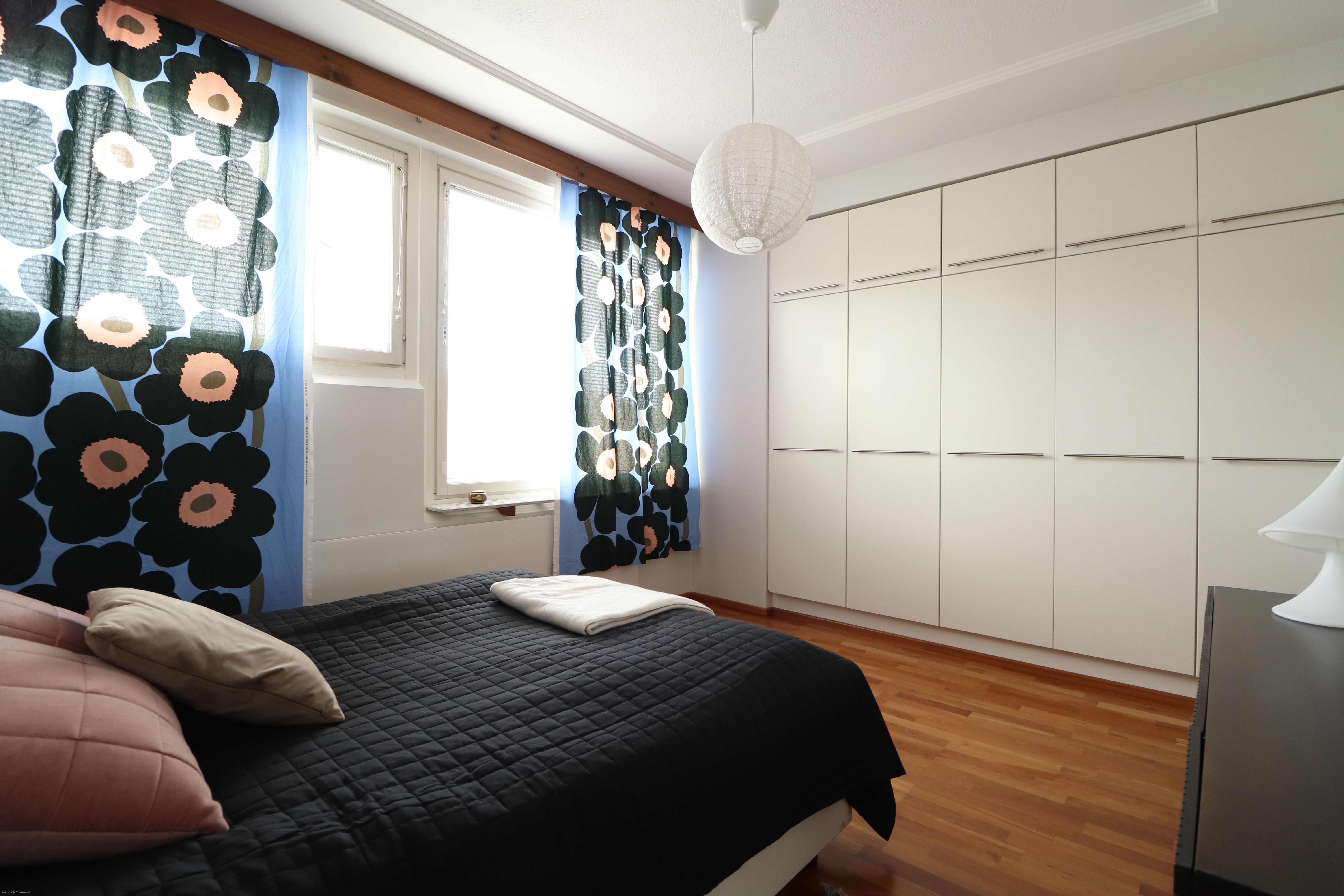 Isossa erillisessä keittiössä runsaasti kaappi- ja laskutilaa, ja valmiina löytyy jääkaappipakastin, uuni/liesi sekä astianpesukone. Kaakeloidusta siistikuntoisesta kylpyhuoneesta löytyy liitännät ja paikka pyykinpesukoneelle ja kuivausrummulle. Erillisessä makuuhuoneessa hyvin säilytystilaa koko seinustan mittaisten kaappien ansiosta. Omassa saunassa puolestaan rentoudut pitkien päivien päätteeksi! Ranskalaisen parvekkeen avulla saat mukavasti tuuletettua asuntoa. Asukkaiden käytettäväksi jää myös ilmalämpöpumppu.