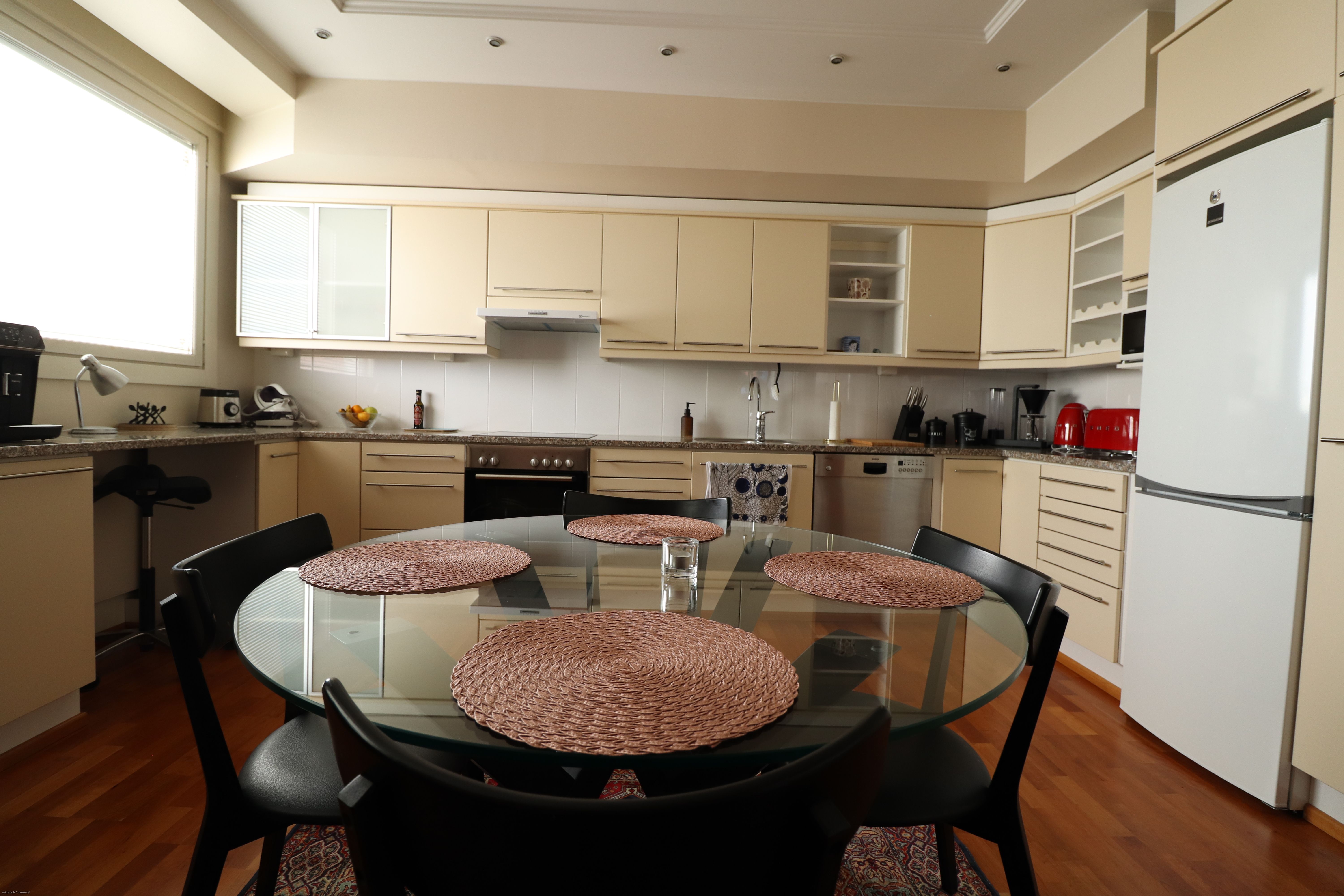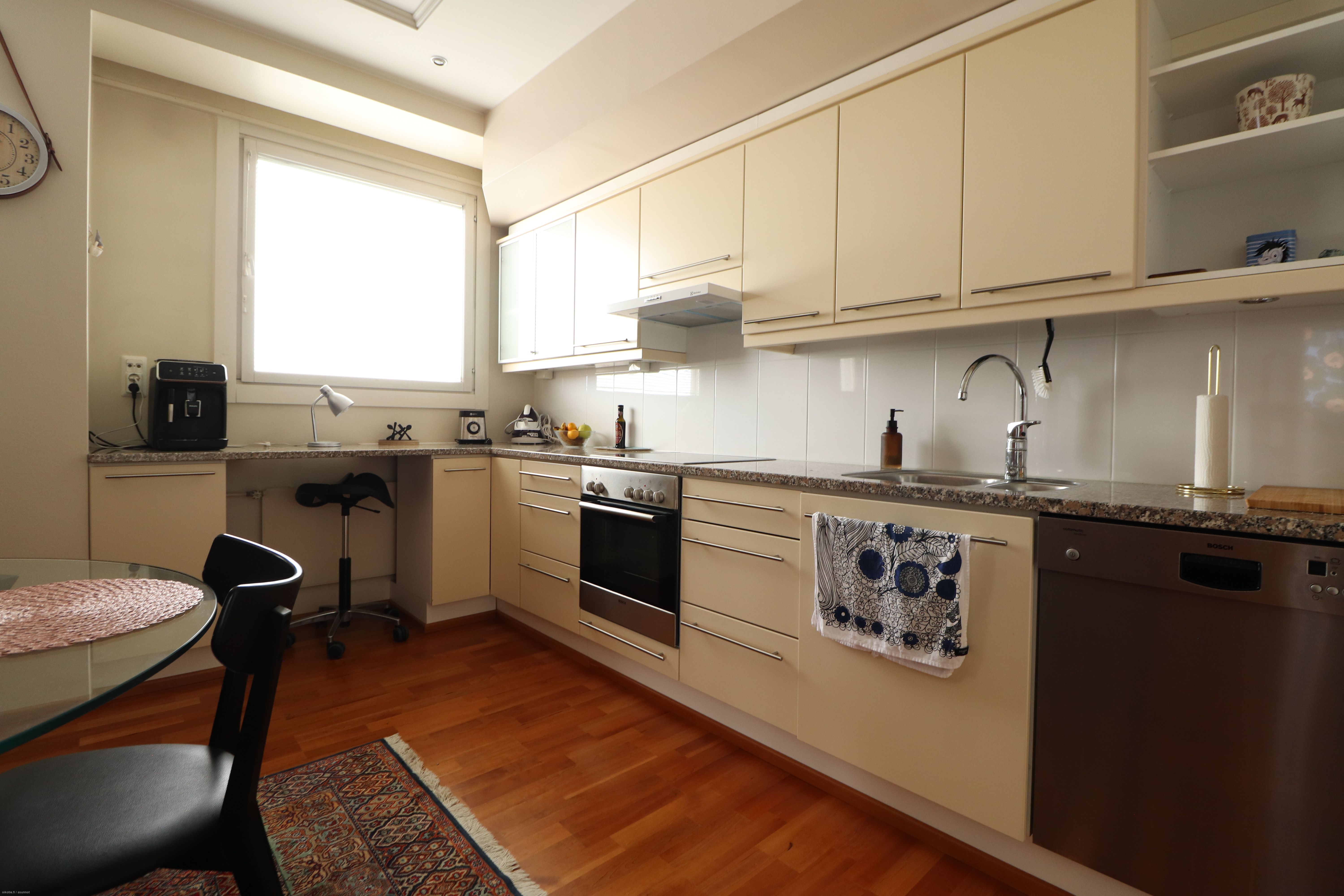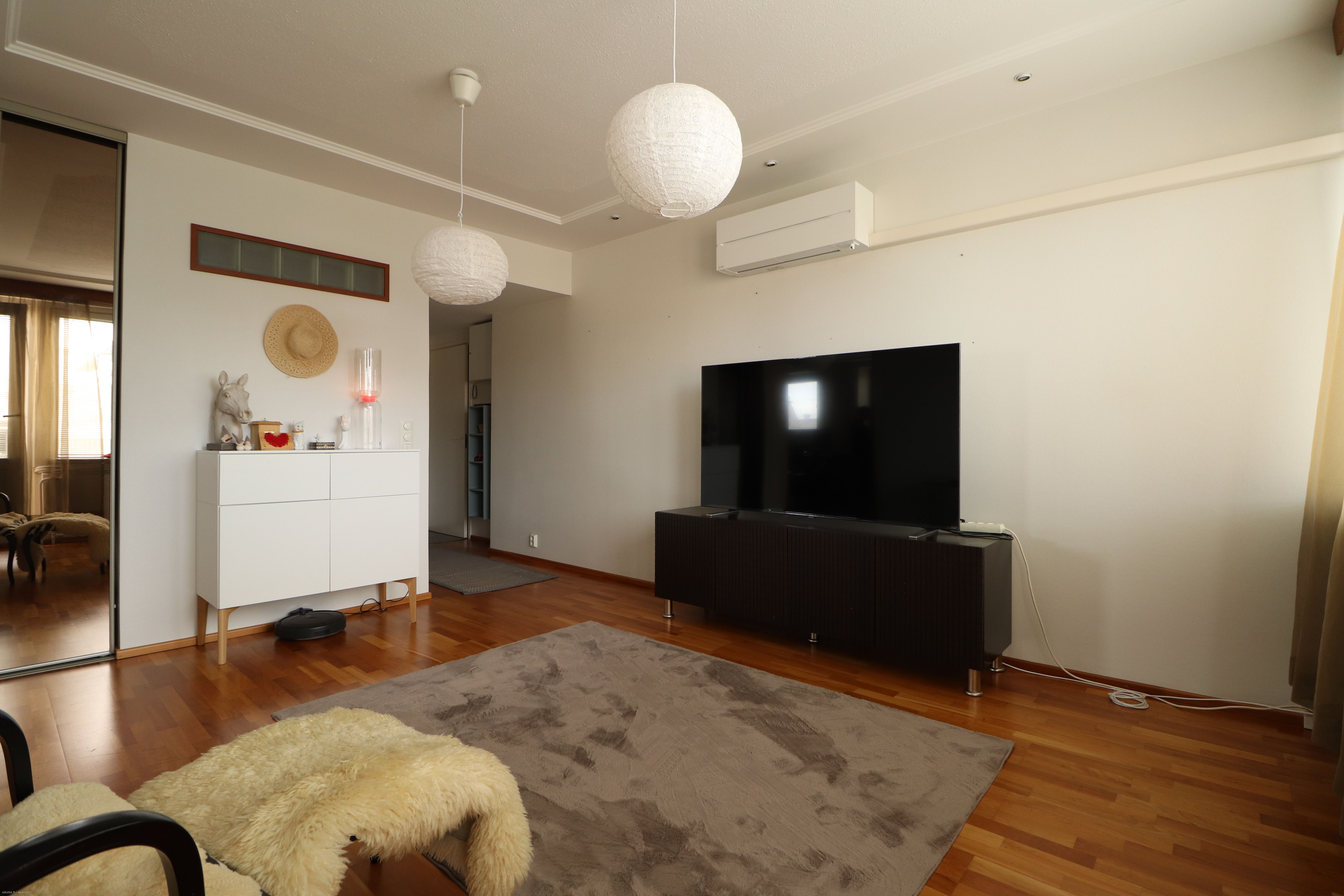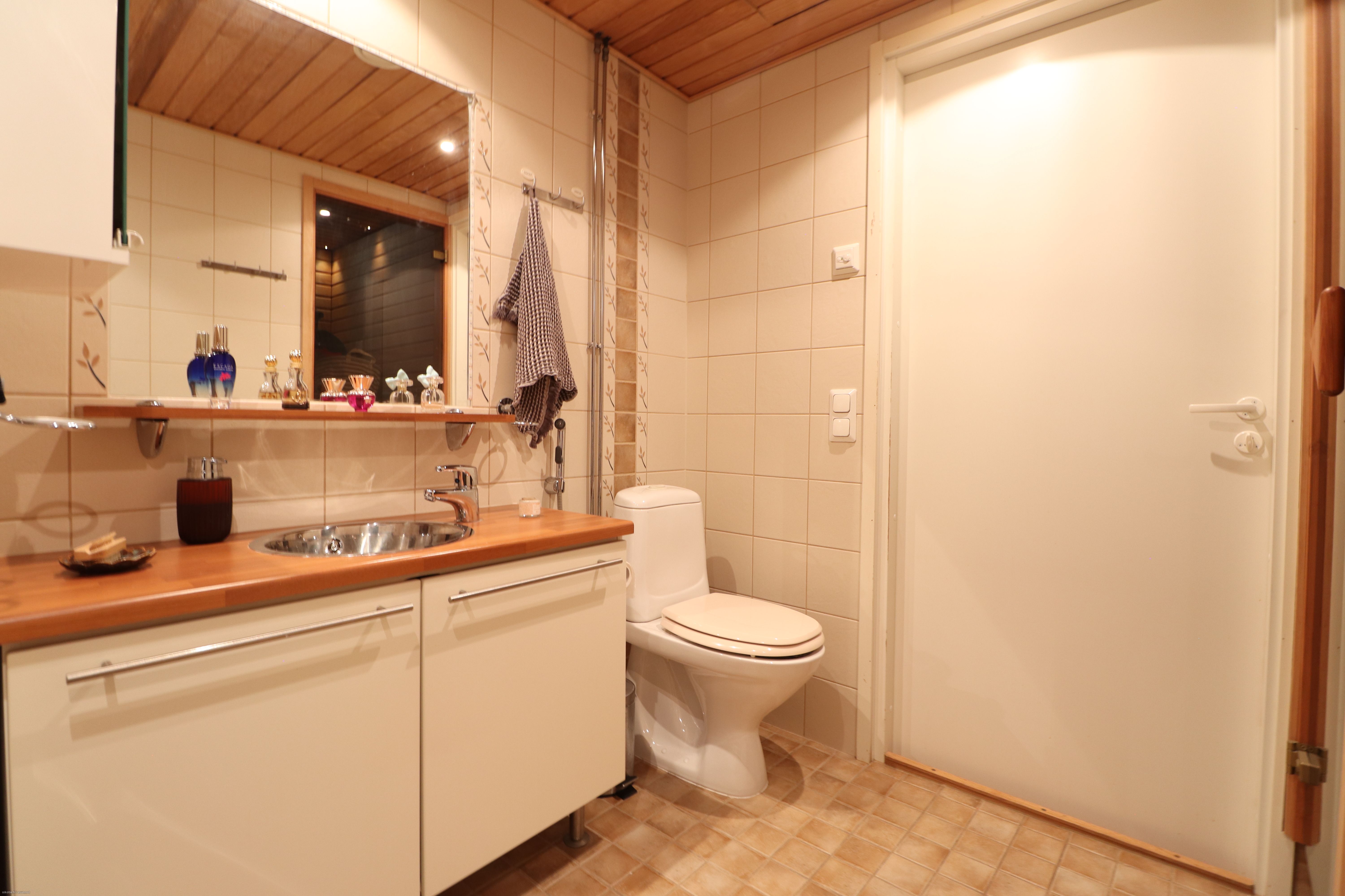 Isossa erillisessä keittiössä runsaasti kaappi- ja laskutilaa, ja valmiina löytyy jääkaappipakastin, uuni/liesi sekä astianpesukone. Kaakeloidusta siistikuntoisesta kylpyhuoneesta löytyy liitännät ja paikka pyykinpesukoneelle ja kuivausrummulle. Erillisessä makuuhuoneessa hyvin säilytystilaa koko seinustan mittaisten kaappien ansiosta. Omassa saunassa puolestaan rentoudut pitkien päivien päätteeksi! Ranskalaisen parvekkeen avulla saat mukavasti tuuletettua asuntoa. Asukkaiden käytettäväksi jää myös ilmalämpöpumppu.