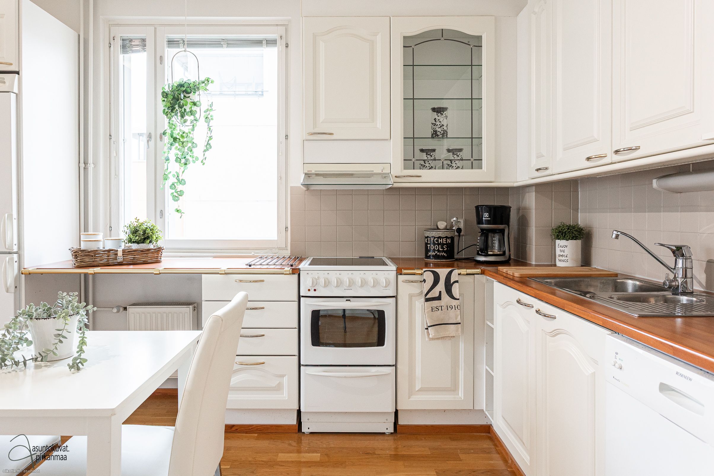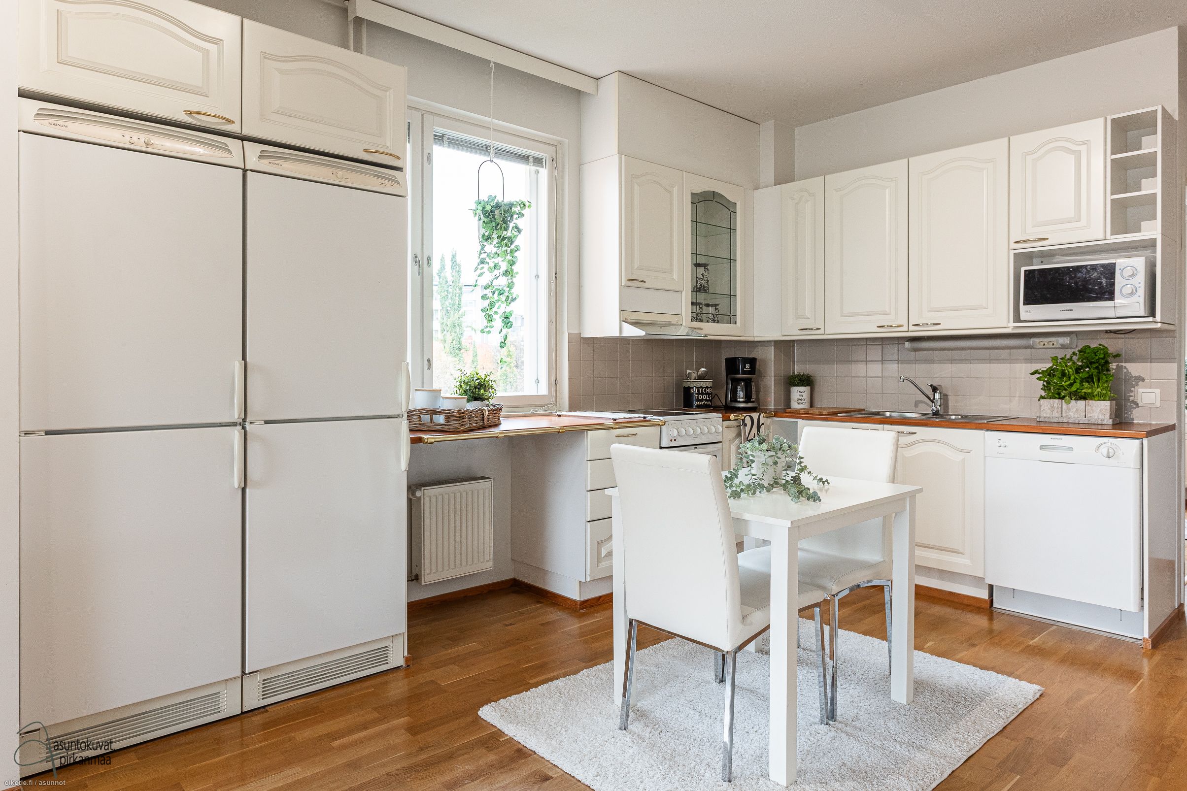 | Keittiön varusteet | Varusteet: Jääkaappi, Pakastin, Astianpesukone. Työtaso: Laminaattitaso. Tilava avokeittiö olohuoneen jatkeena. Keittiön ruokailutilasta käynti lasitetulle parvekkeelle. Ruokailutila: Tilava ruokailutila avokeittiön ja olohuoneen välissä, käynti lasitettulle parvekkeelle. |