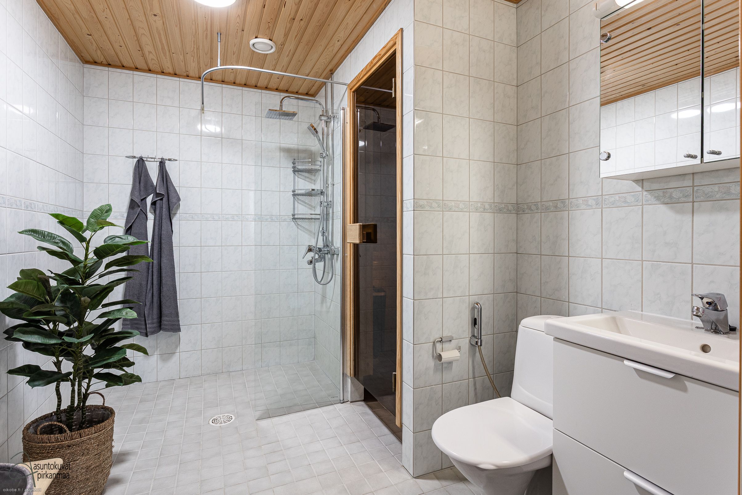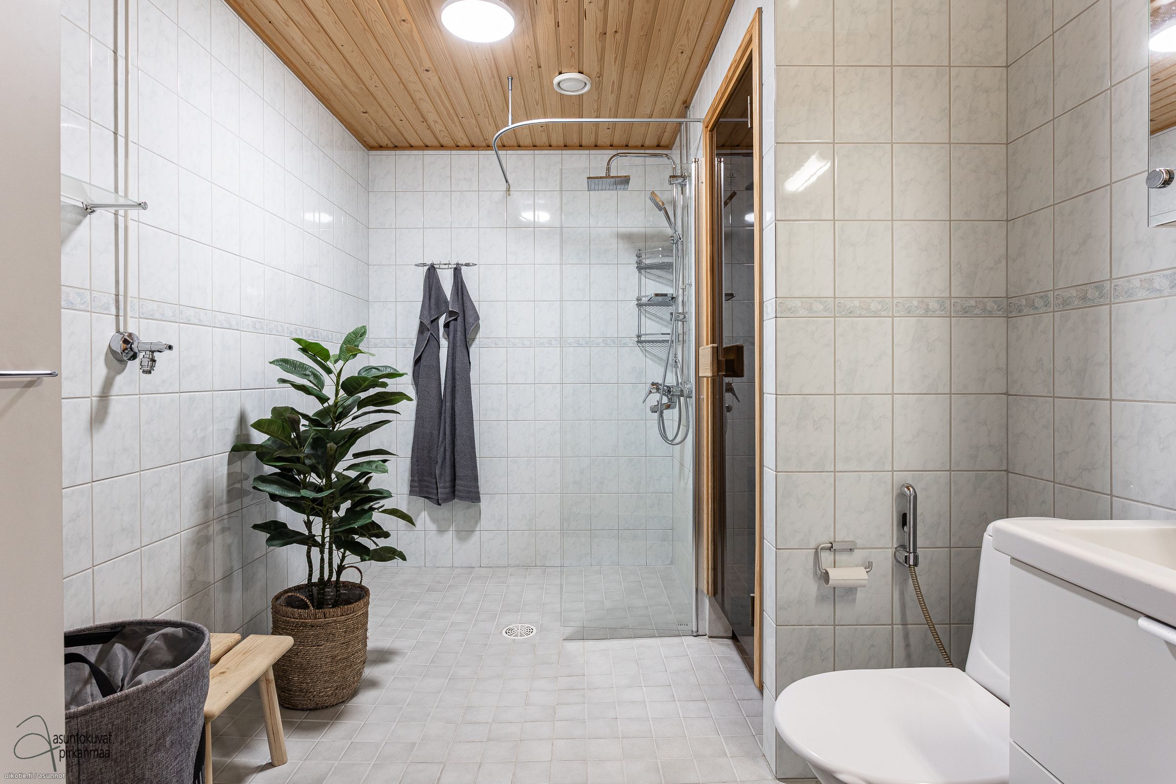 | Kylpyhuoneen varusteet | Tilava, siisti, laatoitettu kylpyhuoneosasto, josta käynti saunaan. WC. Sadesuihku, pesukoneliitäntä. Peilikaappi ja kylpyhuonekaapistot. Lattialämmitys. WC: Erillinen WC, laattalattia, WC-allas, peilikaappi ja kylpyhuonekaapisto. Erillisessä WC:ssä myös lattialämmitys. Toinen WC kylpyhuonetiloissa. |