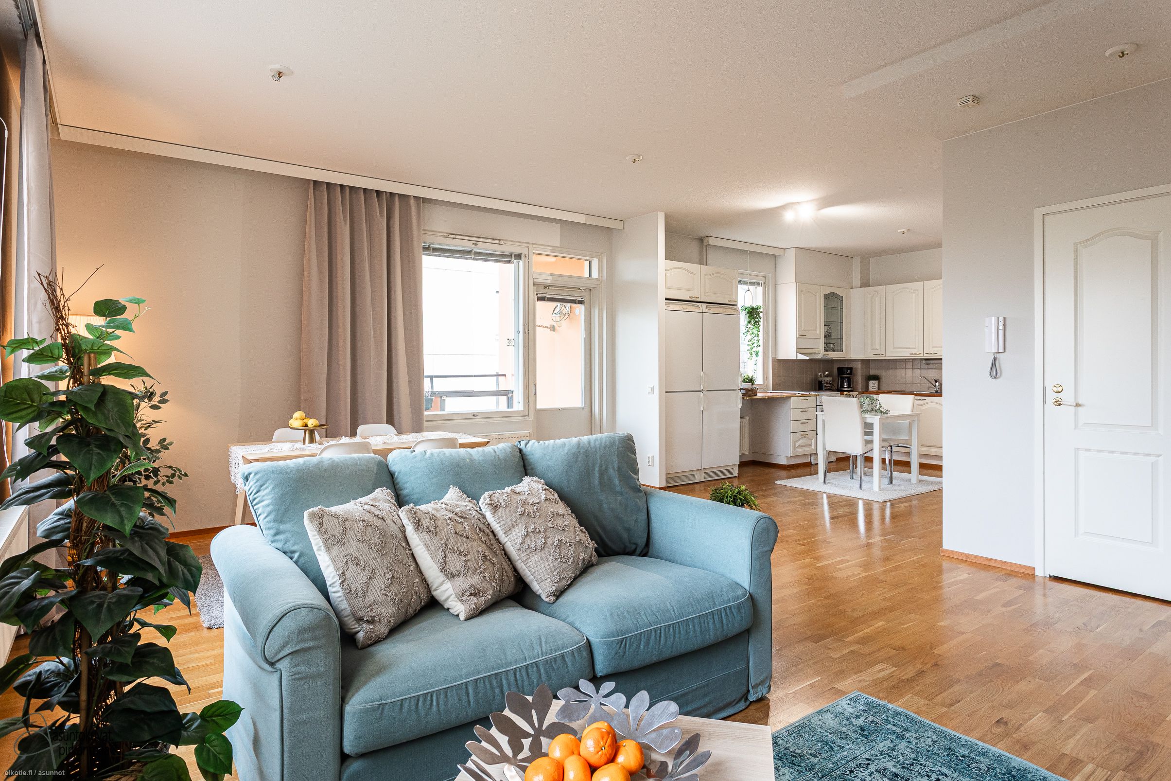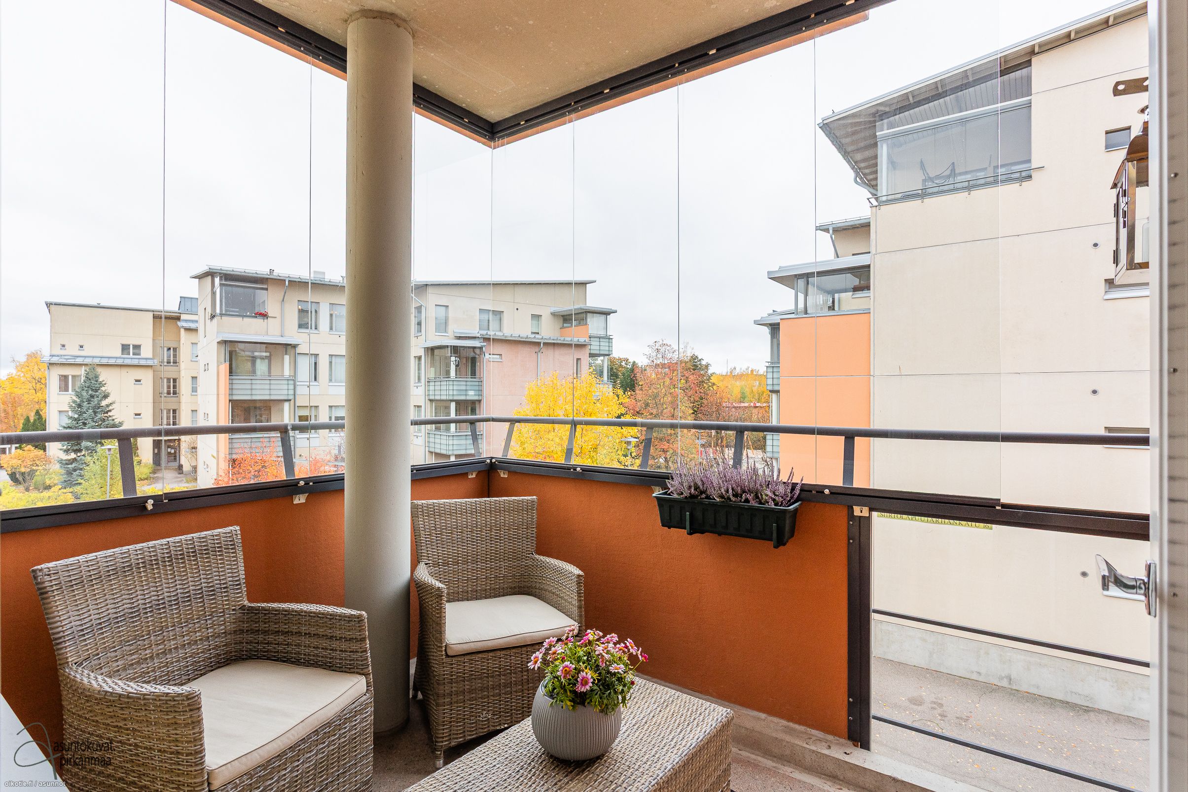 Tilava avokeittiö yhdistyy olohuoneeseen, ja tilava, lasitettu parveke toimii mukavana kesähuoneena keväästä syksyyn. Molemmissa makuuhuoneissa on omat vaatehuoneet, ja tyylikäs kylpyhuone–saunaosasto sekä kaksi WC:tä tekevät arjesta helppoa ja mukavaa.