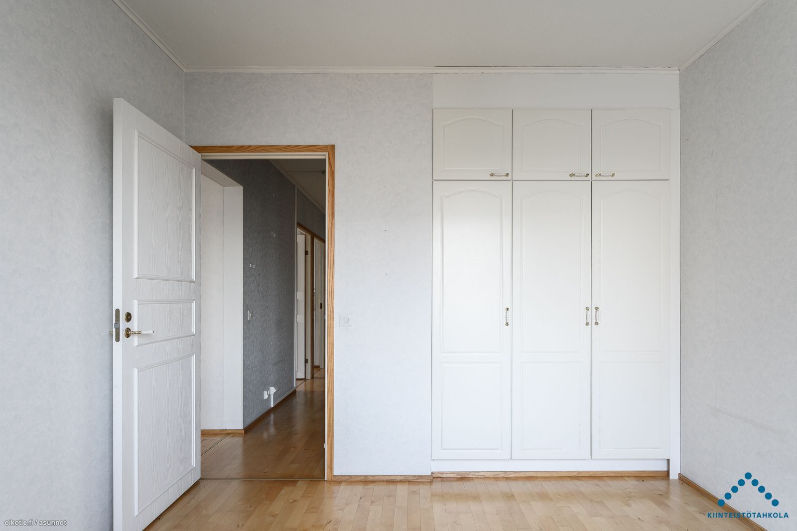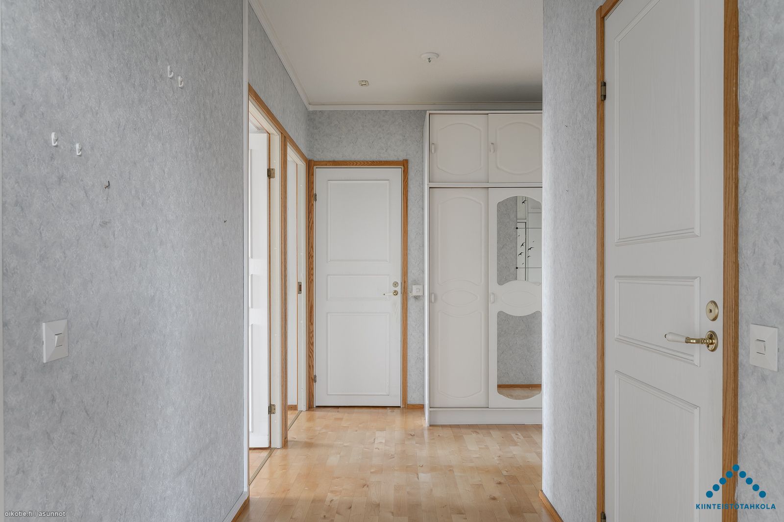 Kolmen huoneen, keittiön ja kylpyhuoneen muodostama pohjaratkaisu tarjoaa hyvät puitteet perheen arkeen. Kaksi makuuhuonetta antavat tilaa levätä ja työskennellä, kun taas avara olohuone ja erillinen keittiö luovat perinteisen kodikkaan vaikutelman. Tilava eteinen liukuovikaapistoineen sekä erillinen vaatehuone takaavat säilytystilan riittävyyden. Kylpyhuoneessa on suihkuverholla erotettava suihkutila sekä toisessa päässä kylpyhuonetta varaus pyykinpesukoneelle liitäntöineen.