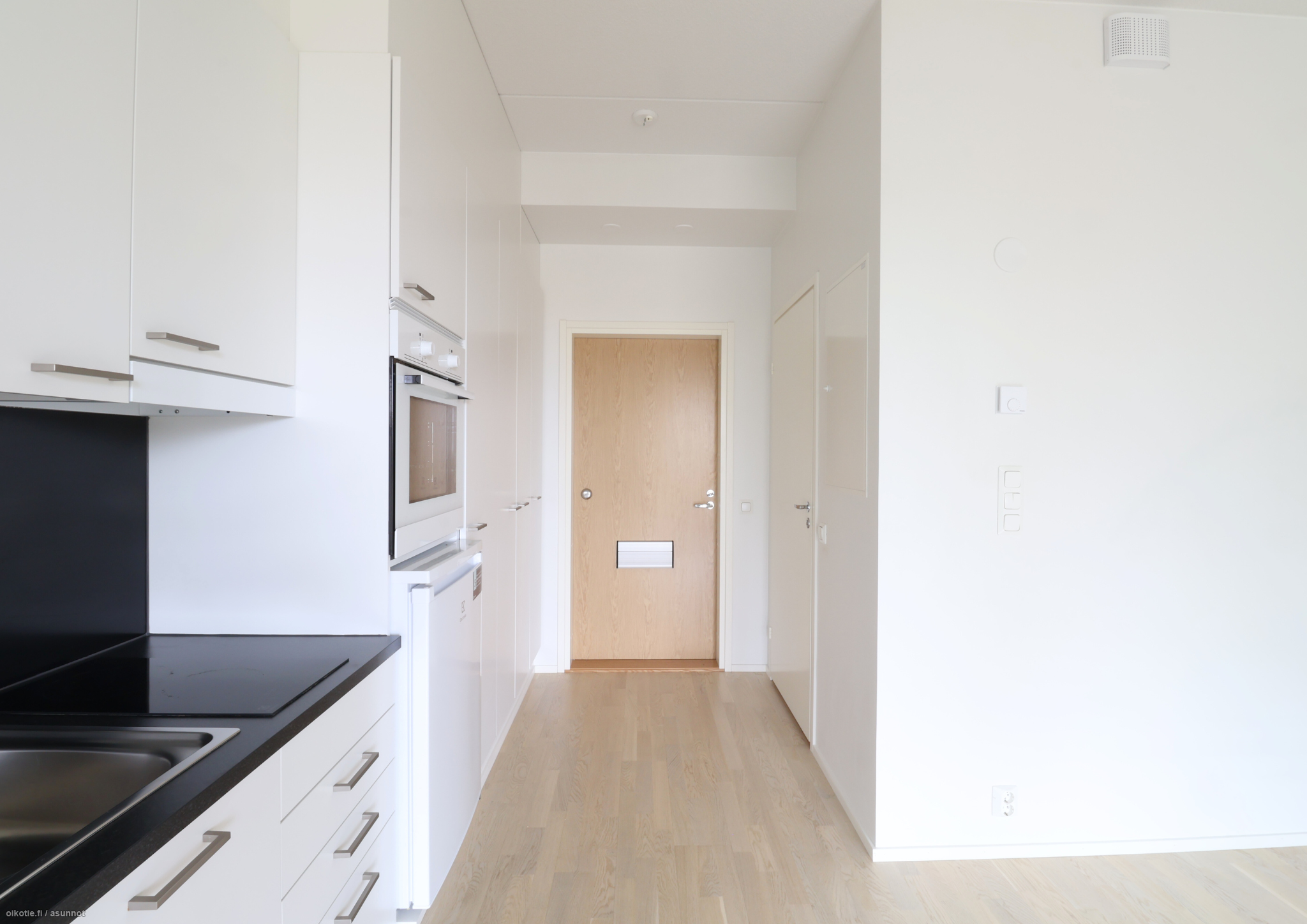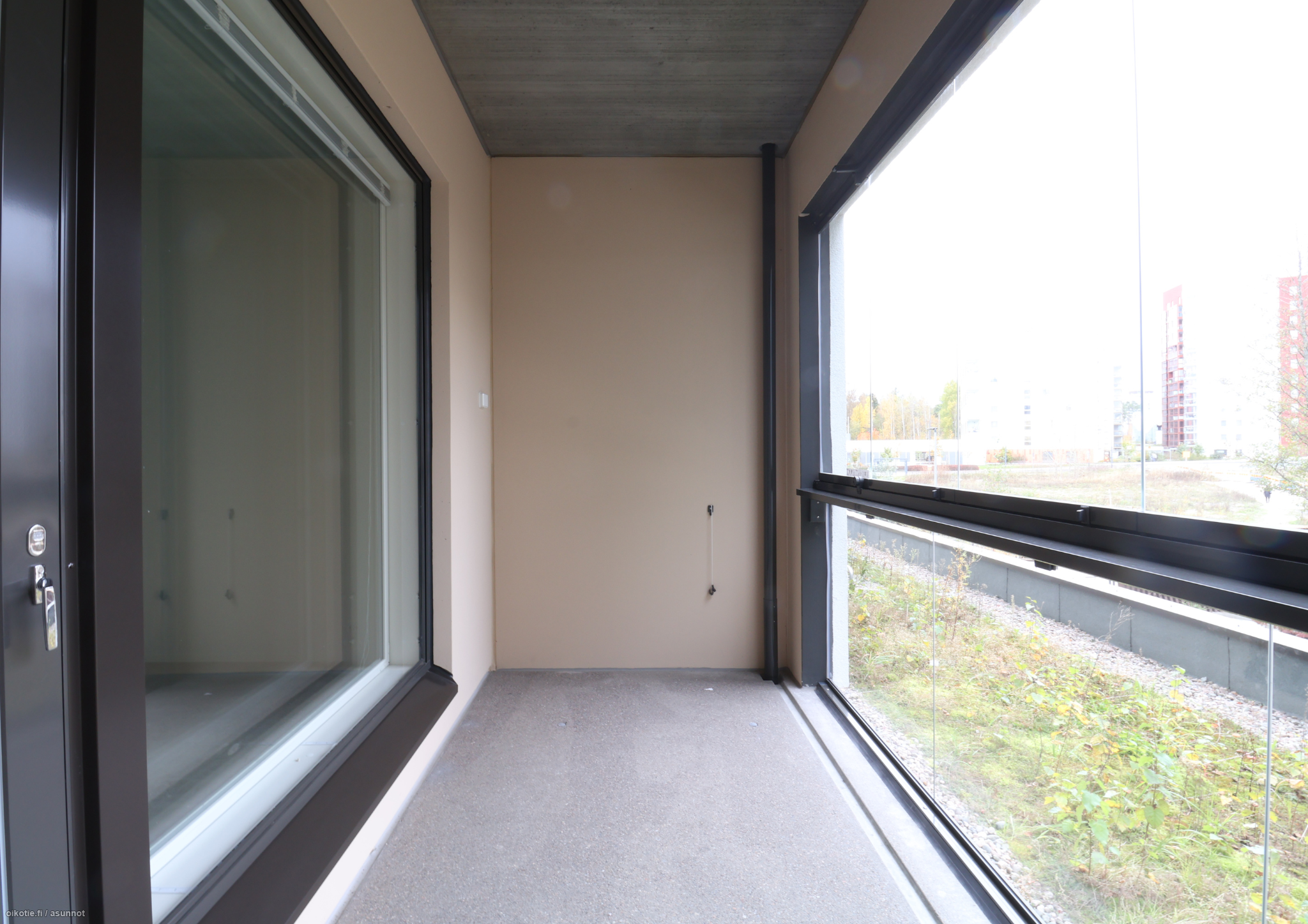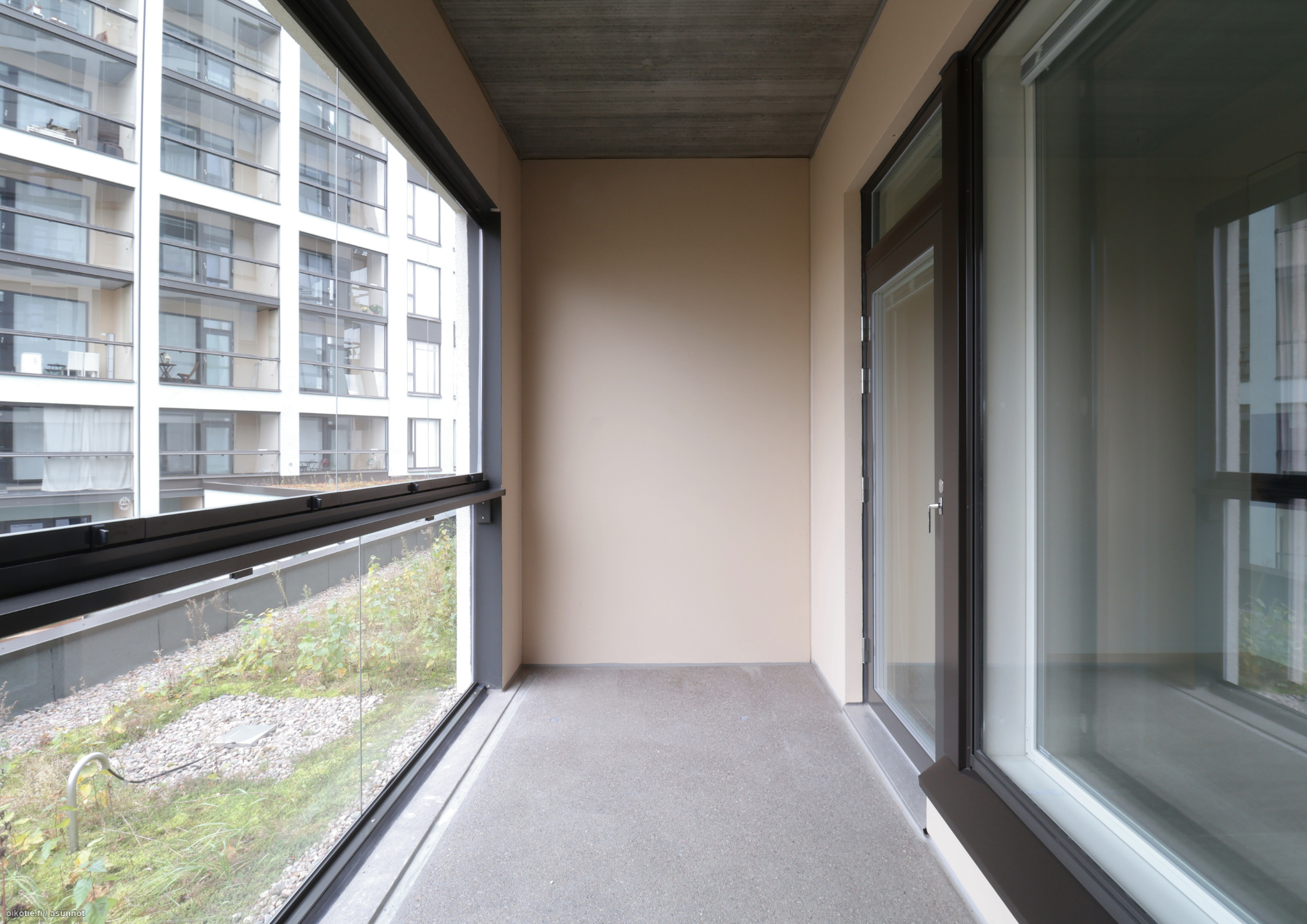 Tämä koti sijaitsee toisessa kerroksessa, ja suurten ikkunoiden ansiosta asuntoon tulvii runsaasti luonnonvaloa. Asunnon kruununa toimii valtava lasitettu parveke. Normaalia korkeampi huonekorkeus ja isot ikkunat tekevät tästä asunnosta todella avaran. Keittiön kodinkoneisiin lukeutuu liesitaso, kalusteeseen upotettu erillisuuni, astianpesukone sekä jääkaappi. Tilavassa kylpyhuoneessa on tilavaraus ja liitännät pesutornille. Asunnon lattiat ovat laadukasta tammilautaparkettia ja lämmityksen hoitaa vesikiertoinen lattialämmitys, joka helpottaa sisustamista, sillä pattereita ei ole viemässä tilaa.