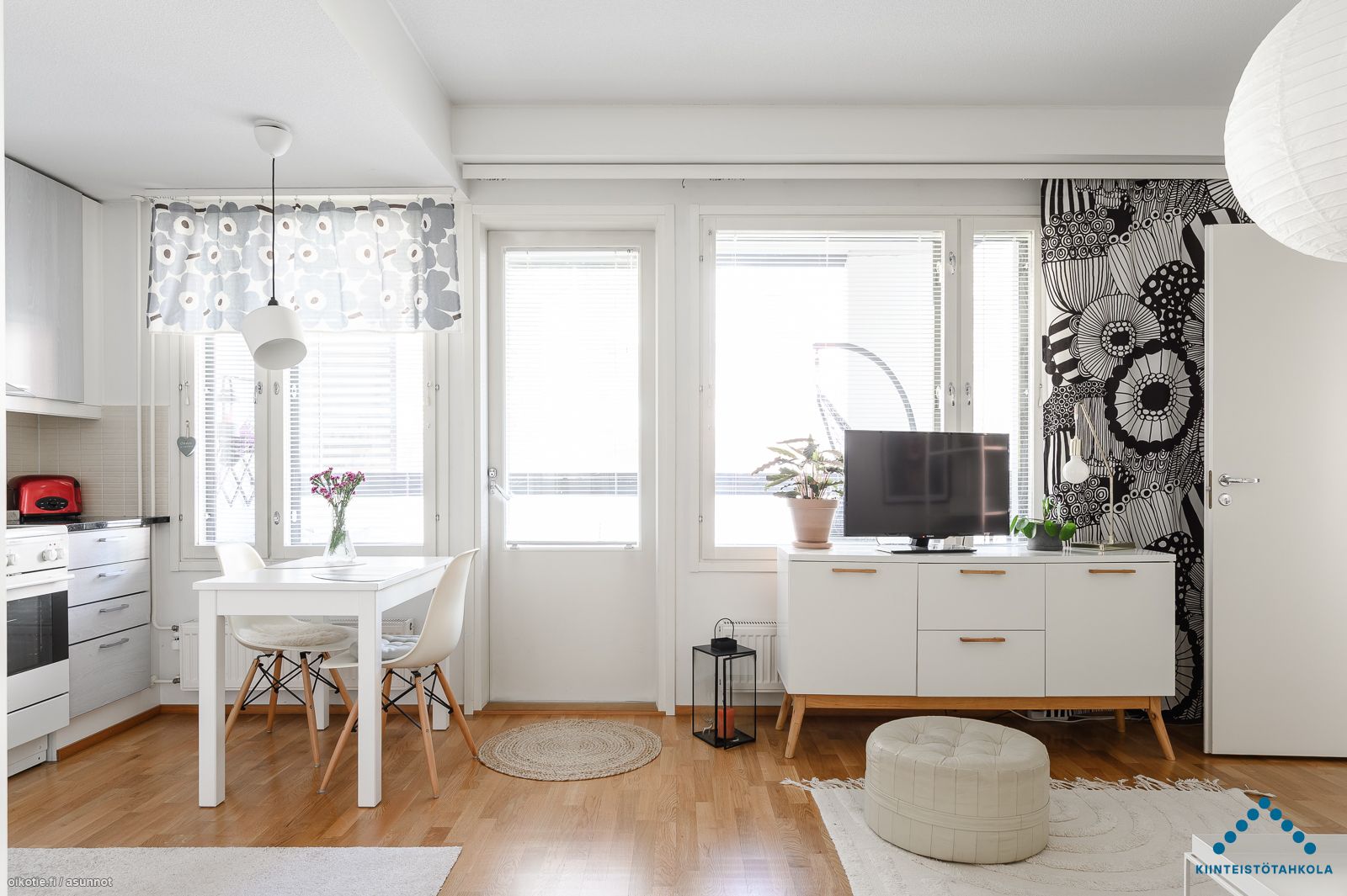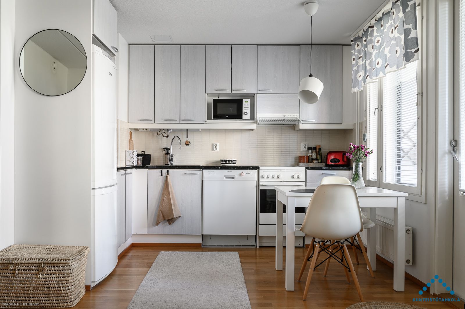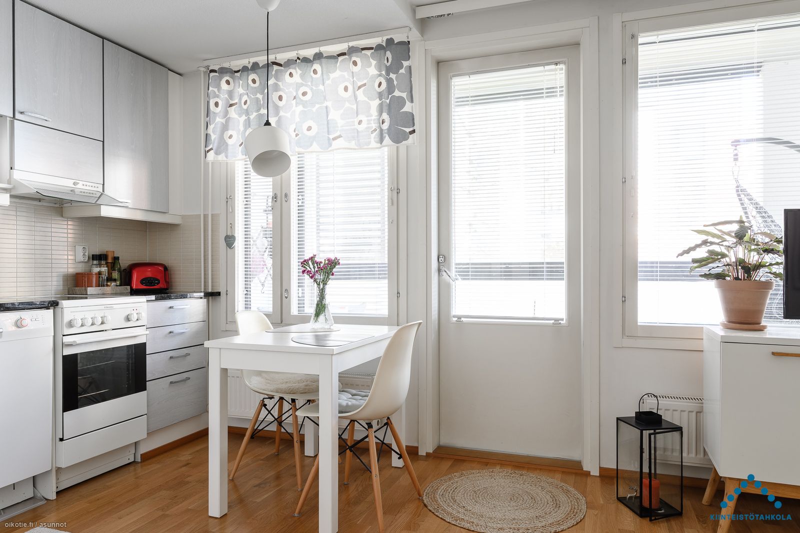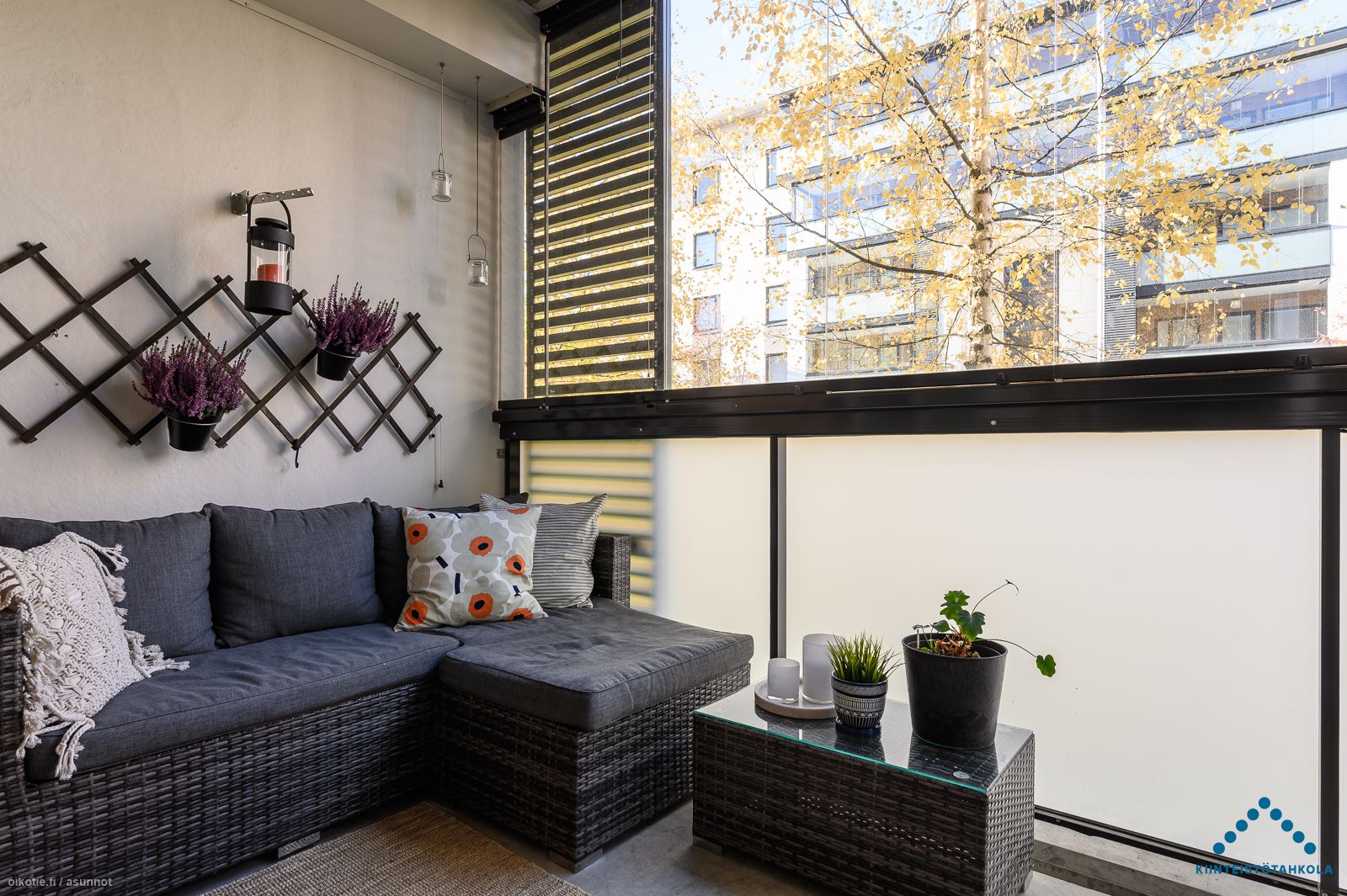 Hyväkuntoisessa asunnossa on parkettilattia ja vaaleaksi maalatut seinät. Keittiökalusteet ovat ajattoman väriset ja työtasoina laadukkaat kivitasot. Huoneistossa on erillinen kodinhoitotila, jossa myös toinen WC sekä liitännät pyykinpesukoneelle. Oma sauna ja tilava lasitettu parveke täydentävät miellyttävän kokonaisuuden.