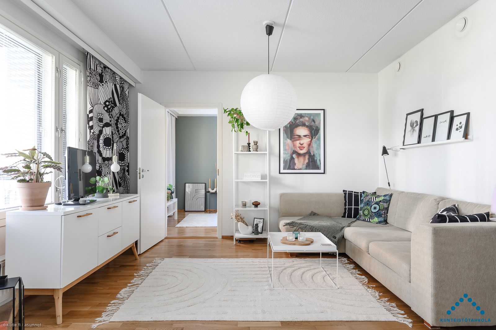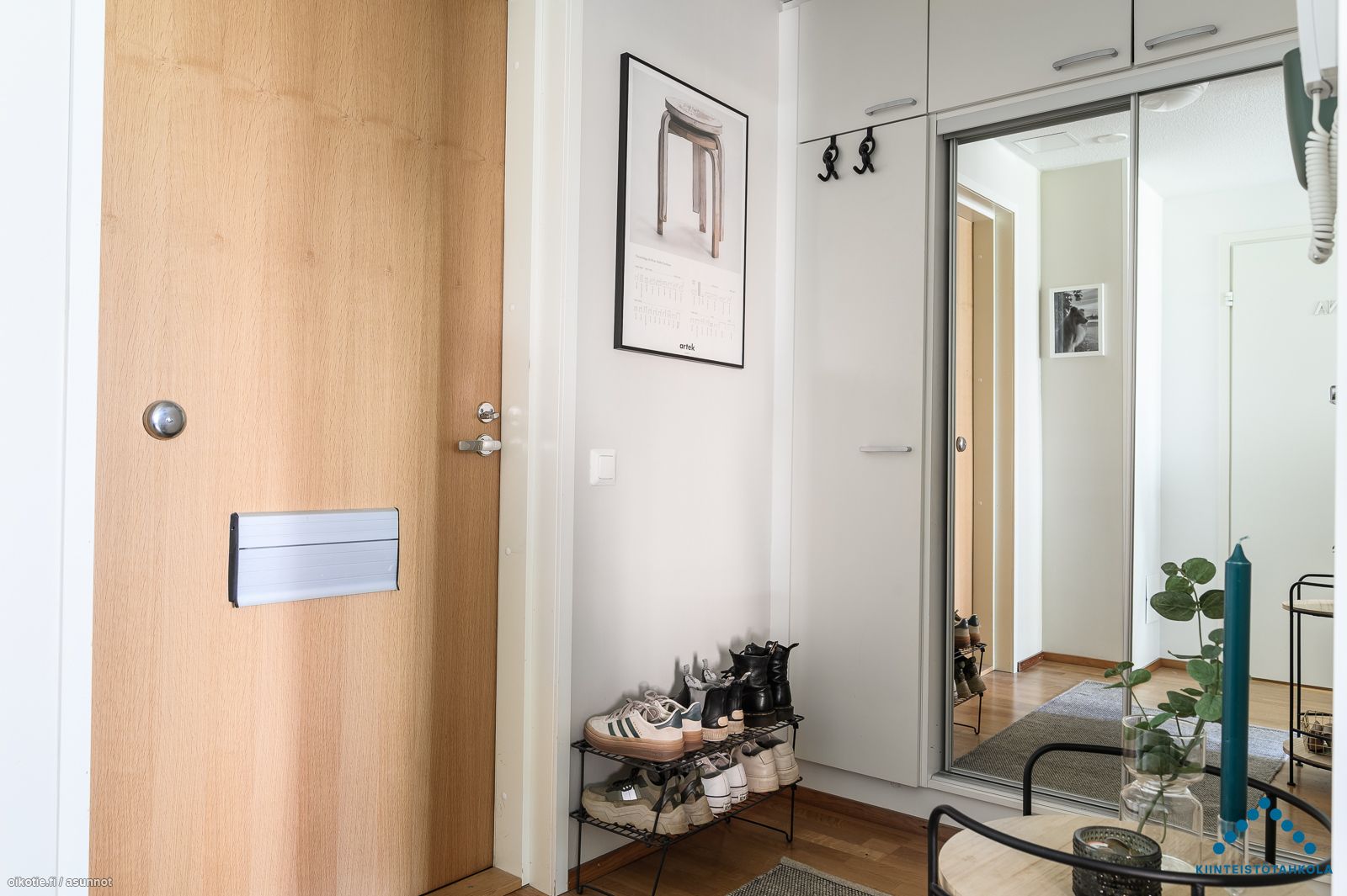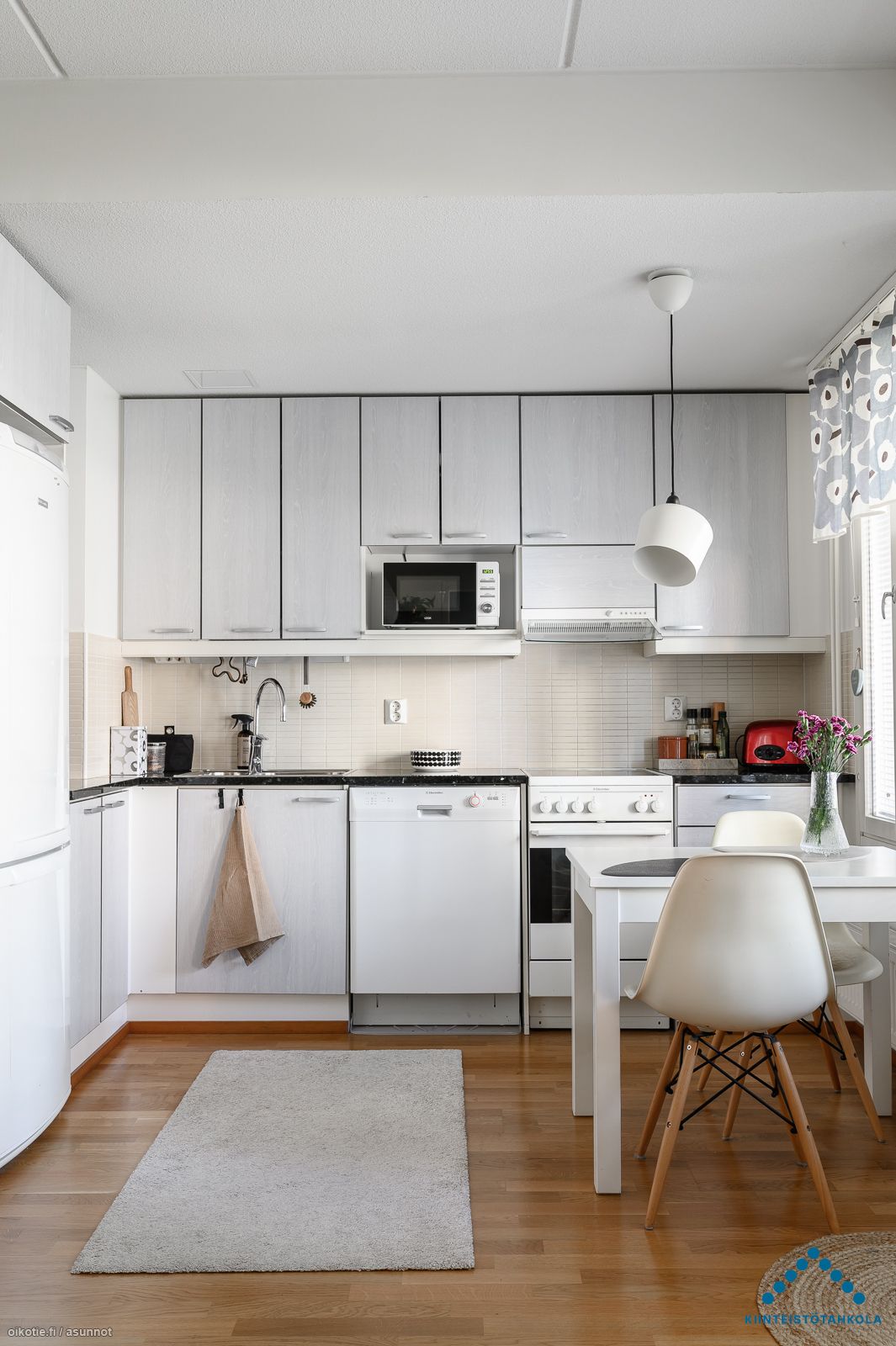 Hyväkuntoisessa asunnossa on parkettilattia ja vaaleaksi maalatut seinät. Keittiökalusteet ovat ajattoman väriset ja työtasoina laadukkaat kivitasot. Huoneistossa on erillinen kodinhoitotila, jossa myös toinen WC sekä liitännät pyykinpesukoneelle. Oma sauna ja tilava lasitettu parveke täydentävät miellyttävän kokonaisuuden.