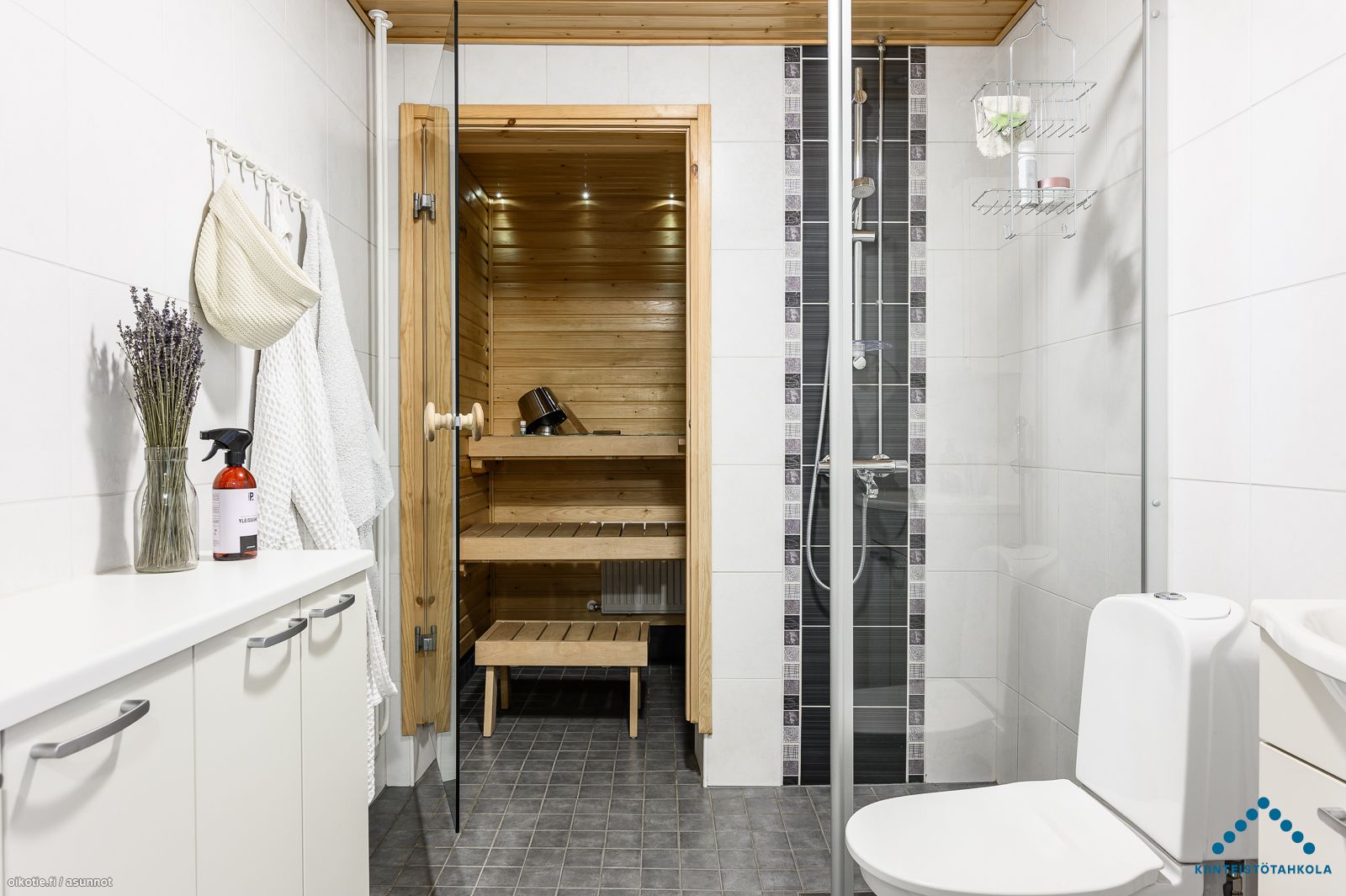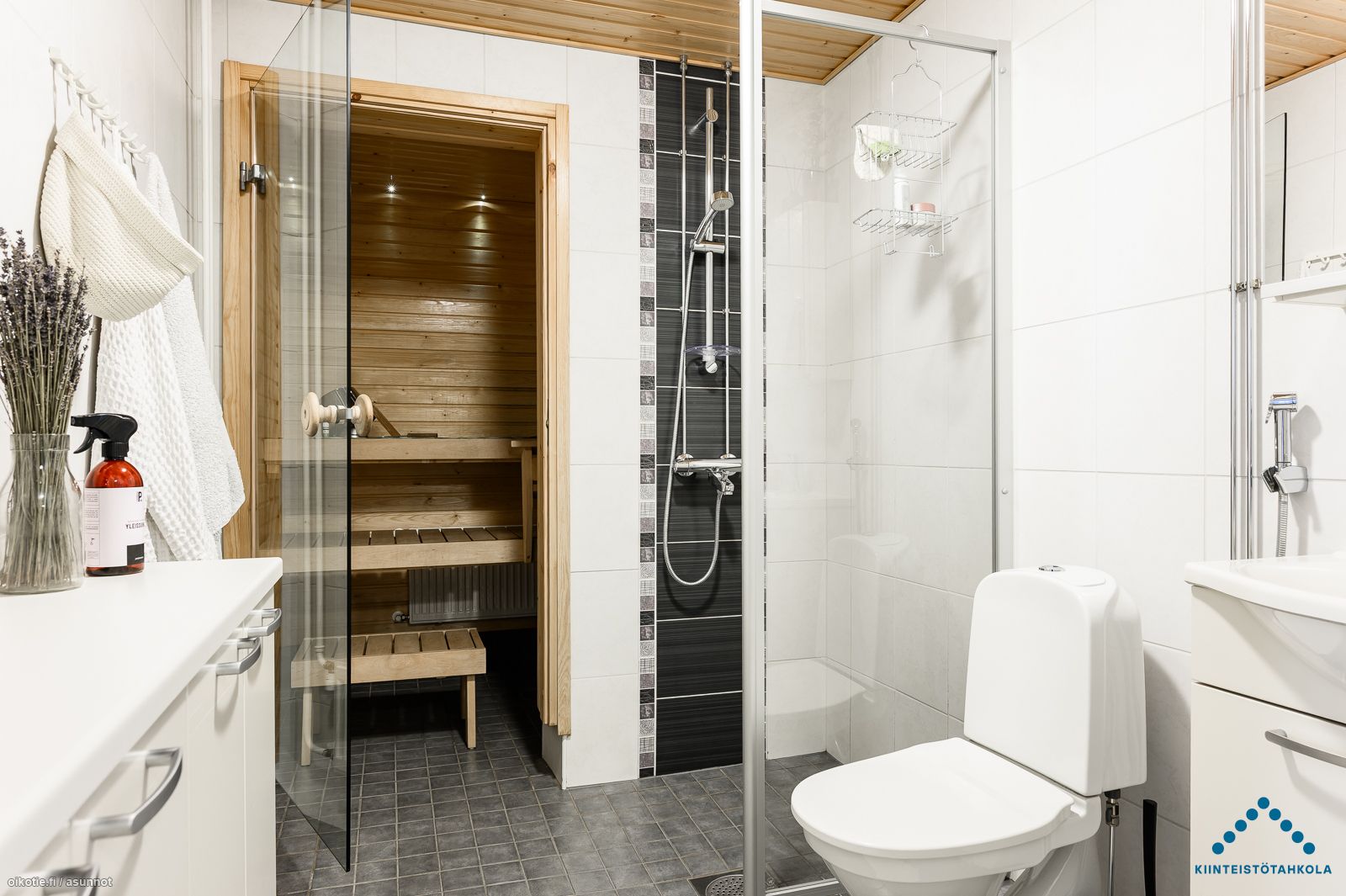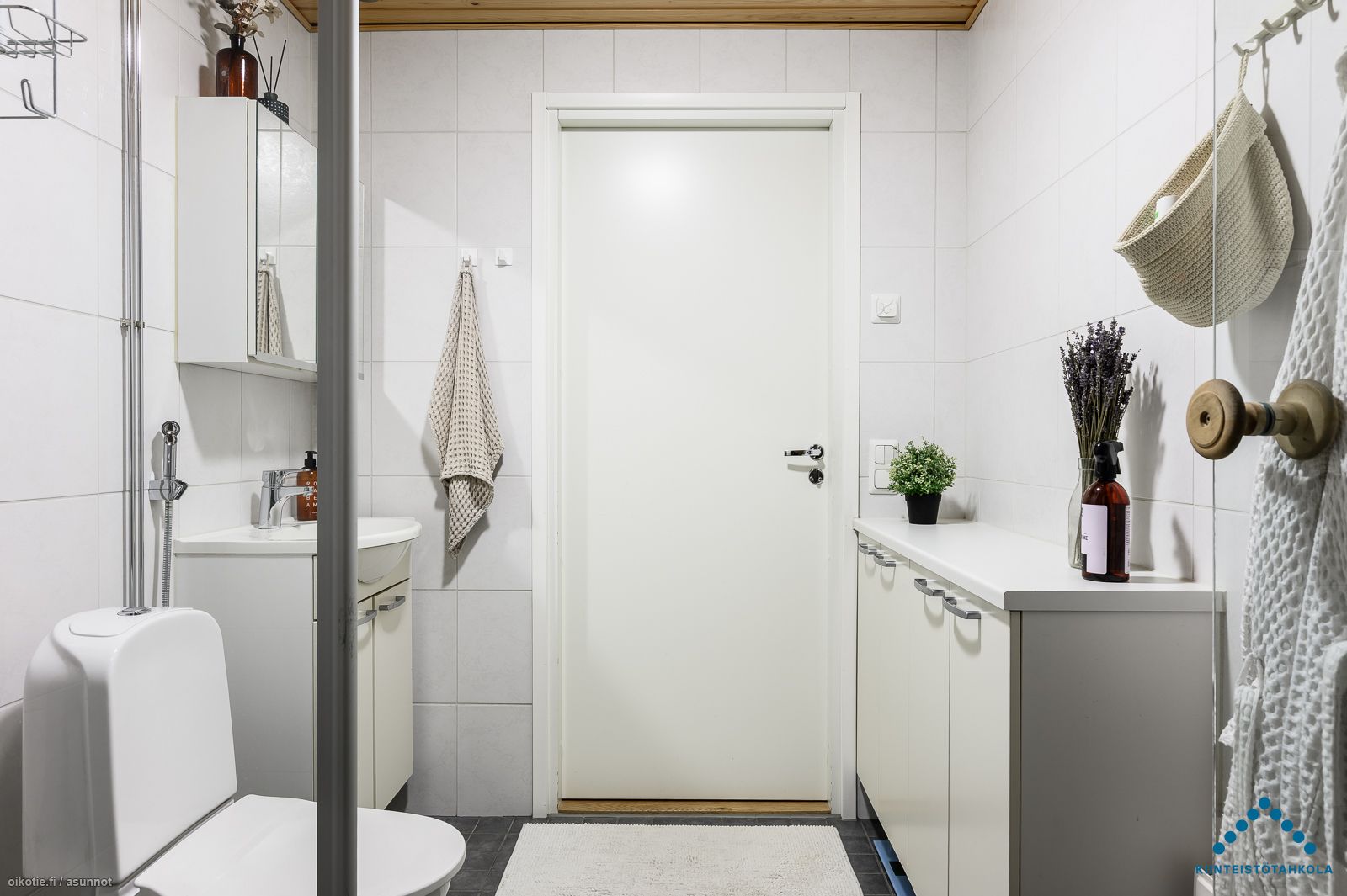 | Kylpyhuoneen varusteet | Varusteet: WC, Suihku, Suihkuseinä, Lattialämmitys, Kiinteät valaisimet, Peilikaappi, Kylpyhuonekaapistot. WC: Erillinen WC/kodinhoitotila. Varusteet: Lattialämmitys, Lattiakaivo, Peilikaappi, Pesukoneliitäntä |