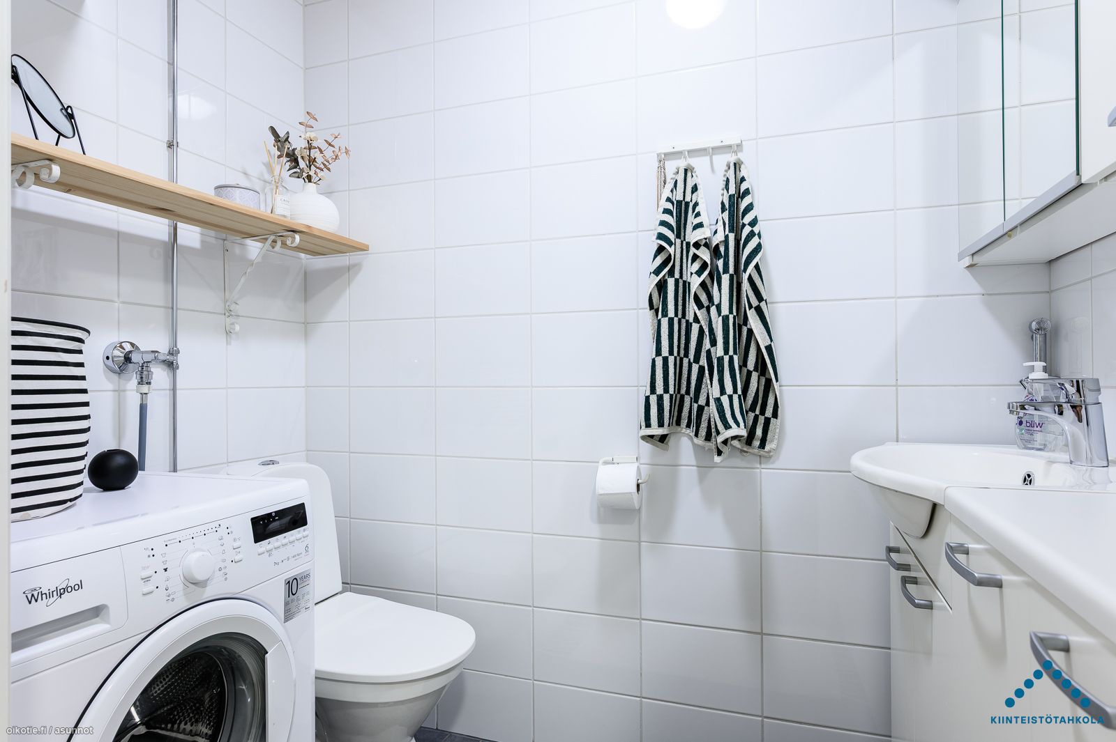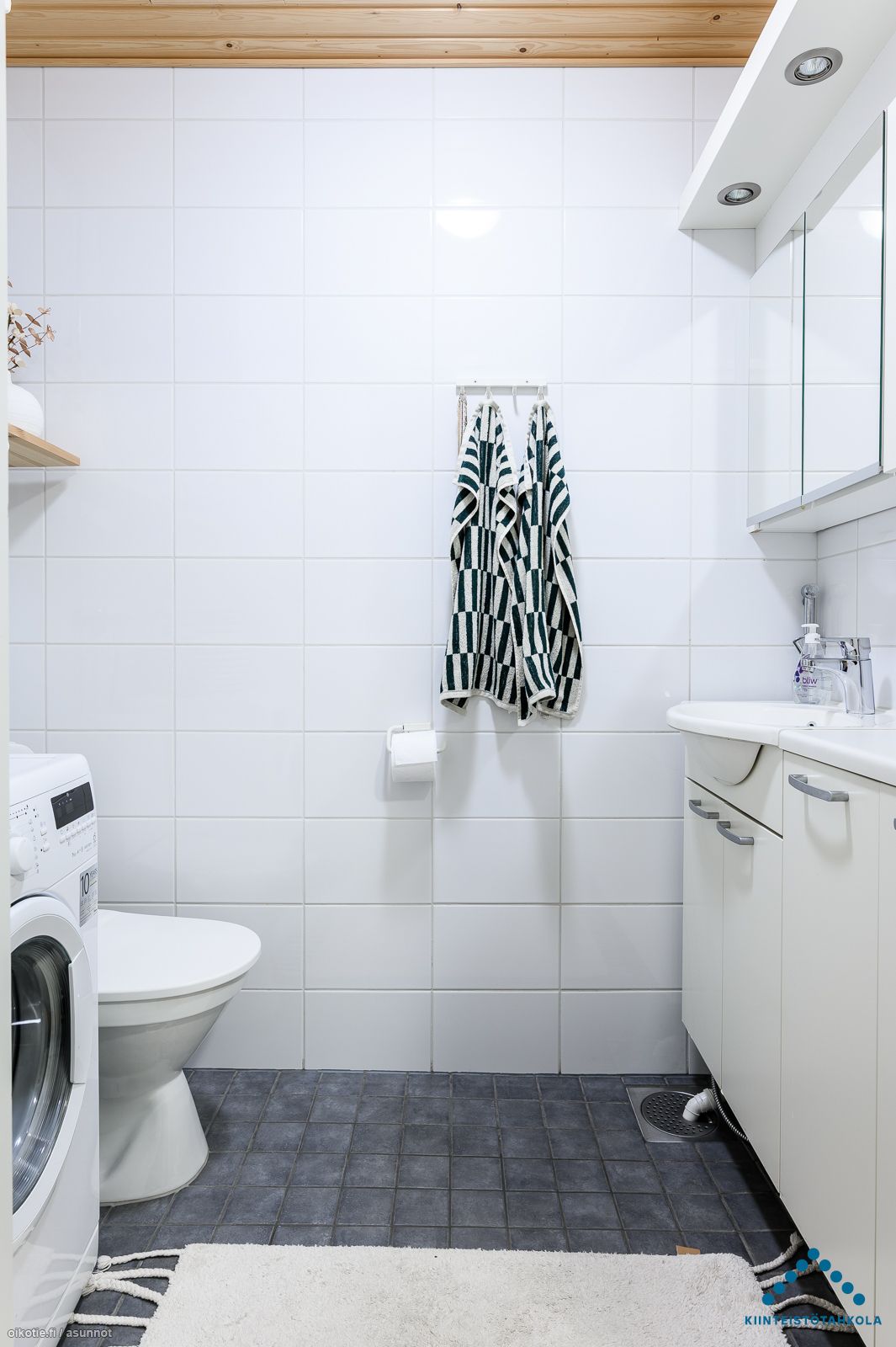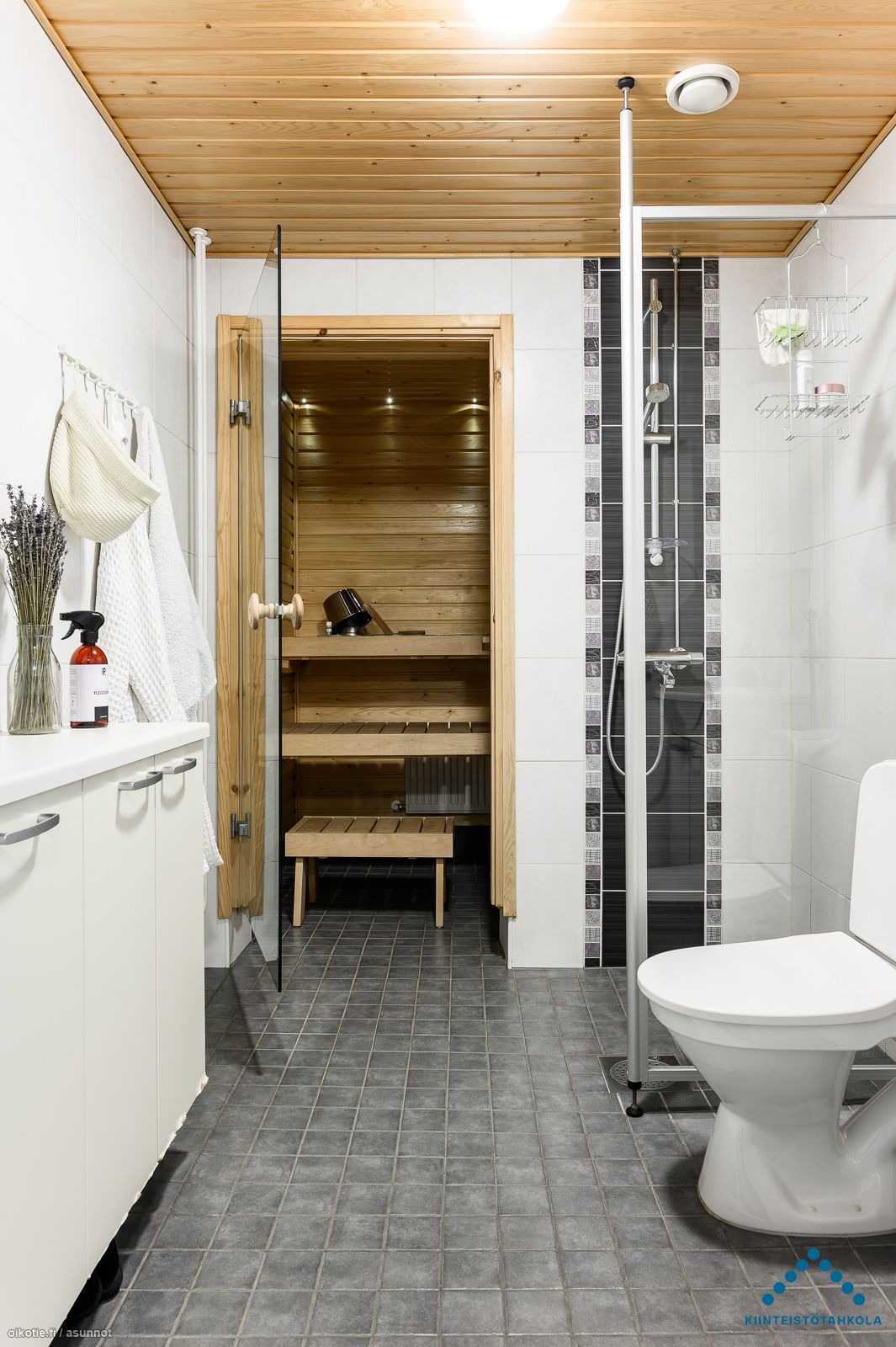 | Kylpyhuoneen varusteet | Varusteet: WC, Suihku, Suihkuseinä, Lattialämmitys, Kiinteät valaisimet, Peilikaappi, Kylpyhuonekaapistot. WC: Erillinen WC/kodinhoitotila. Varusteet: Lattialämmitys, Lattiakaivo, Peilikaappi, Pesukoneliitäntä |