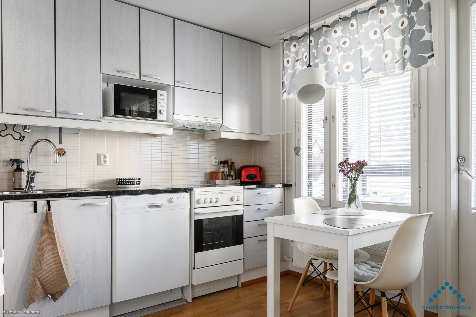 | Keittiön varusteet | Varusteet: Jääkaappipakastin, Astianpesukone. Työtaso: Kivitaso. Liesi: Keraaminen liesi. Siisti keittiö ja kalusteissa ajattomat värit, kivitasot |