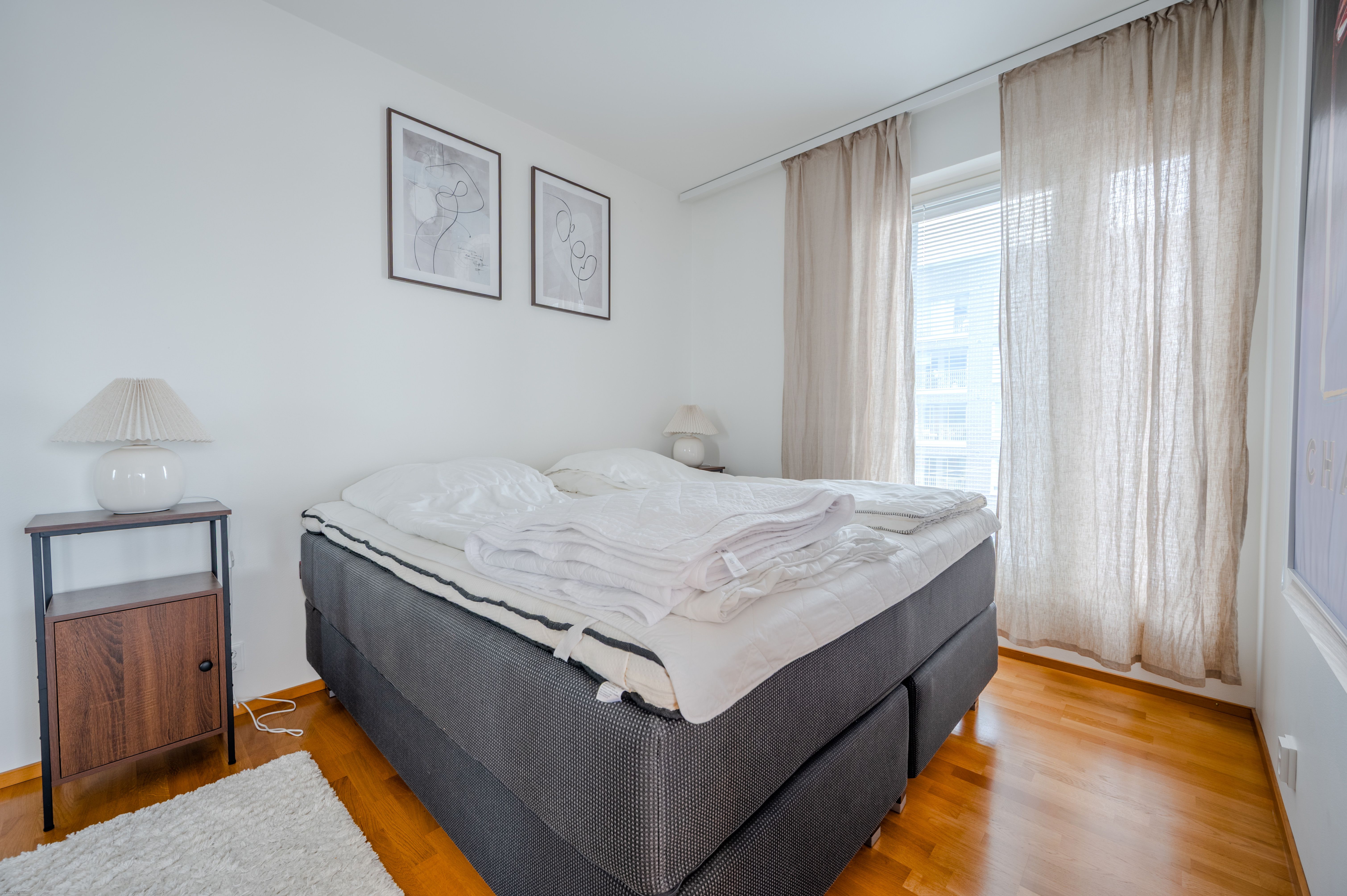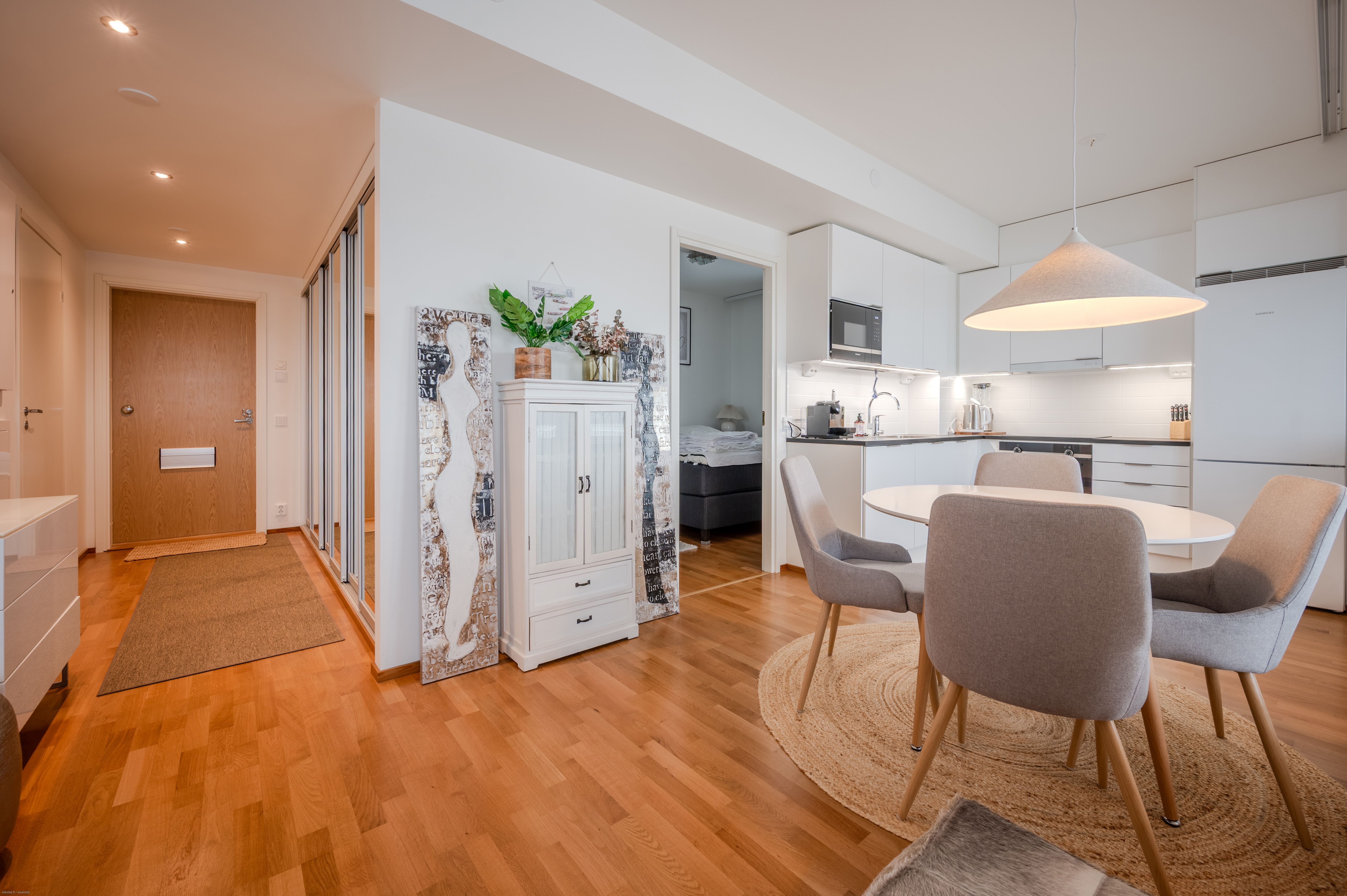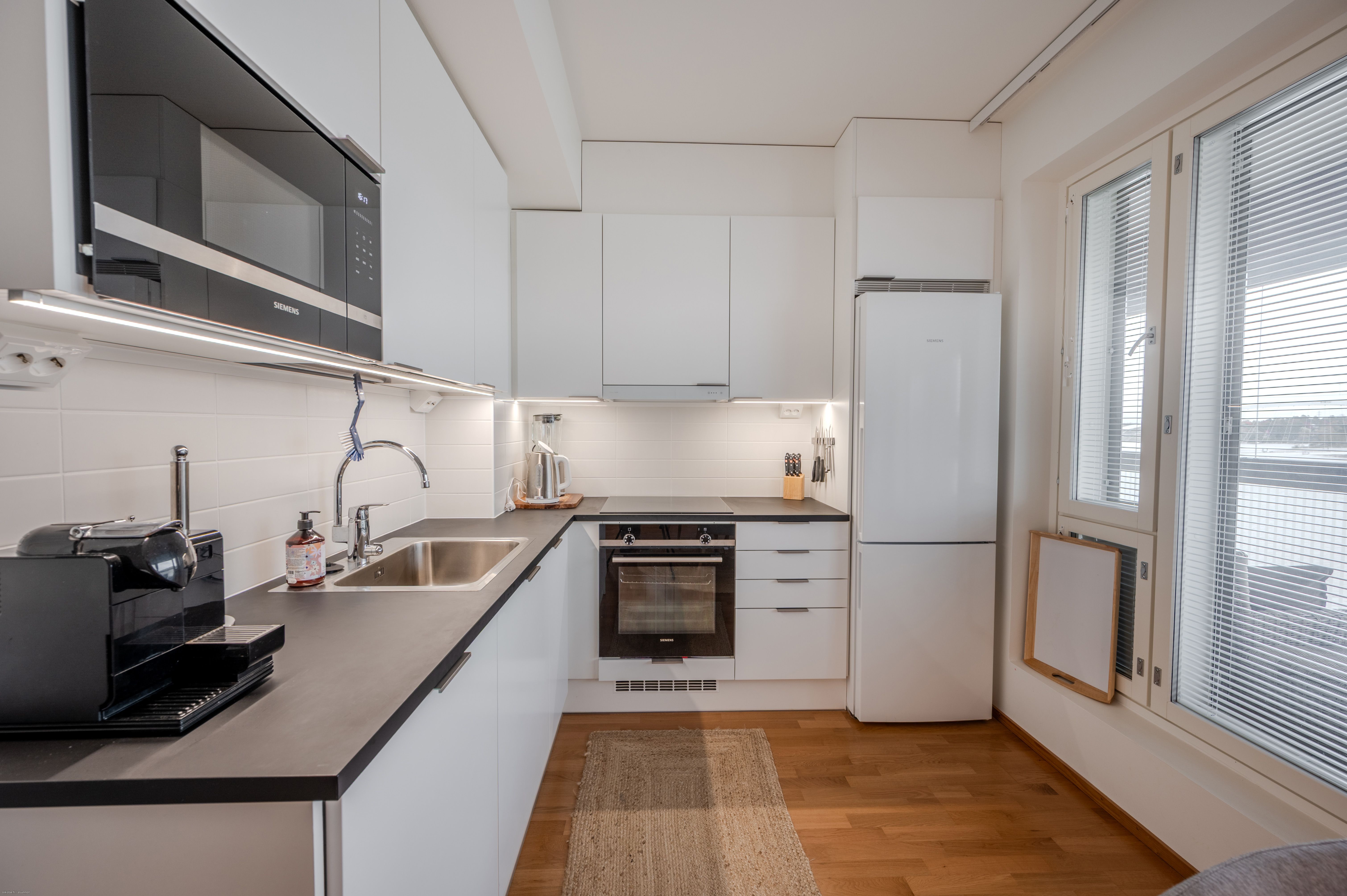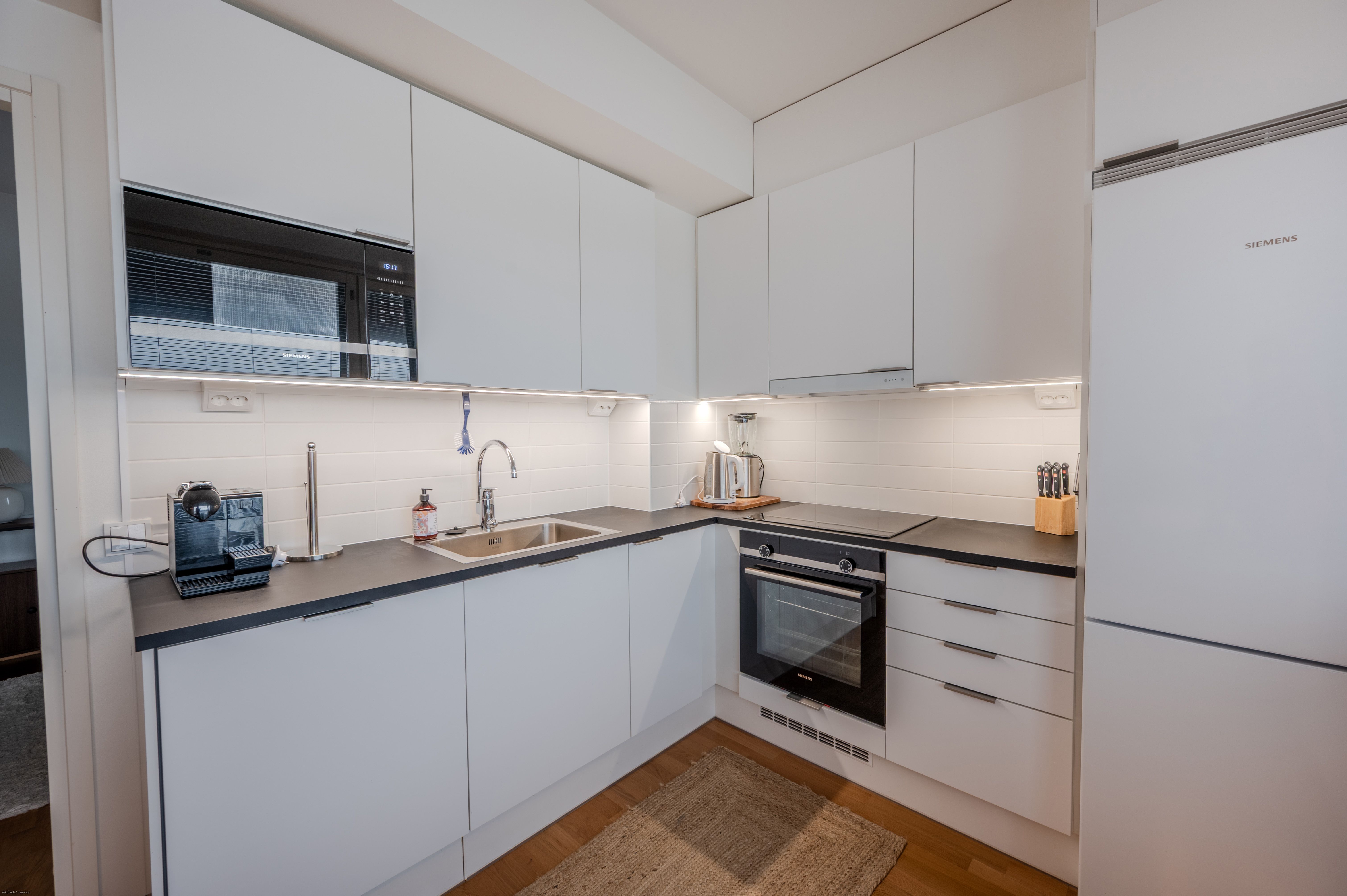 Asunnon materiaalivalinnat sekä kodinkoneet ovat laadukkaita. Lattia on parkettia ja kodinkoneet Siemensin taattua laatua. Kaikki kalusteet ja kodinkoneet sisältyvät hintaan, joten asunto on kirjaimellisesti muuttovalmis.
