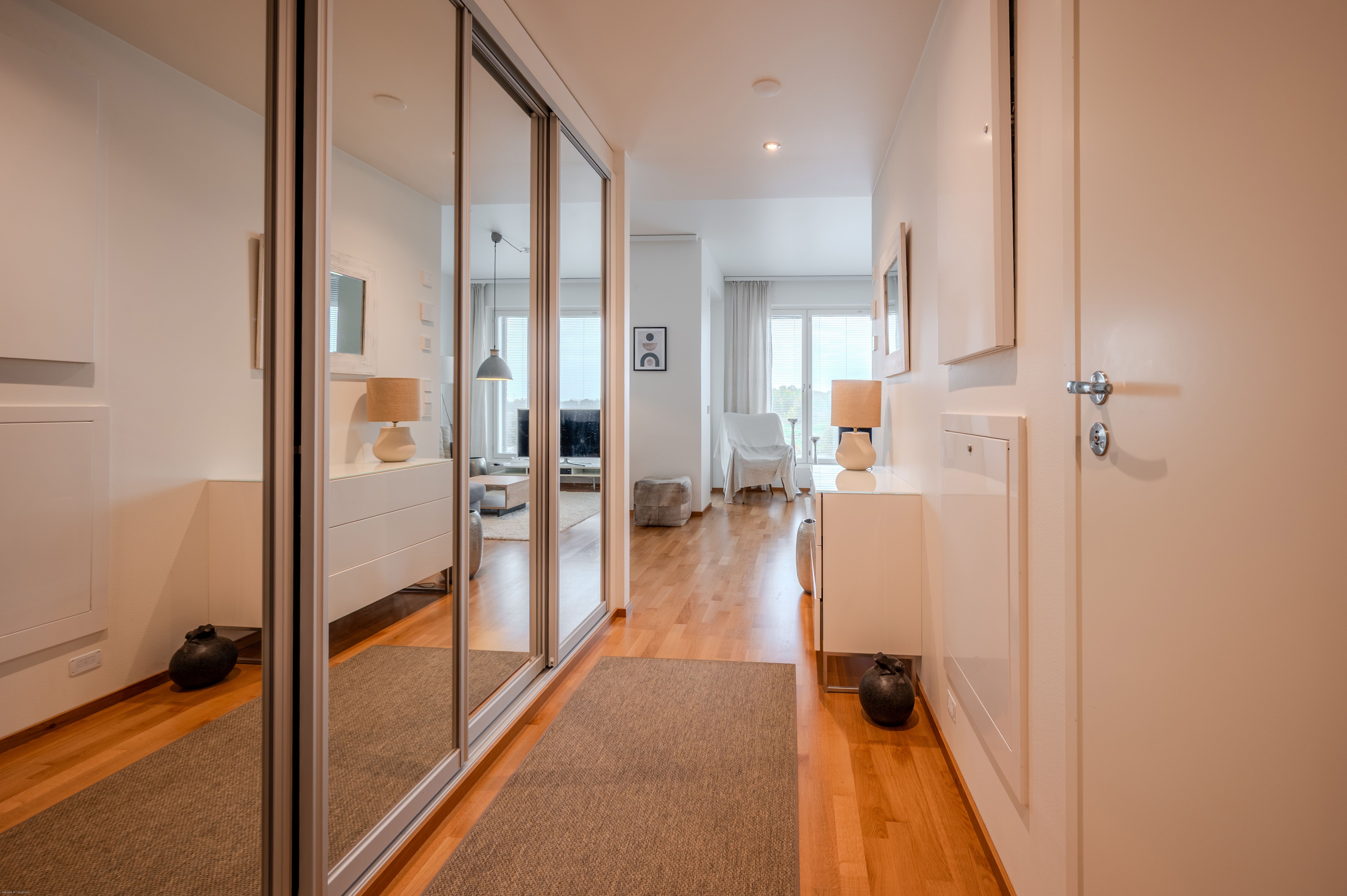 Tämän kodin hyvät puolet eivät rajoitu ainoastaan asuntoon ja taloyhtiöön, vaan myös sijainti on loistava. Liikenneyhteydet ovat mainiot, sillä raitiovaunupysäkki sijaitsee talon edessä ja metroasema Kalasatamassa, joten liikkuminen keskustaan ja muualle Helsinkiin on helppoa. Palveluiden osalta ei kuitenkaan ole tarve lähteä merta edemmäksi kalaan, sillä kaikki arjen palvelut löytyvät kävelymatkan päästä ja Mustikkamaan upeat ulkoilureitit alkavat kivenheiton päästä.