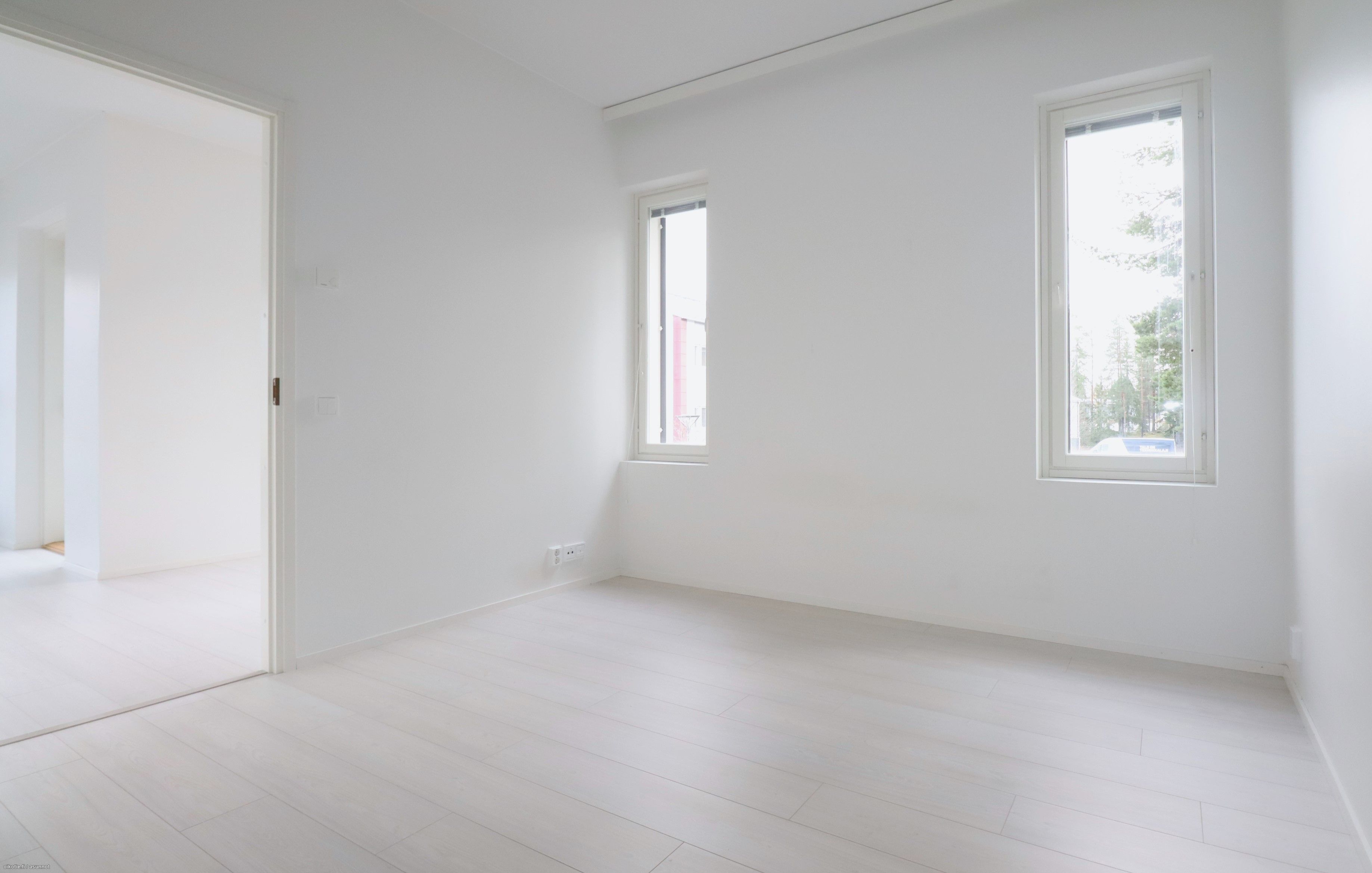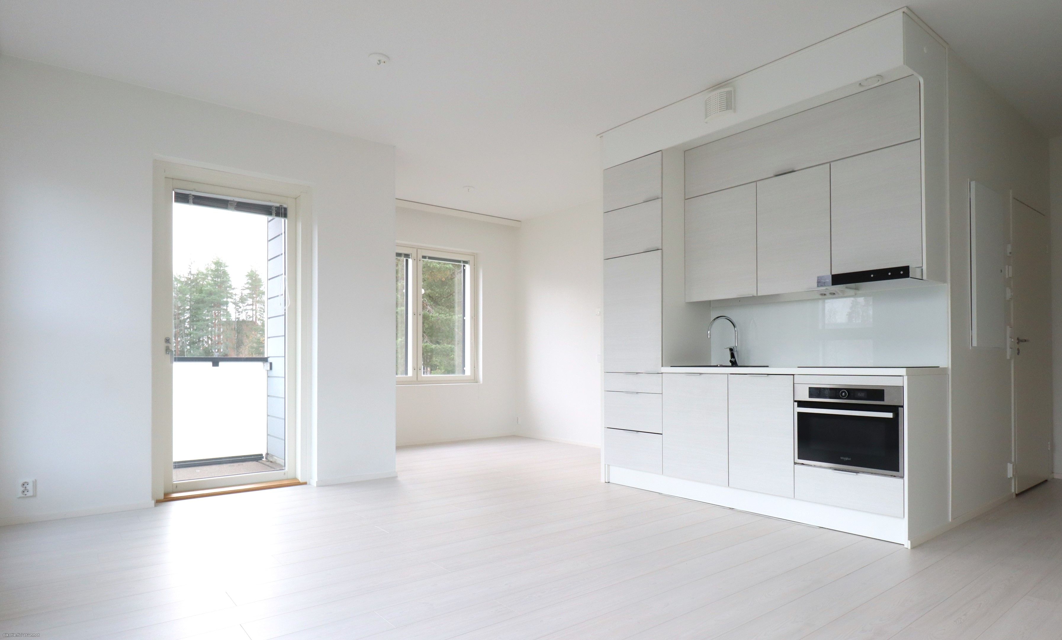 Kolmannessa kerroksessa sijaitsevassa kaksiossa on laminaattilattia ja vaaleat pinnat. Ikkunoissa ja parvekeovissa on sälekaihtimet. Keittiöistä löytyy jääkaappi pakastelokerolla ja astianpesukone. Kylpyhuoneessa tilaa ja liitäntä pyykinpesukoneelle. Asuntojen kuivissa tiloissa vesikiertoinen lattialämmitys ja kylpyhuoneissa sähköinen lattialämmitys. Asunnon mukana vuokrataan lämpötolpallinen autopaikka hintaan 25eur /kk.
