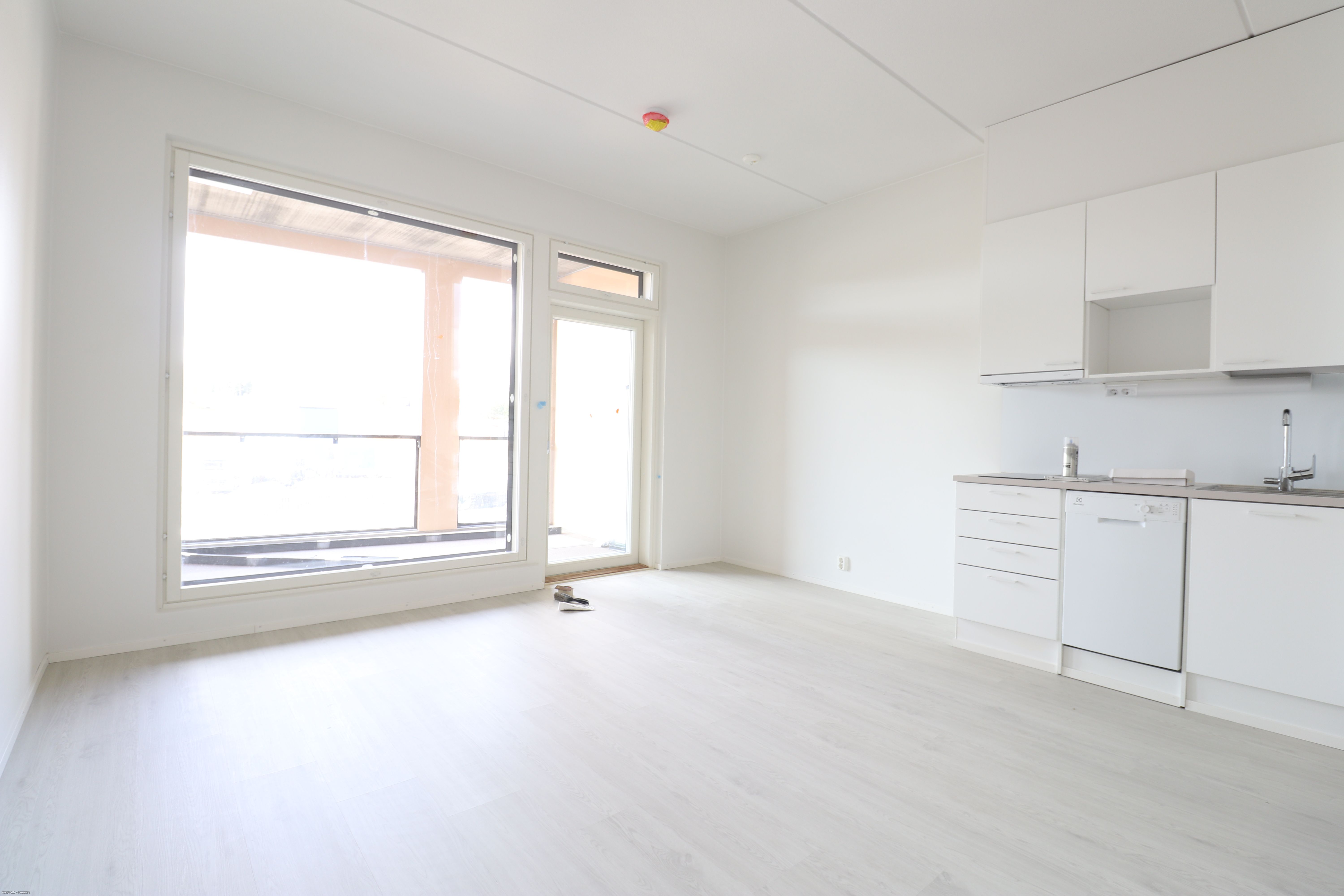 Asunnon lattia on tammilautaparkettia ja seinät raikkain maalipinnoin. Keittiöstä löytyy seuraavat kodinkoneet: astianpesukone, kalusteuuni, kahden levyn keraaminen liesitaso sekä jääkaappi pakastelokerolla. Tilavassa kylpyhuoneessa on liitäntä pyykinpesukoneelle. Todella tilava parveke on kuin yksi huone lisää.