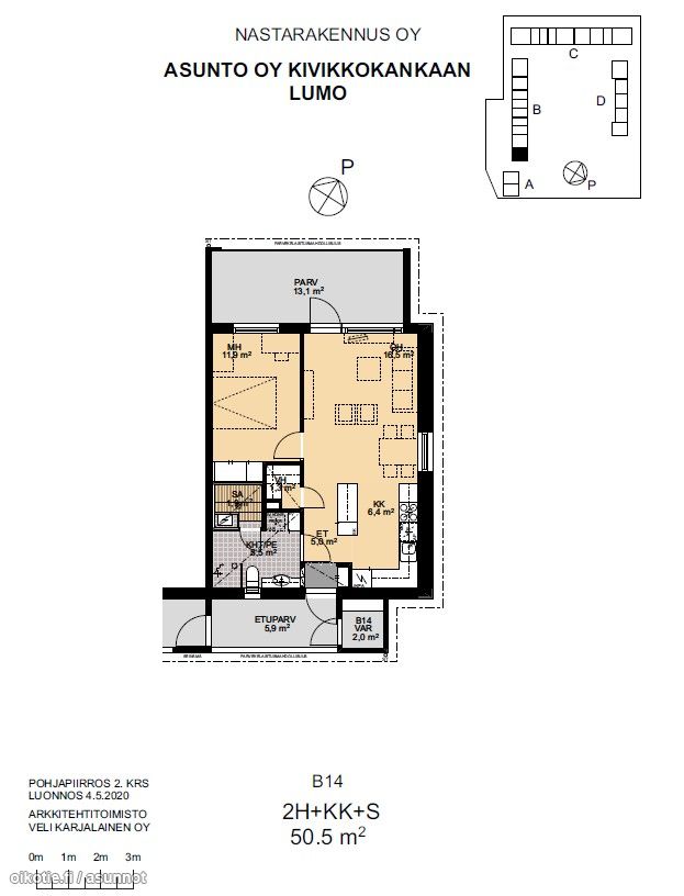 | Huoneiston kokoonpano | 2h,kt,kh,vh,sa,parv |