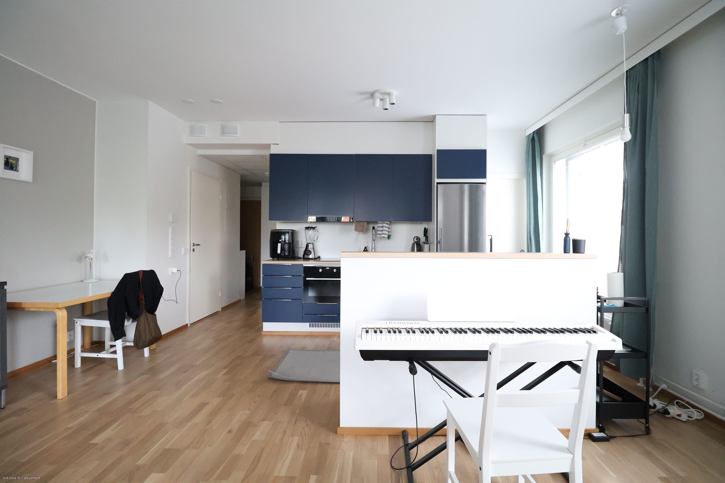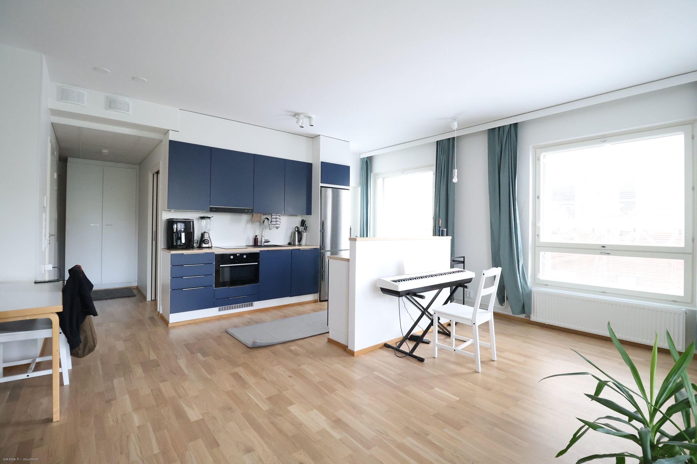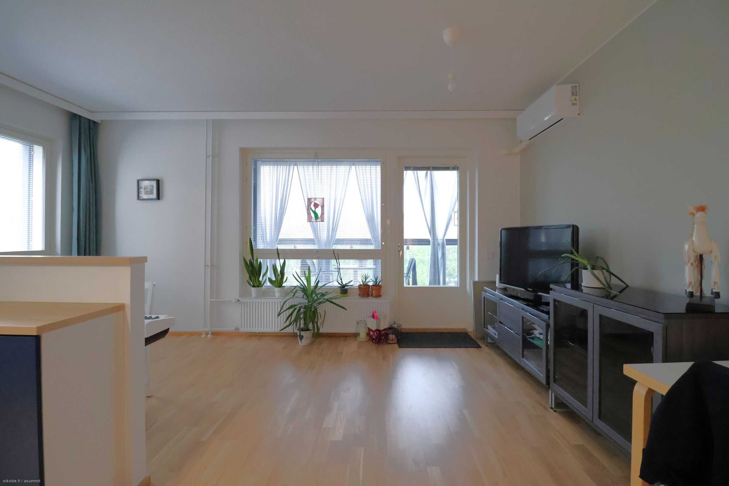 Asunnossa on ilmalämpöpumppu, joka on mukavuustekijä kesähelteillä.