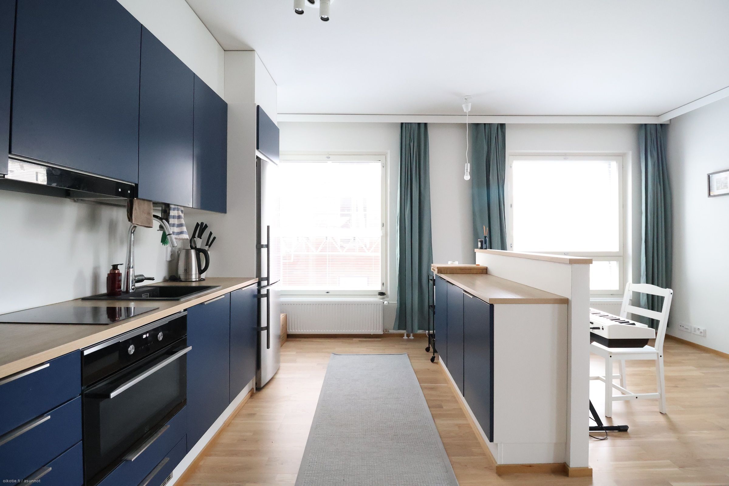 Tämä 3. kerroksen tilava kaksio tarjoaa laadukasta asumista aivan keskustan tuntumassa. Asunnon valkoiset seinät sekä kaunis vaalea parketti tuovat tilan tuntua. Keittiön varustukseen kuuluu jääkaappipakastin, uuni, induktioliesi sekä astianpesukone. Kylpyhuone on tilava ja sieltä löytyy tilavaraus ja liitäntä pyykinpesukoneelle ja kuivaustornille. Lisätilaa tuo tilava lasitettu parveke.