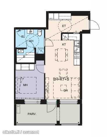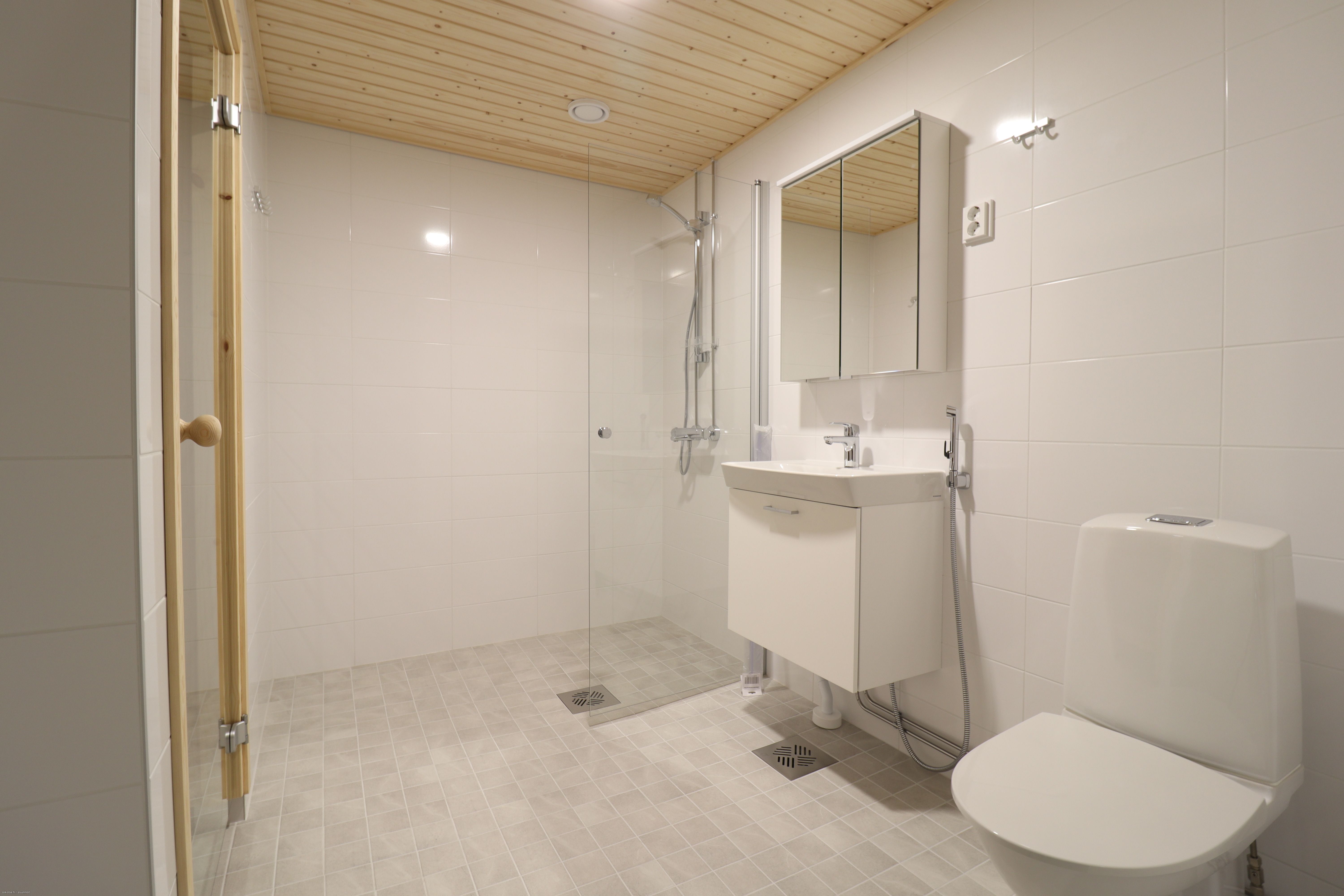 Asunnon lattiat ovat laadukasta laminaattia. Keittiön varustukseen kuuluu keraaminen keittotaso, kalusteuuni, astianpesukone sekä jääkaappipakastin. Huikean kokoisella lasitetulla parvekkeella kelpaa nautiskella vaikka aamukahvit. Tilavassa kylpyhuoneessa on sauna, sekä liitännät pyykinpesukoneelle.