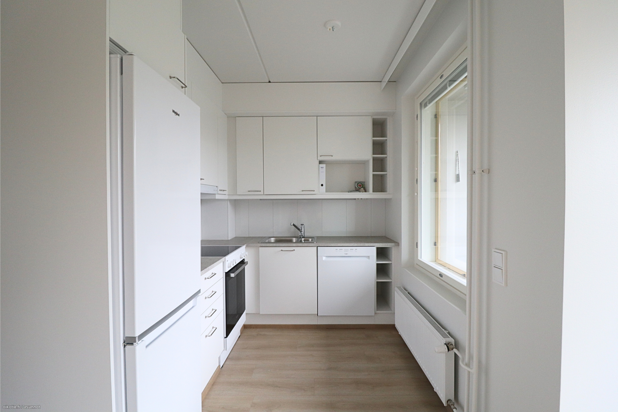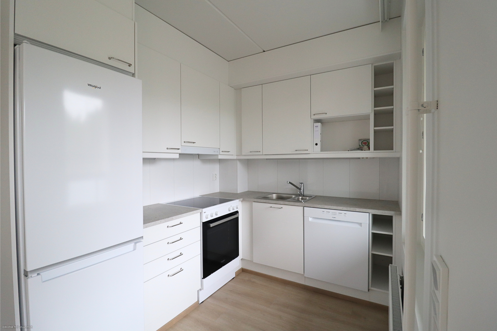 Tässä valoisassa asunnossa seinät ovat vaaleilla maalipinnoilla ja lattiana on puunsävyinen laminaatti. Keittiön varusteluun kuuluu astianpesukone, uuni, liesi sekä jääkaappi-pakastin. Kylpyhuoneesta löytyy paikka ja liitännät pesukoneelle. Lisämukavuutta tuo lasitettu parveke. Taloyhtiöstä löytyy pesutupa, sauna sekä huoneistokohtaiset irtaimistovarastot.