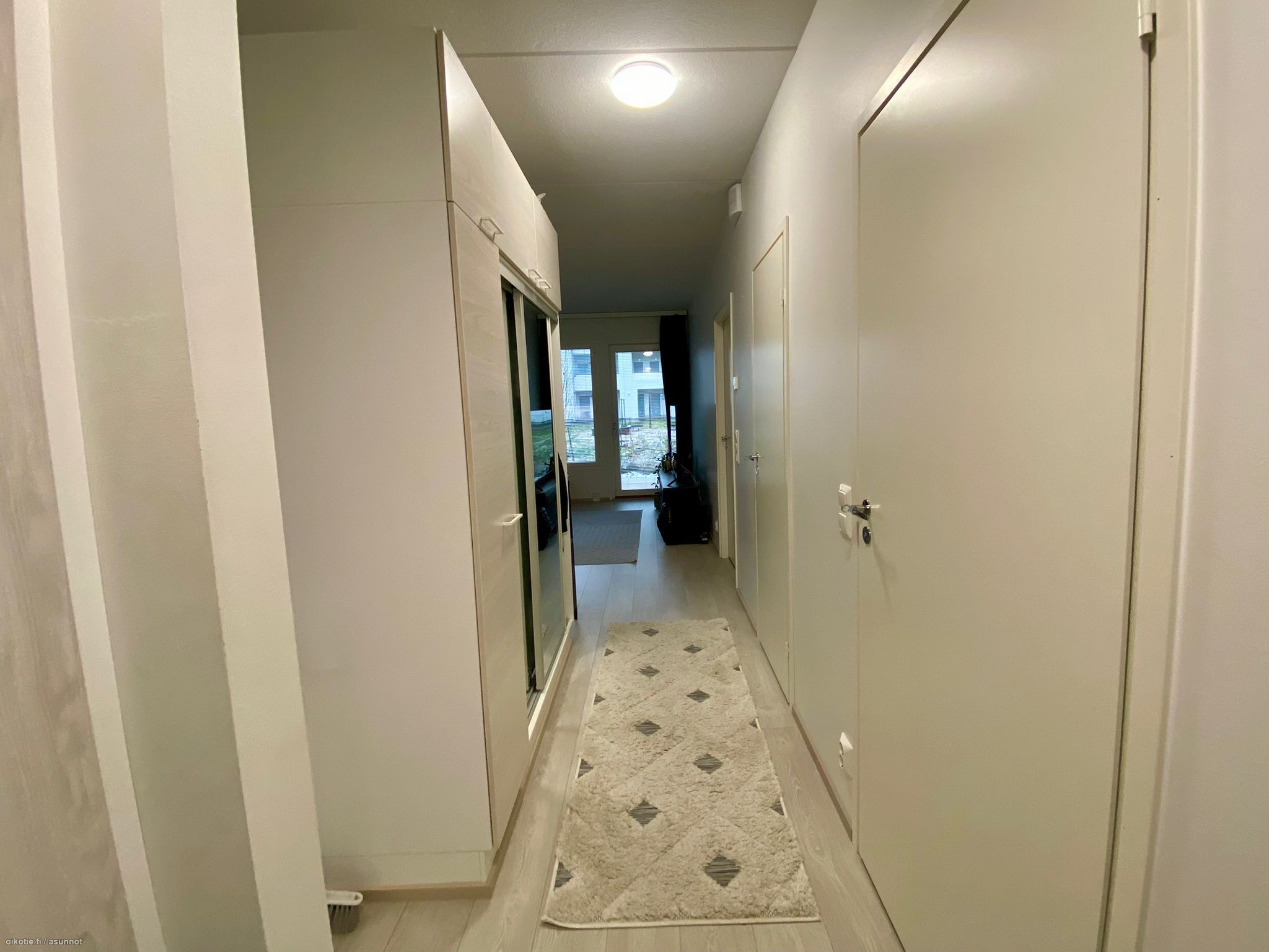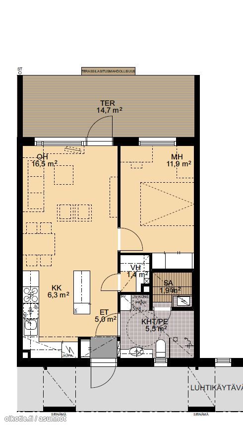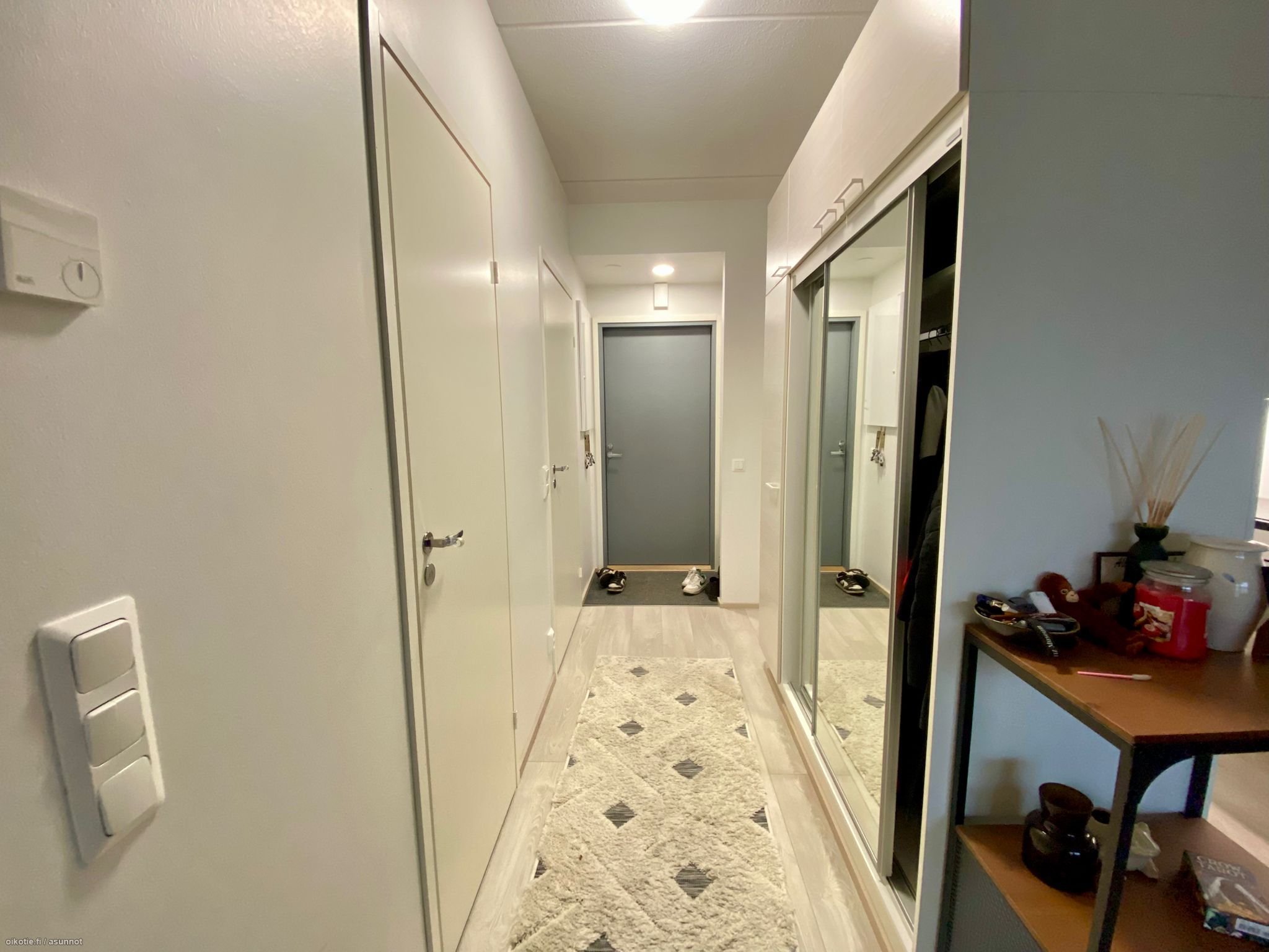 HUOM! kuvat toisesta vastaavasta asunnosta. Pohjakuva on oikea. Eteiskuvat ja terassikuva on tästä asunnosta.