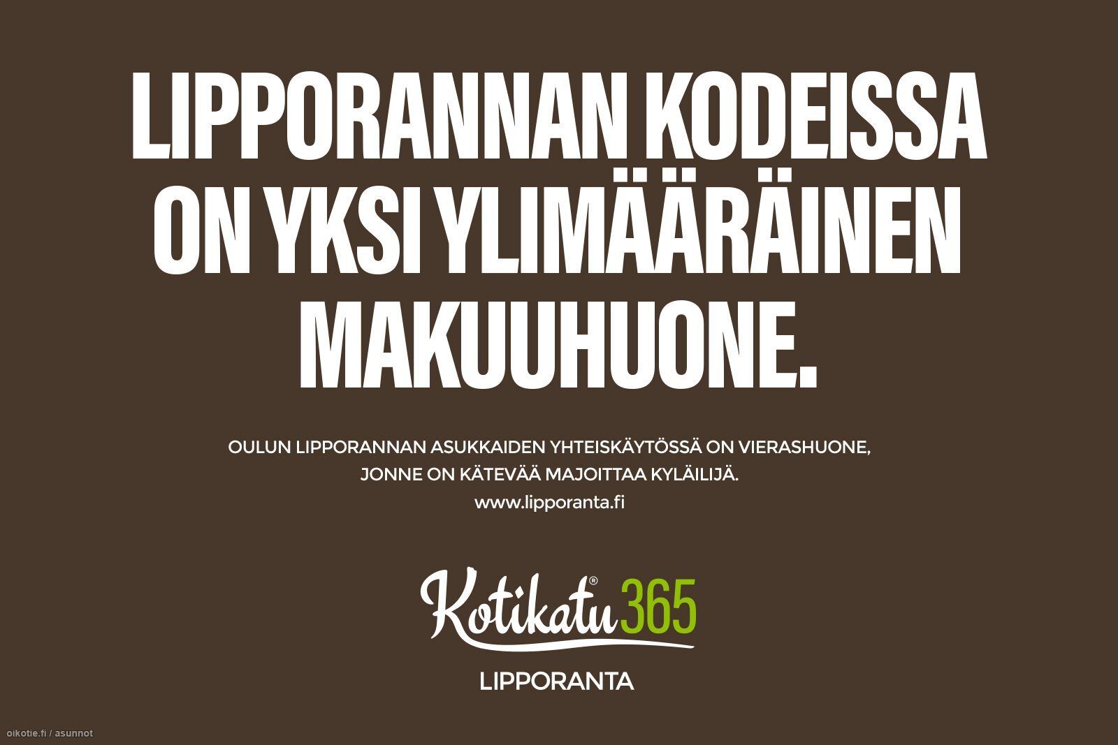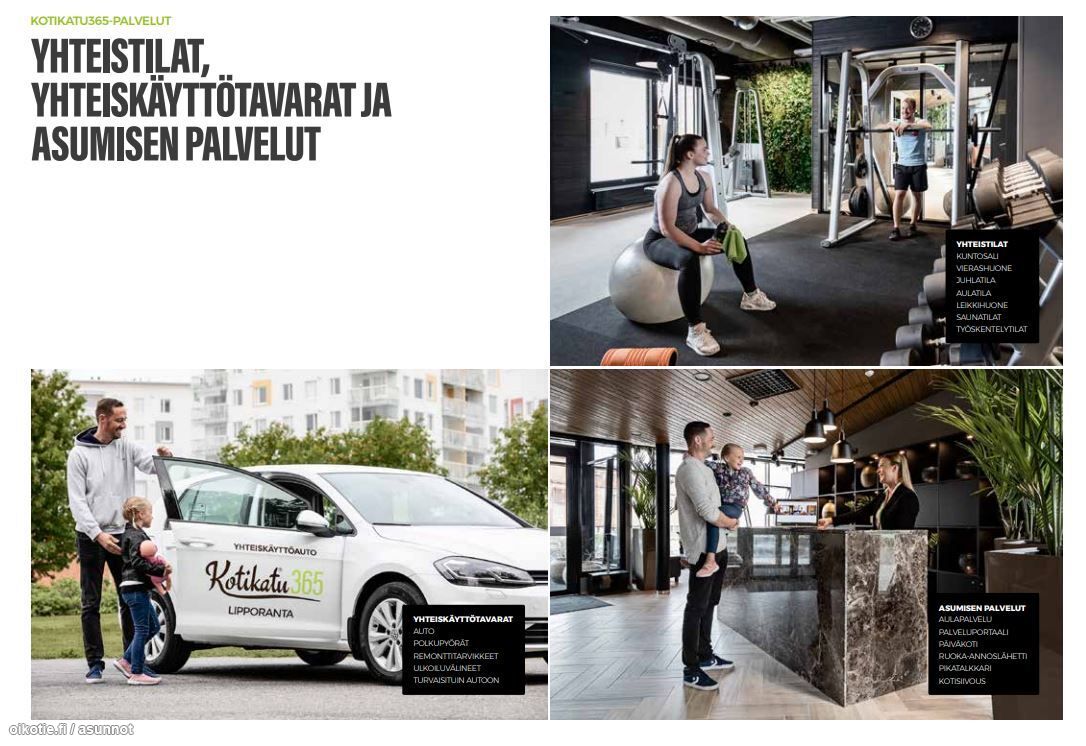 Asukkaiden käytössä on oman kodin tilojen lisäksi ainutlaatuinen Kotikatu365 -konsepti eli 500 lisäneliötä yhteiskäyttötiloja, lainattavia työkaluja, yhteiskäyttöauto, -pyörä ja -vene, päivän lehdet ja paljon muuta! Yhteistiloja ovat tasokas kuntosali, olohuone ja leikkihuone, saunatilat sekä vieraiden käyttöön on vuokrattavissa asunto sekä erillinen vierashuone. Lipporannan Taimenen tiloissa on myös sauna ja pesutupa.