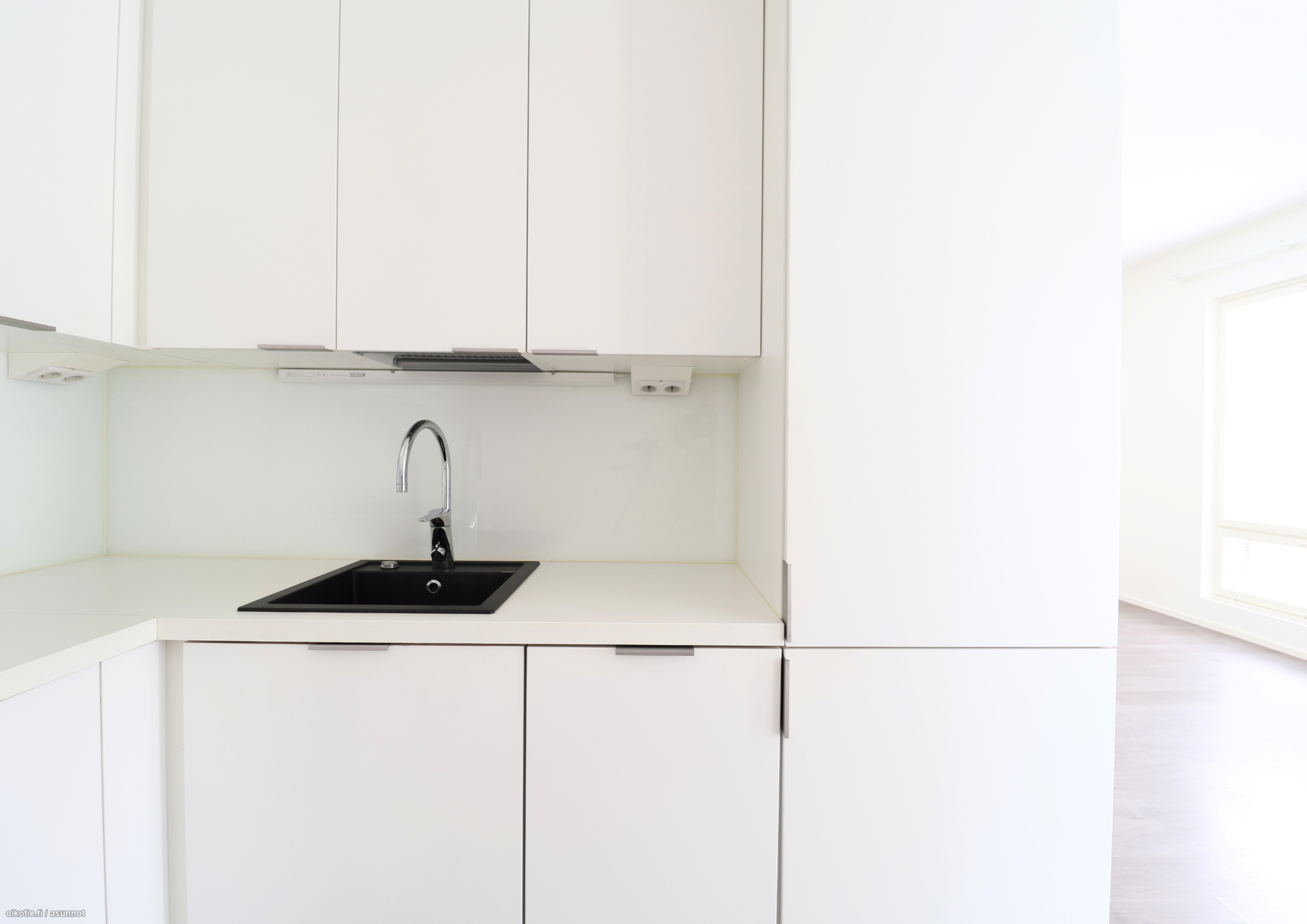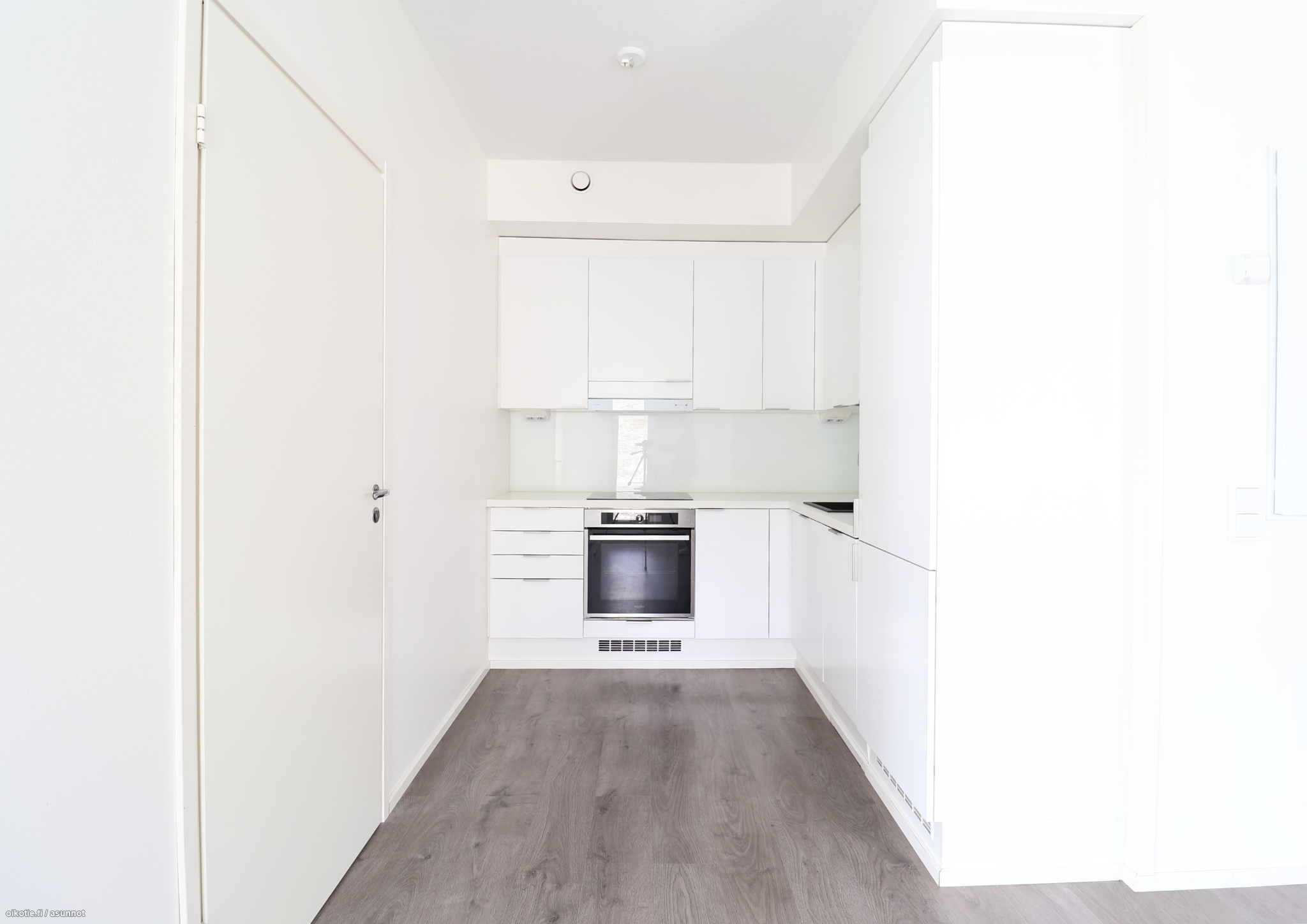 Asunnossa on tumma laminaattilattia ja seinät vaalealla maalipinnalla. Keittiöstä löytyy modernit kodinkoneet ja kylpyhuoneesta paikka ja liitännät pyykinpesukoneelle. Parvekkeella on lasitukset.