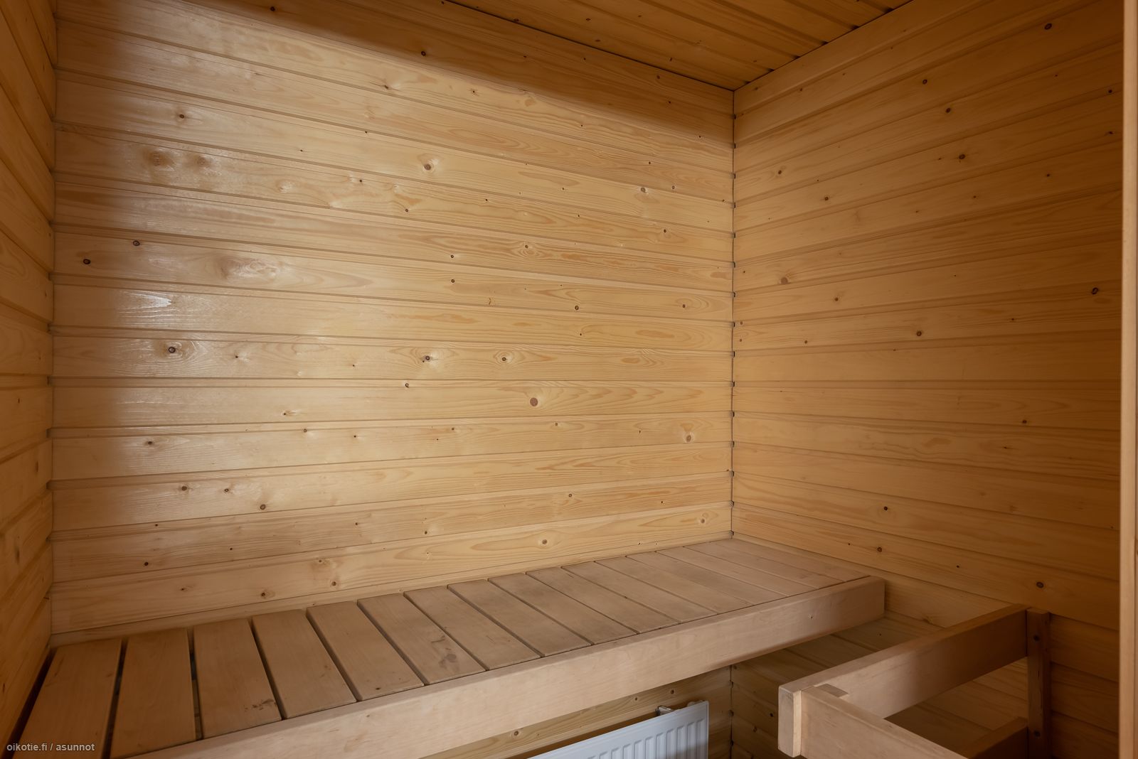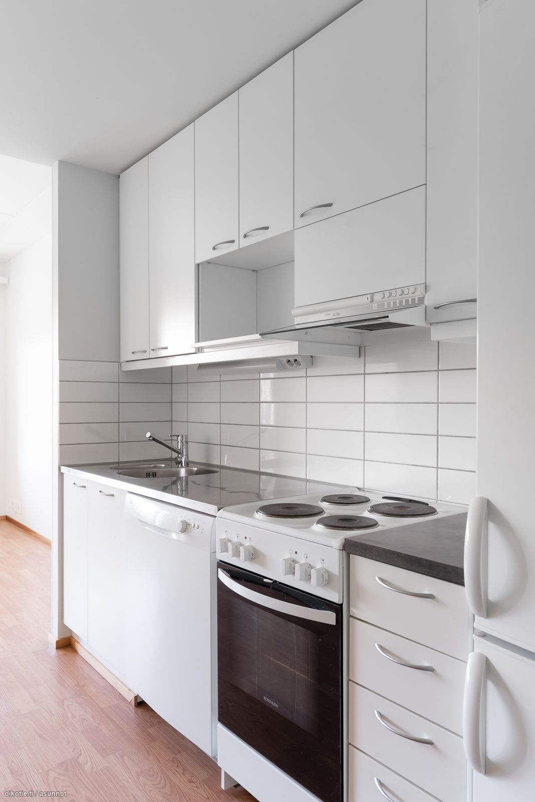 Asunnossa on vaaleat seinät, laminaattilattia ja kaakeloitu kylpyhuone, jossa paikka ja liitännät pyykinpesukoneelle. Keittiössä varustuksena mm. astianpesukone, liesi/uuni ja jääkaappipakastin.