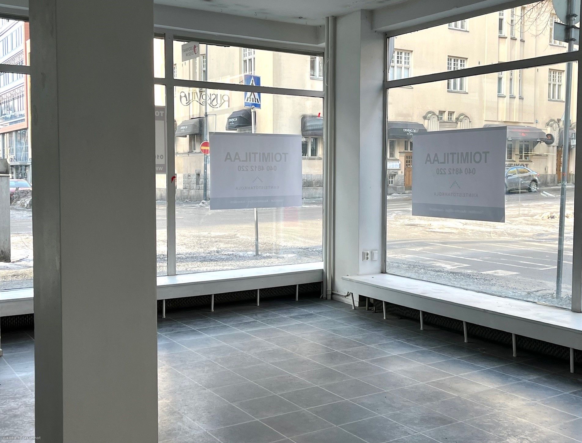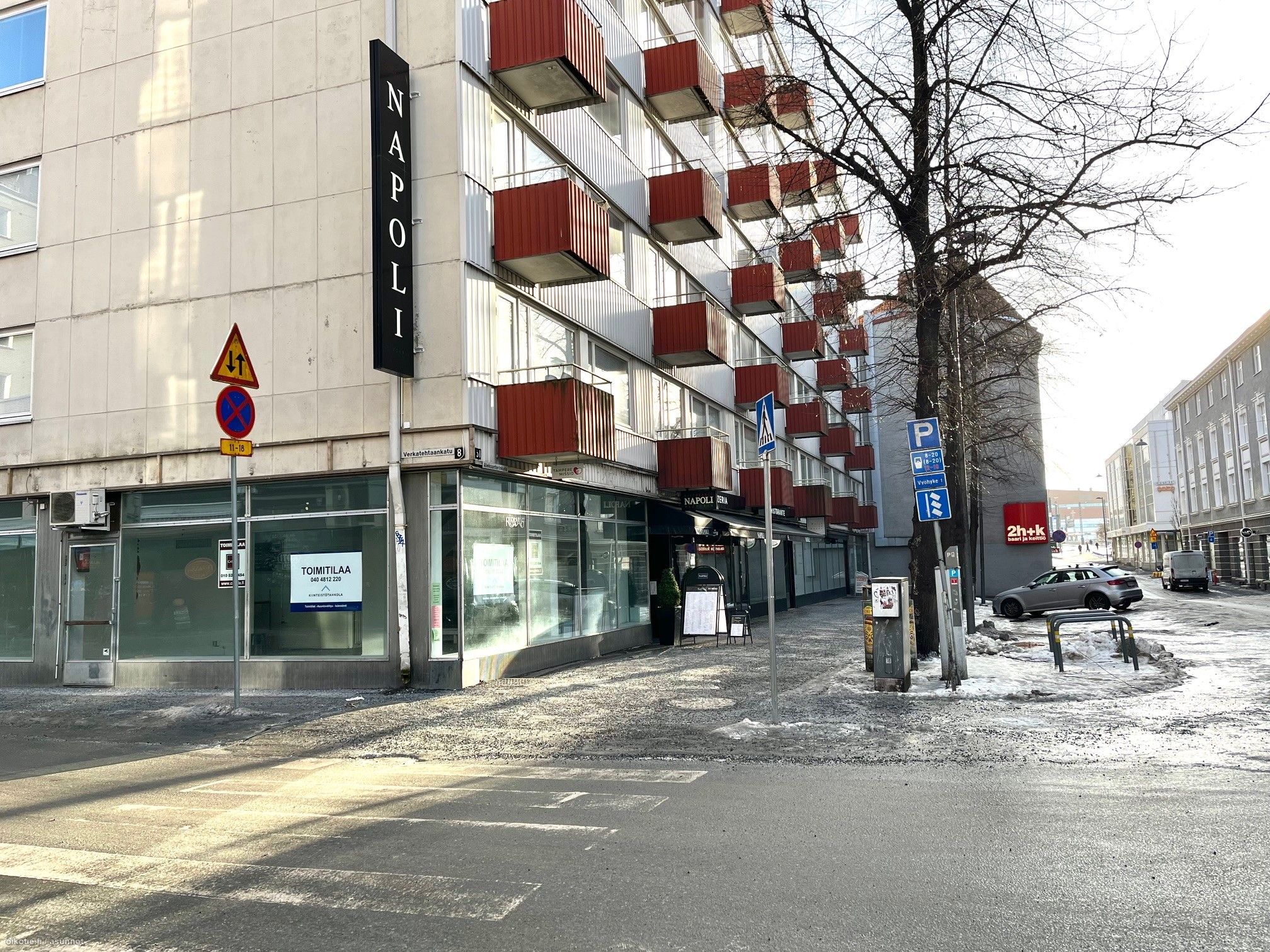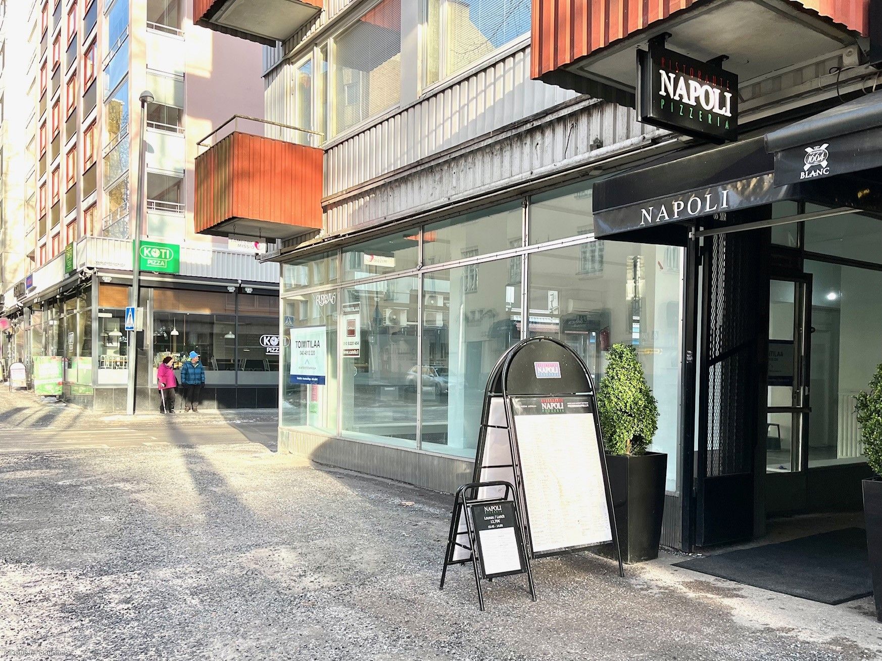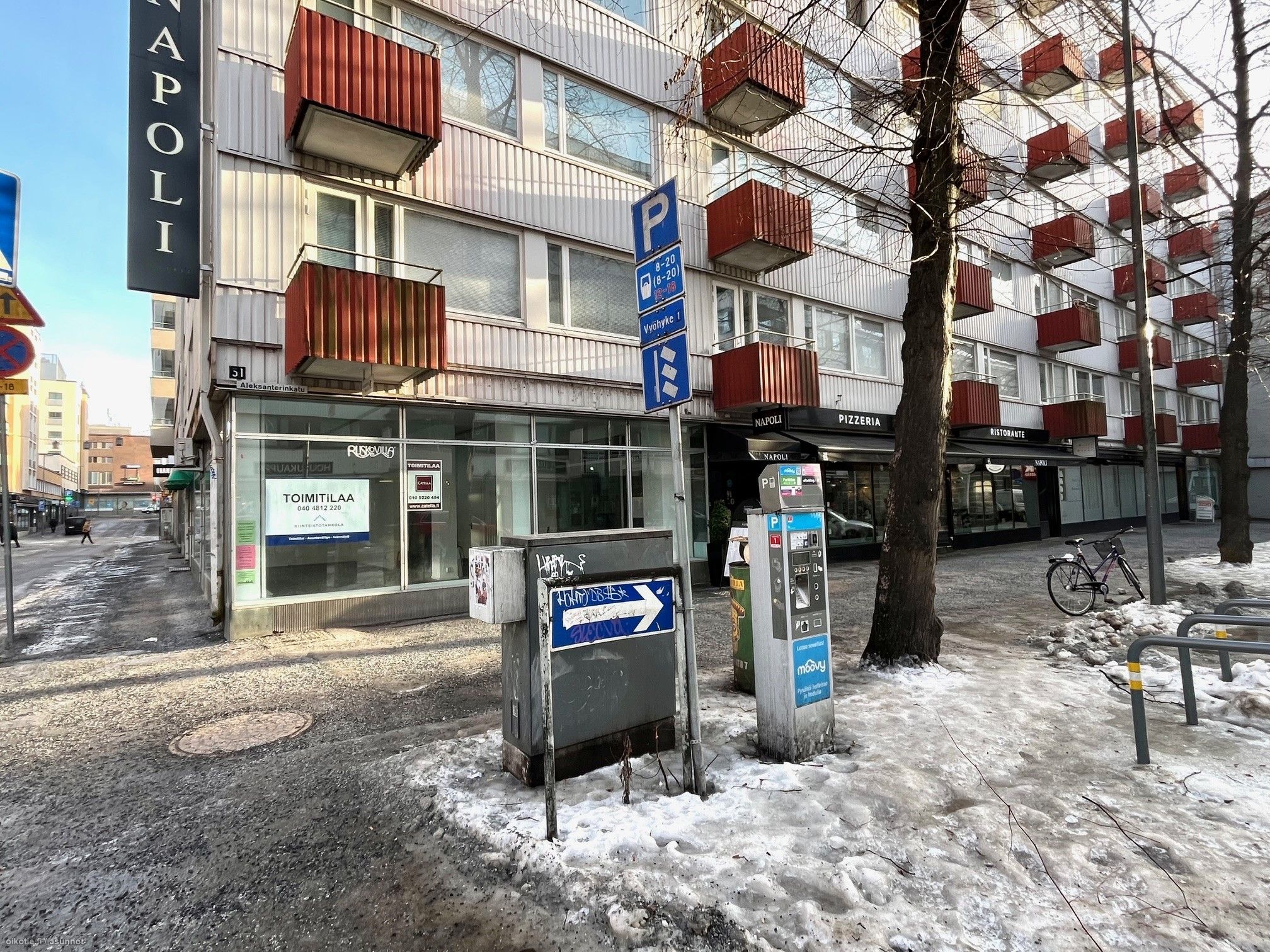 Aleksanterinkadun ja Verkatehtaankadun kulmassa, Pizzeria Napolin naapurissa, liiketila vapaana.
