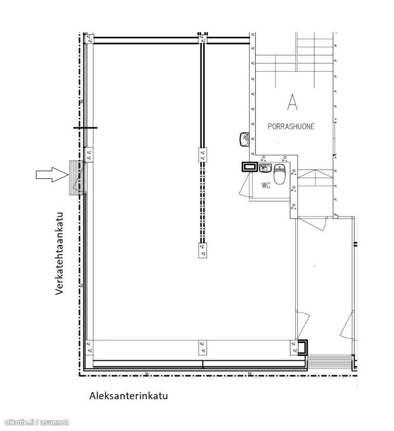 Suuret lähes koko tilan korkuiset ikkunat kahteen suuntaan. Tila avaraa, jossa kevytrakenteinen seinä. Lisäksi pieni wc. Tilaa ollaan valmiita yhteisesti vuokralaisen kanssa suunniteltaessa remontoimaan ja muokkaamaan toimintaan sopivaksi.