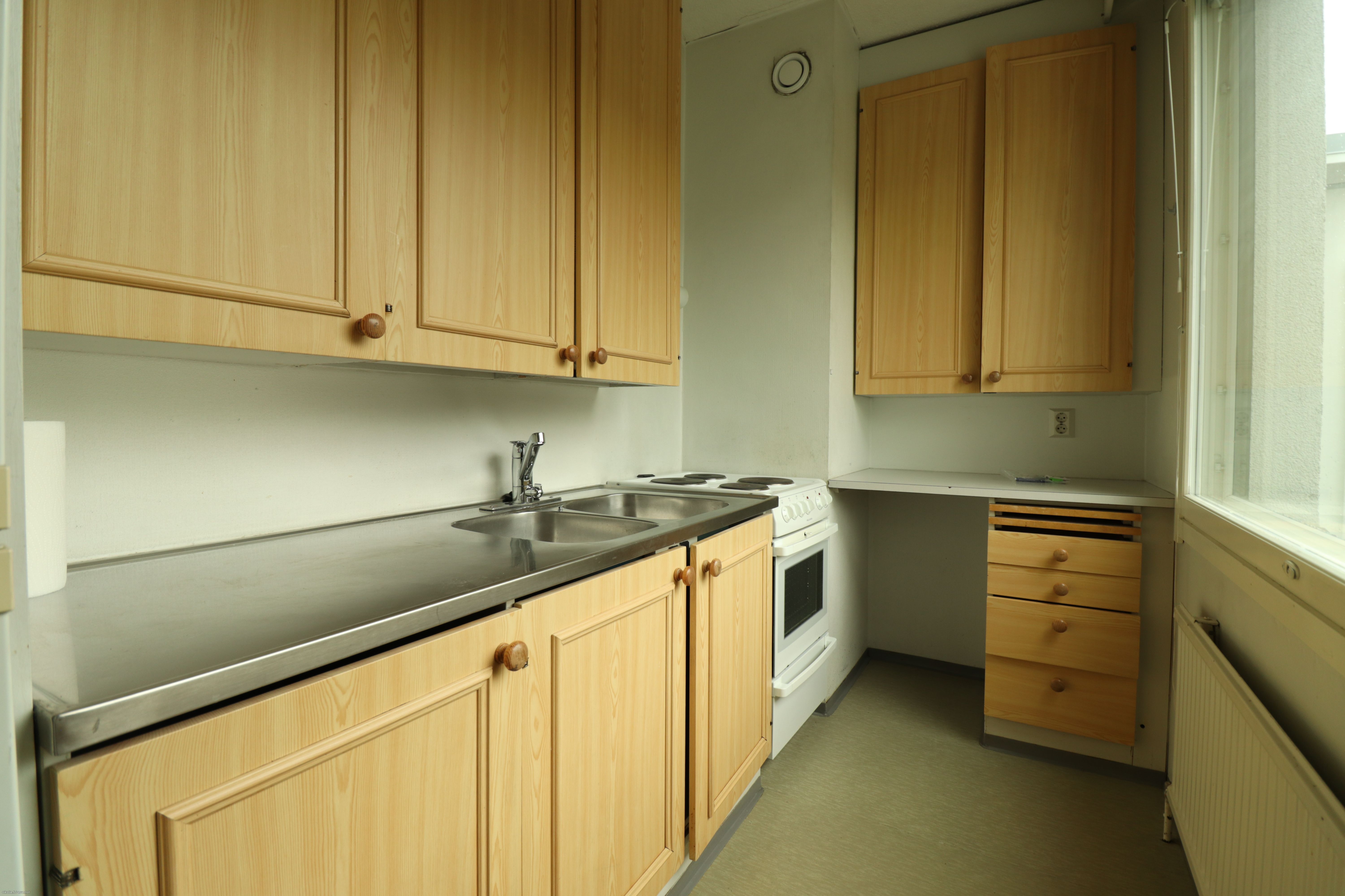 Tässä rauhallisen taloyhtiön ylimmän kerroksen peruskuntoisessa asunnossa on yksiöksi hyvin tilaa. Kylpyhuone on juuri remontoitu ja pyykinpesukoneelle on paikka ja liitännät. Lattiamateriaalina on muovimattoa ja seinät on valkoiseksi maalatut. Asunnossa on hyvin säilytystilaa. Vuokran yhteydessä maksetaan vesimaksuennakkoa 20€/hlö/kk. Sähköstä tehdään oma sähkösopimus.