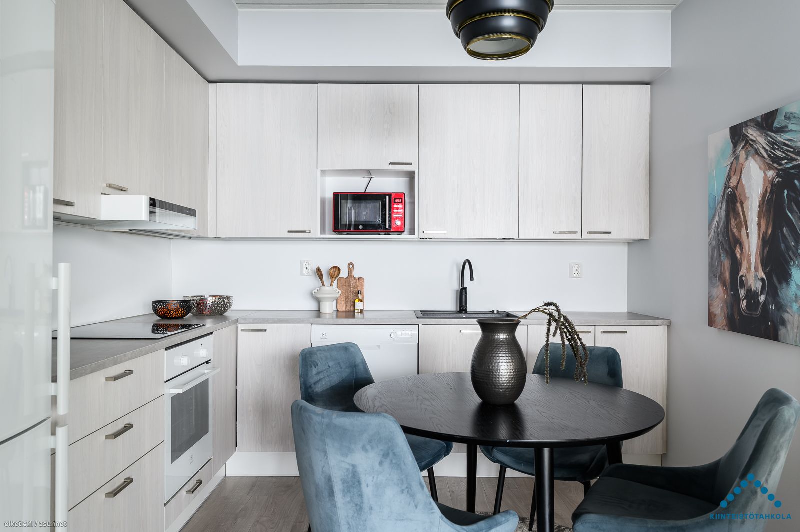 | Keittiön varusteet | Varusteet: Jääkaappipakastin, Astianpesukone. Työtaso: Laminaattitaso. Liesi: Induktioliesi. Toimiva, L- mallinen keittiö ajattomalla värityksellä |