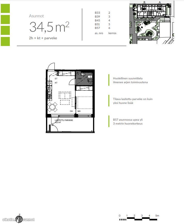 Asunnon ikkunat ja lasitettu parveke ovat viihtyisälle sisäpihalle päin. Lattiat ovat laadukasta lautaparkettia ja seinät maalipinnoin. Keittiöstä löydät keraamisen liesitason, jääkaappi-pakastimen, erillisuunin ja astianpesukoneen. Kylpyhuoneessa liitännät pyykinpesukoneelle. Asunto on helposti sisustettava vesikiertoisen lattialämmityksen sekä toimivan pohjaratkaisun ansiosta.