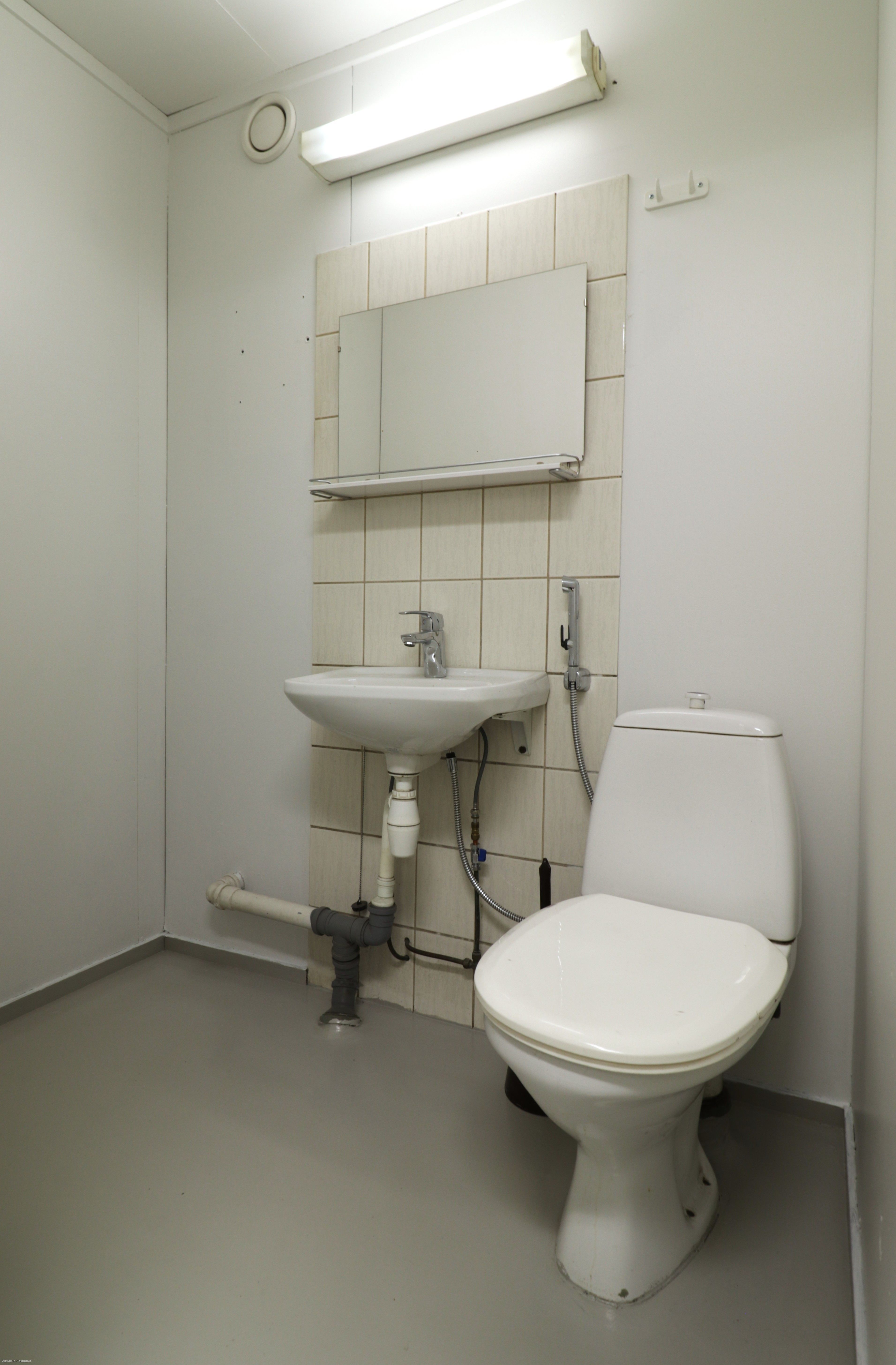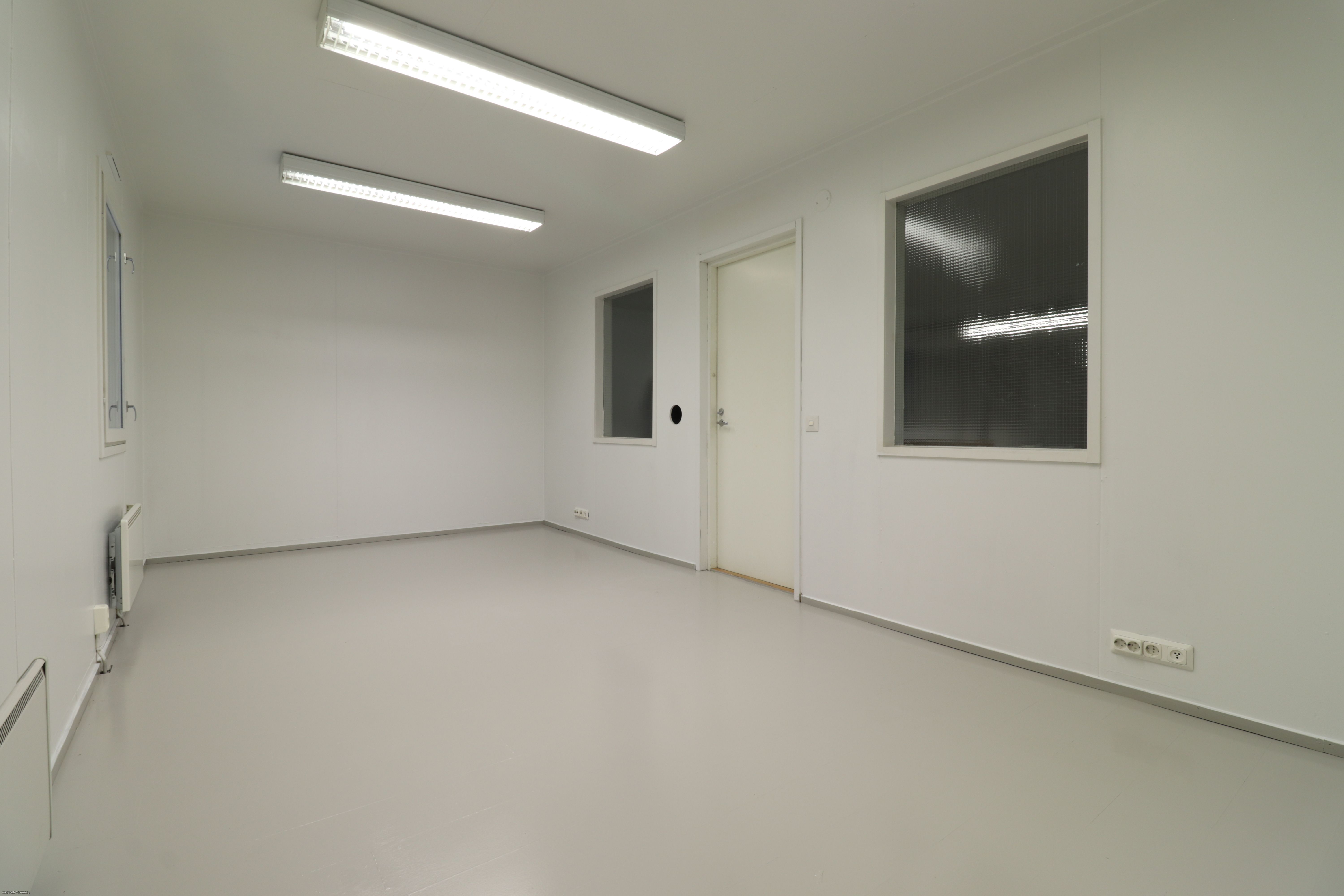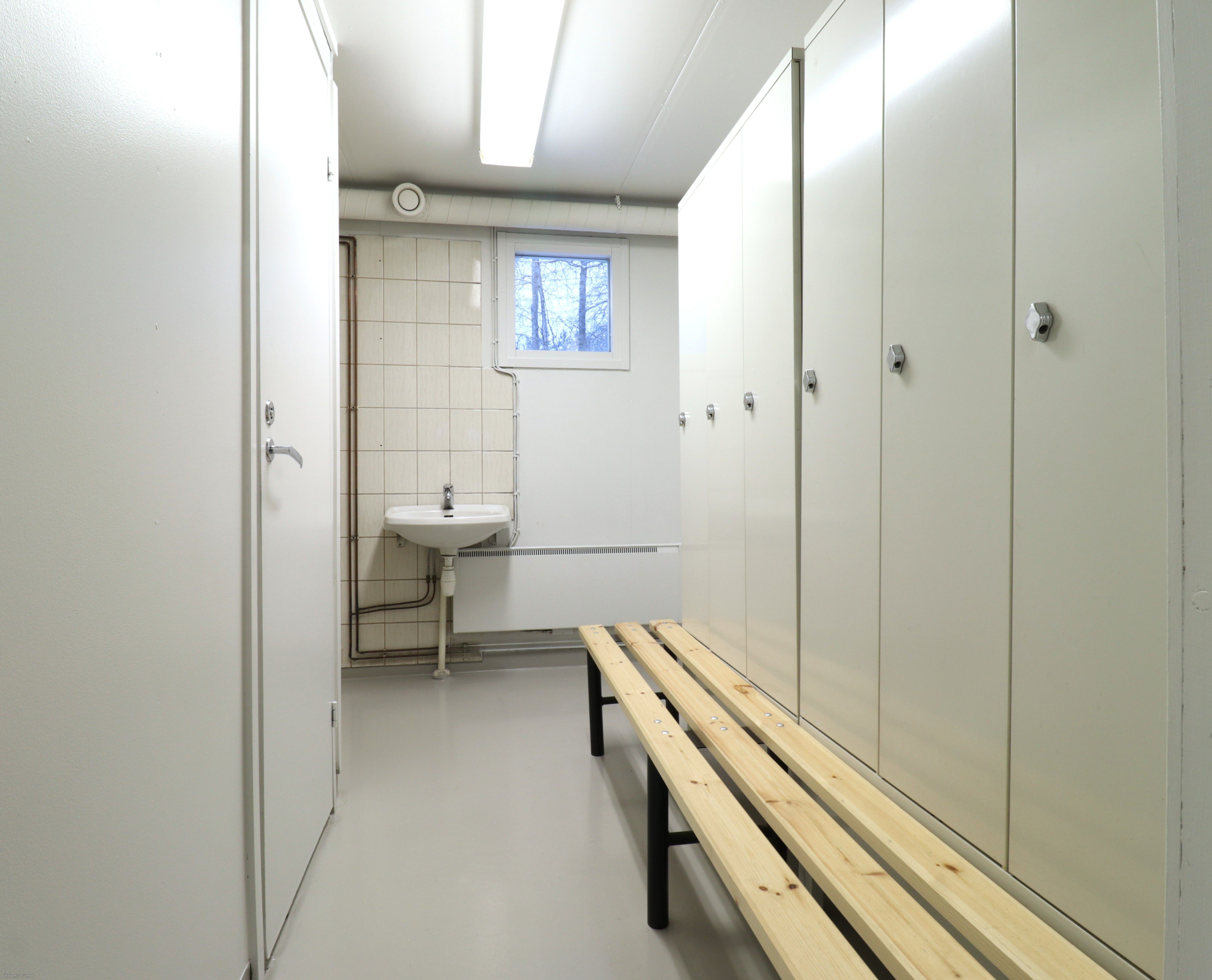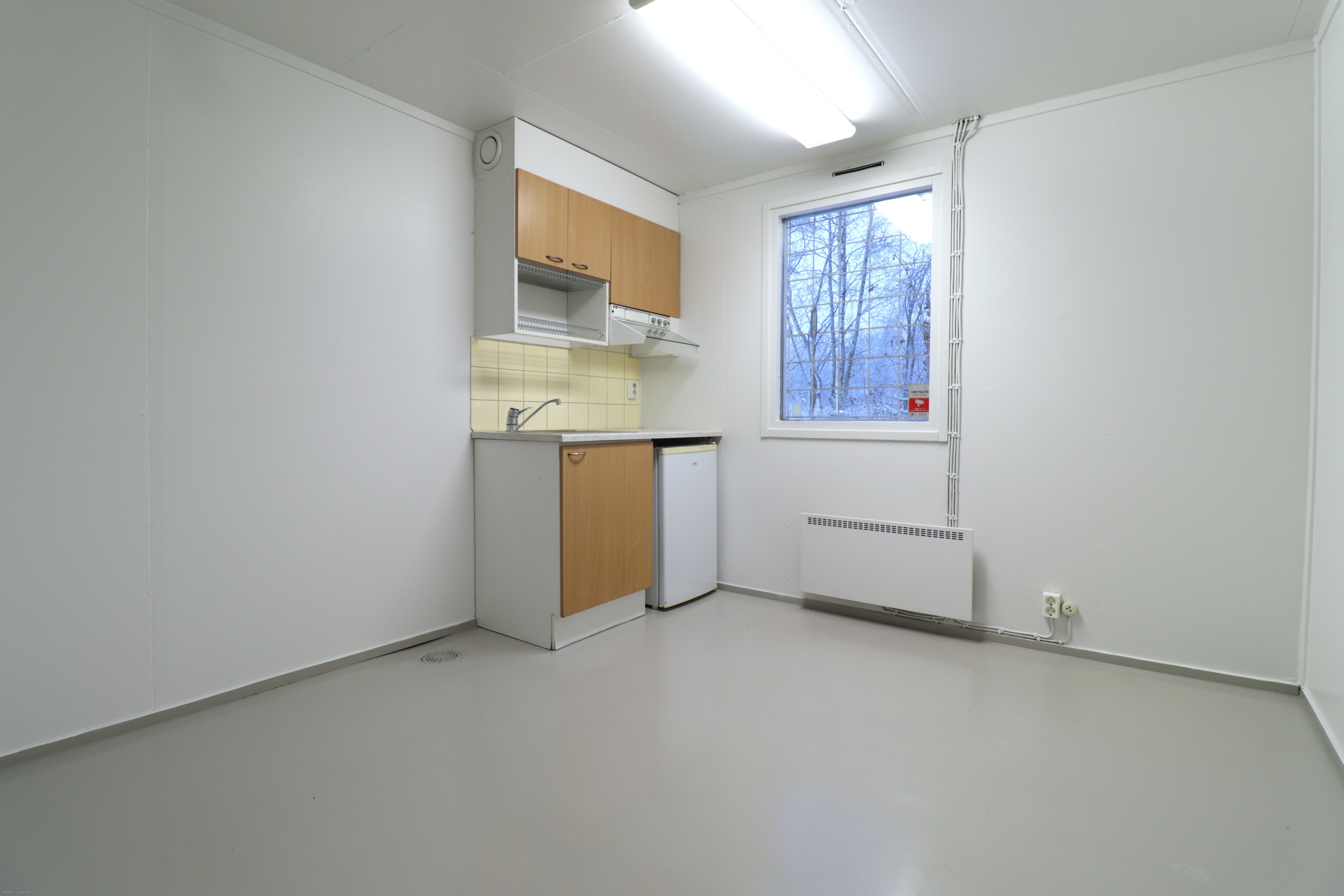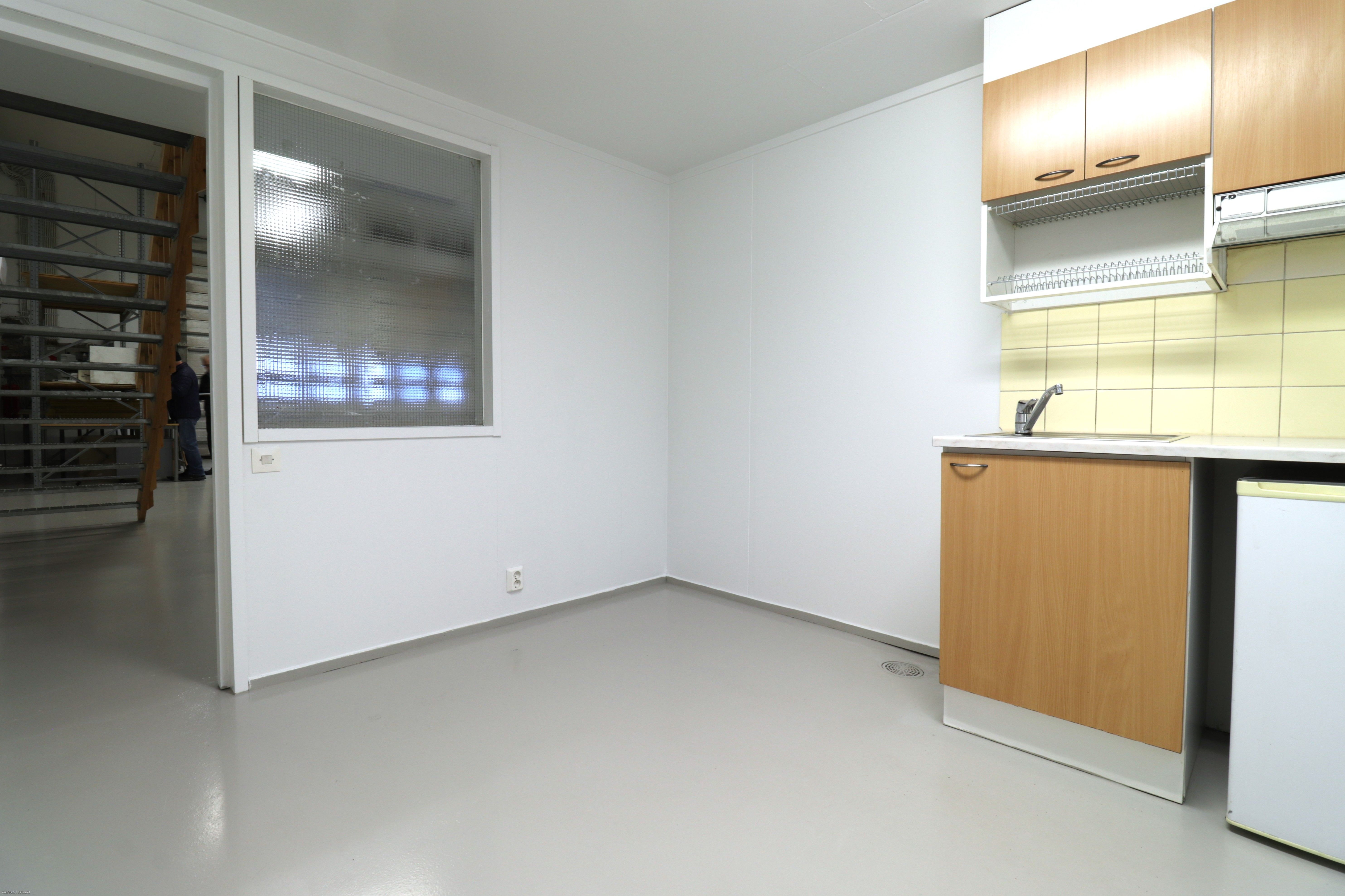 Tila koostuu hallista, kahvihuoneesta, jossa minikeittiön kalustus, sekä pukuhuoneesta, jossa wc ja suihku. Lisäksi kahvihuoneen ja sosiaalitilojen yläpuolella toiseen kerrokseen on rakennettu n. 18 m2 toimistotila.