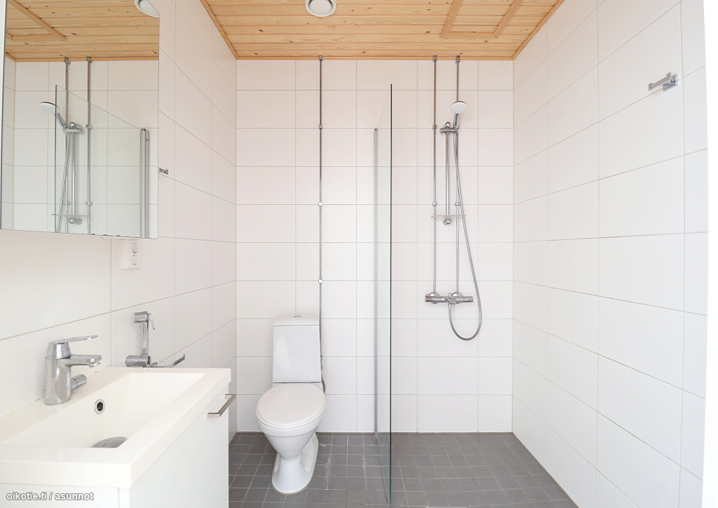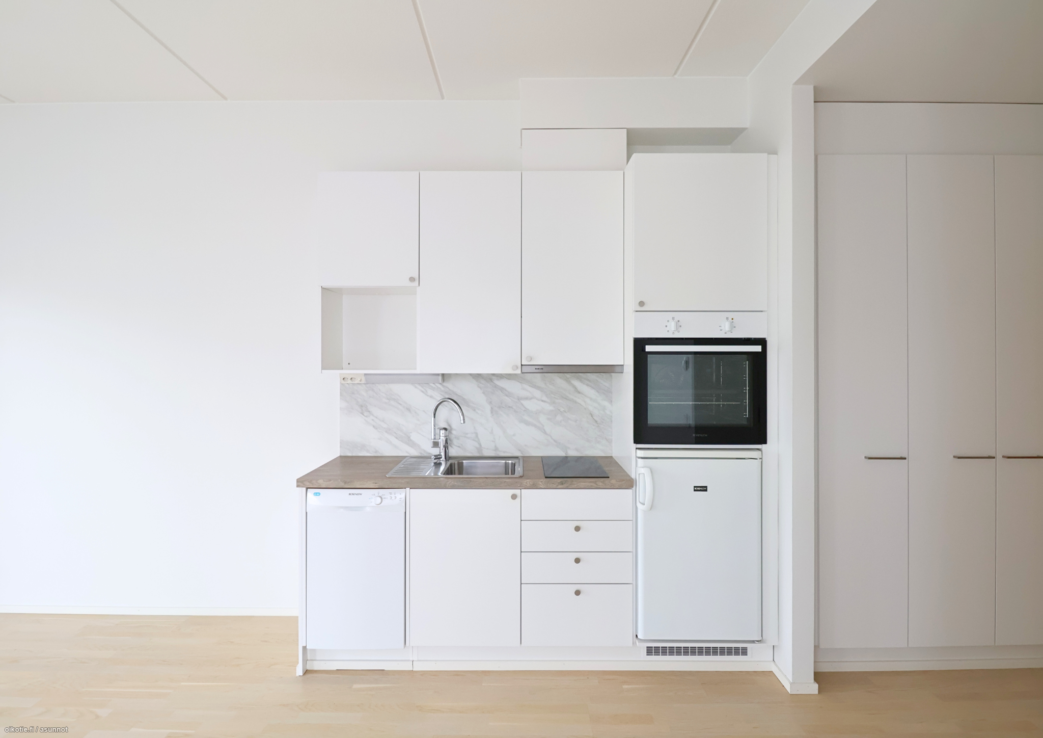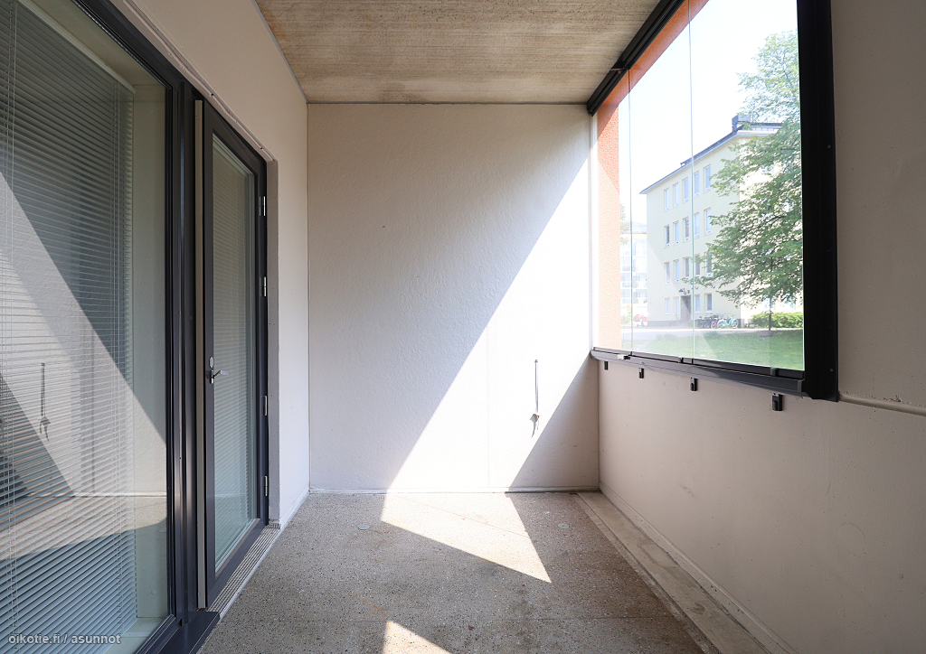 Asunnossa laminaattilattia, seinät vaalealla maalipinnalla. Nykyaikaisessa keittiössä mm. astianpesukone valmiina. Tilavassa kylppärissä liitäntä ja paikka pesutornille. Asunnon levyinen lasitettu parveke tuo laatua asumiseen.