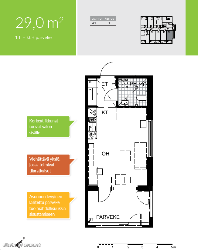 | Huoneiston kokoonpano | 1h+kt+parveke |