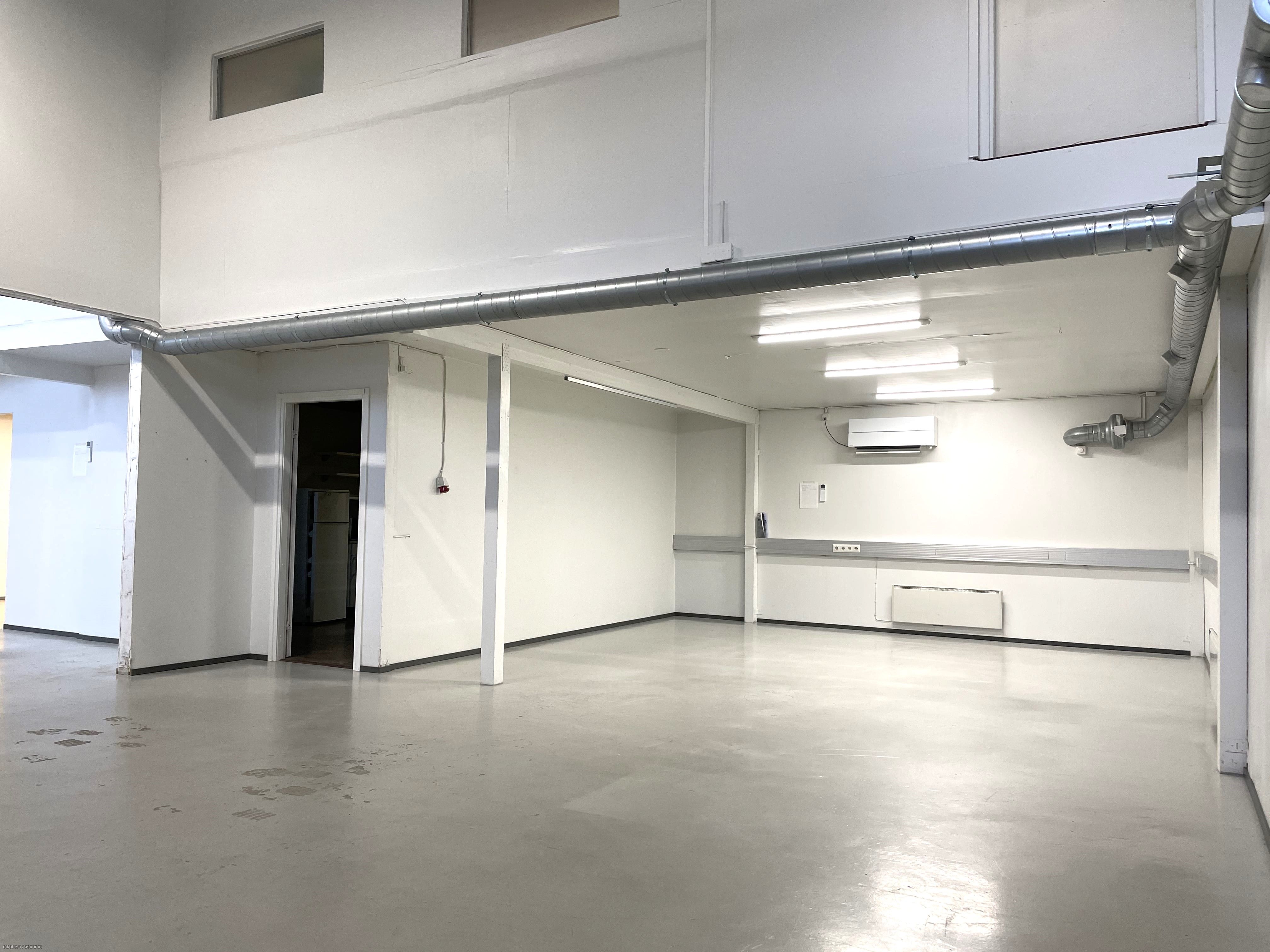 Tilaa on jaettu väliseinällä isommasta kokonaisuudesta, yhteensä tilaa on n. 160 m2. Väliseinässä on käynti toiselle puolelle, oviaukon voi tarvittaessa peittää.