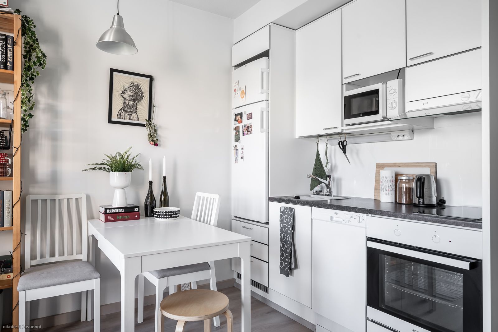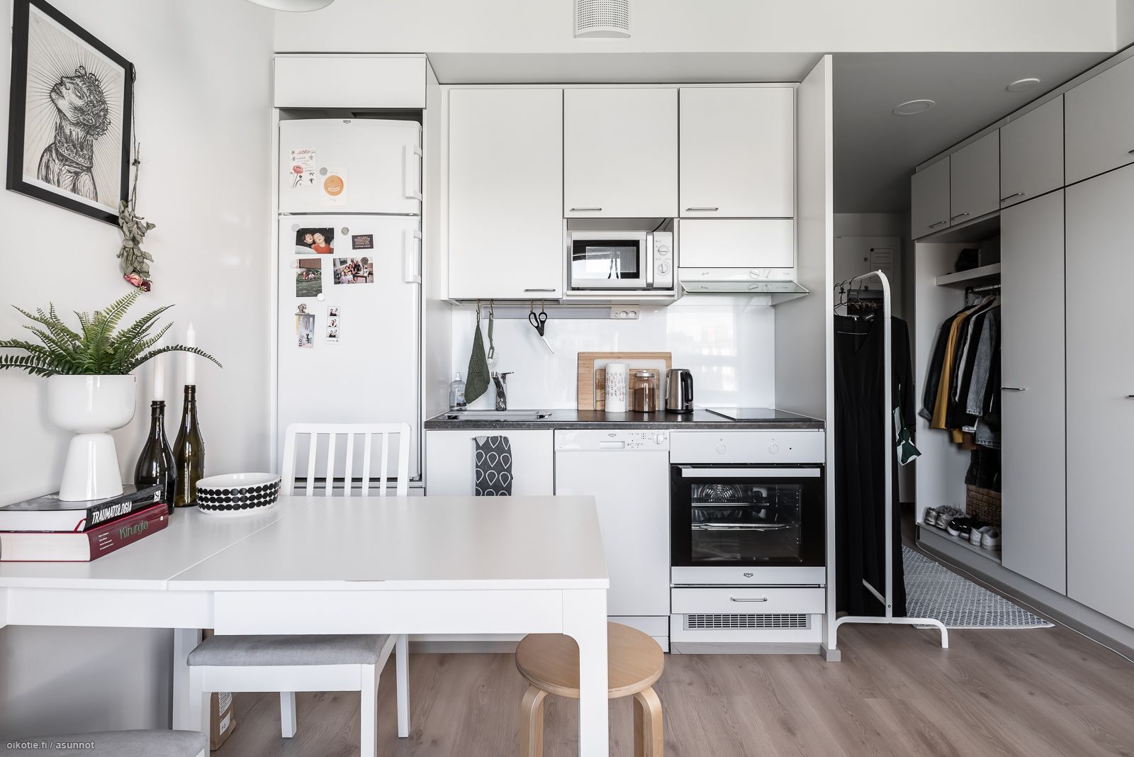 Tämä neljännen (4/5) kerroksen tilava yksiö ajanmukaisilla varusteluilla toimii hyvin pitkäaikaiseenkin tarpeeseen. Keittiöissä on 2-levyinen liesitaso, kalusteuuni, puolikorkea jää-pakastinkaappi (ns. jenkkikaappi) ja astianpesukone. Moderni kylpyhuone, josta löytyy paikka edestä täytettävälle pyykinpesukoneelle. Huoneistossa on ranskalainen parveke lisäämässä asumisen mukavuutta.
