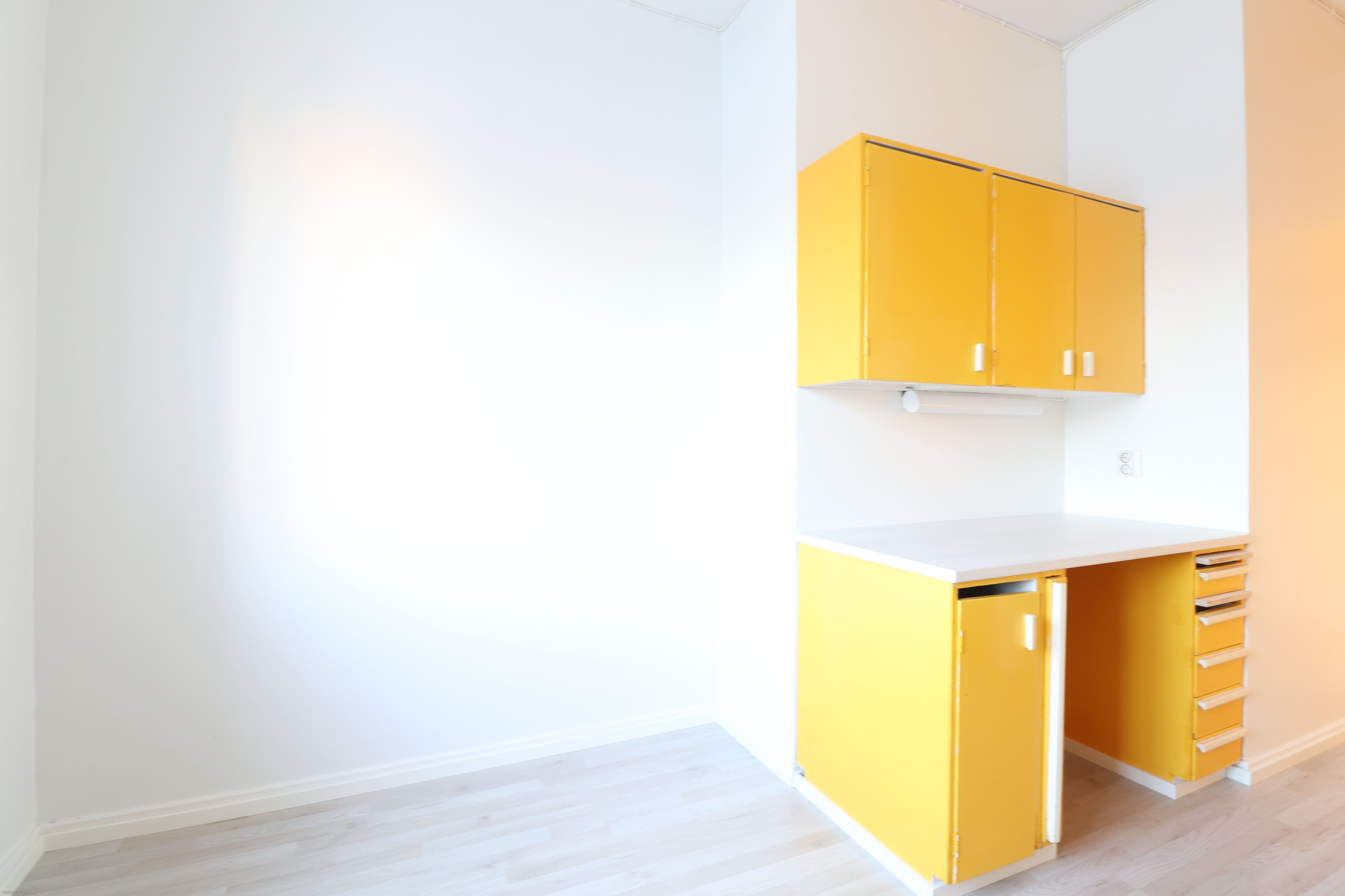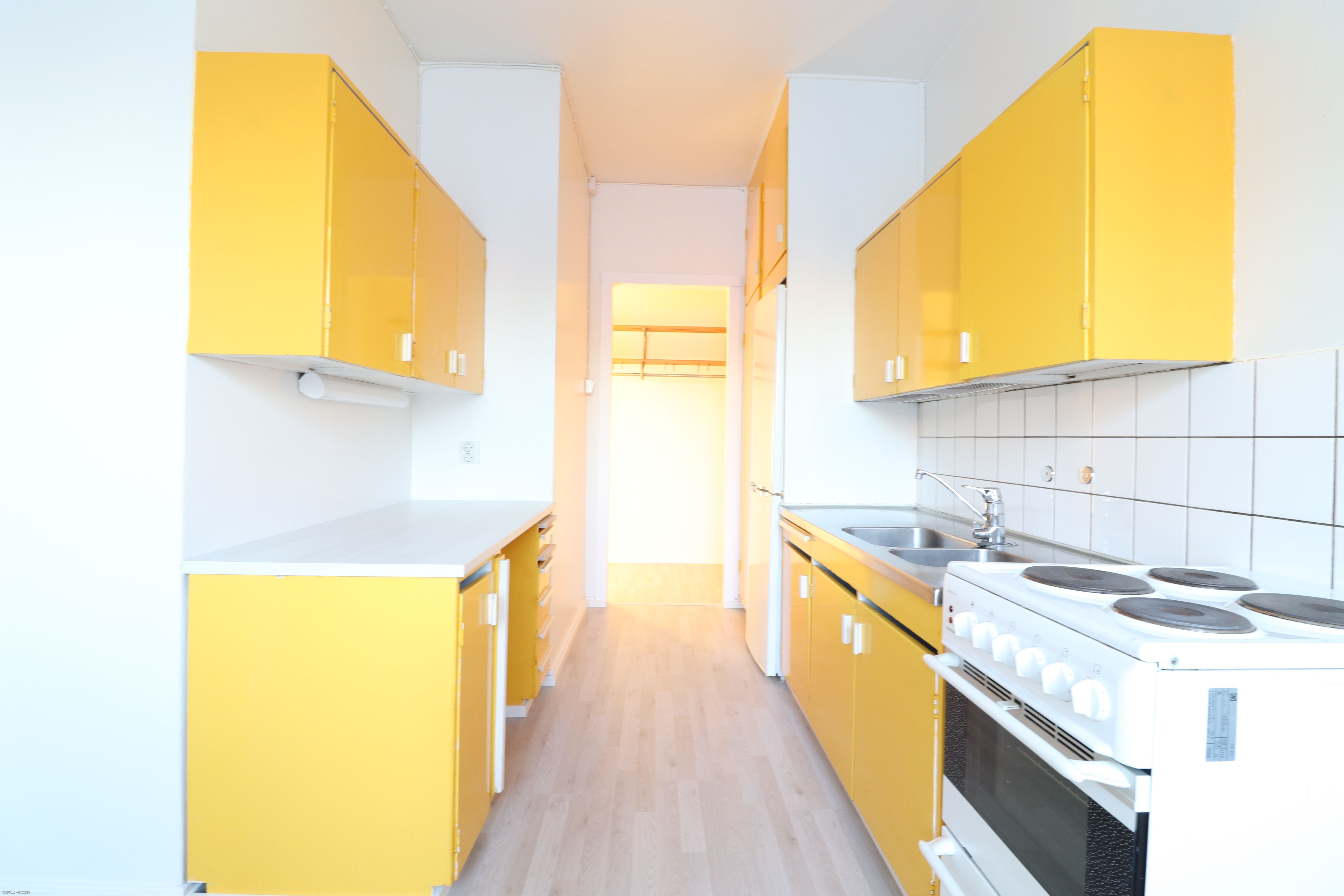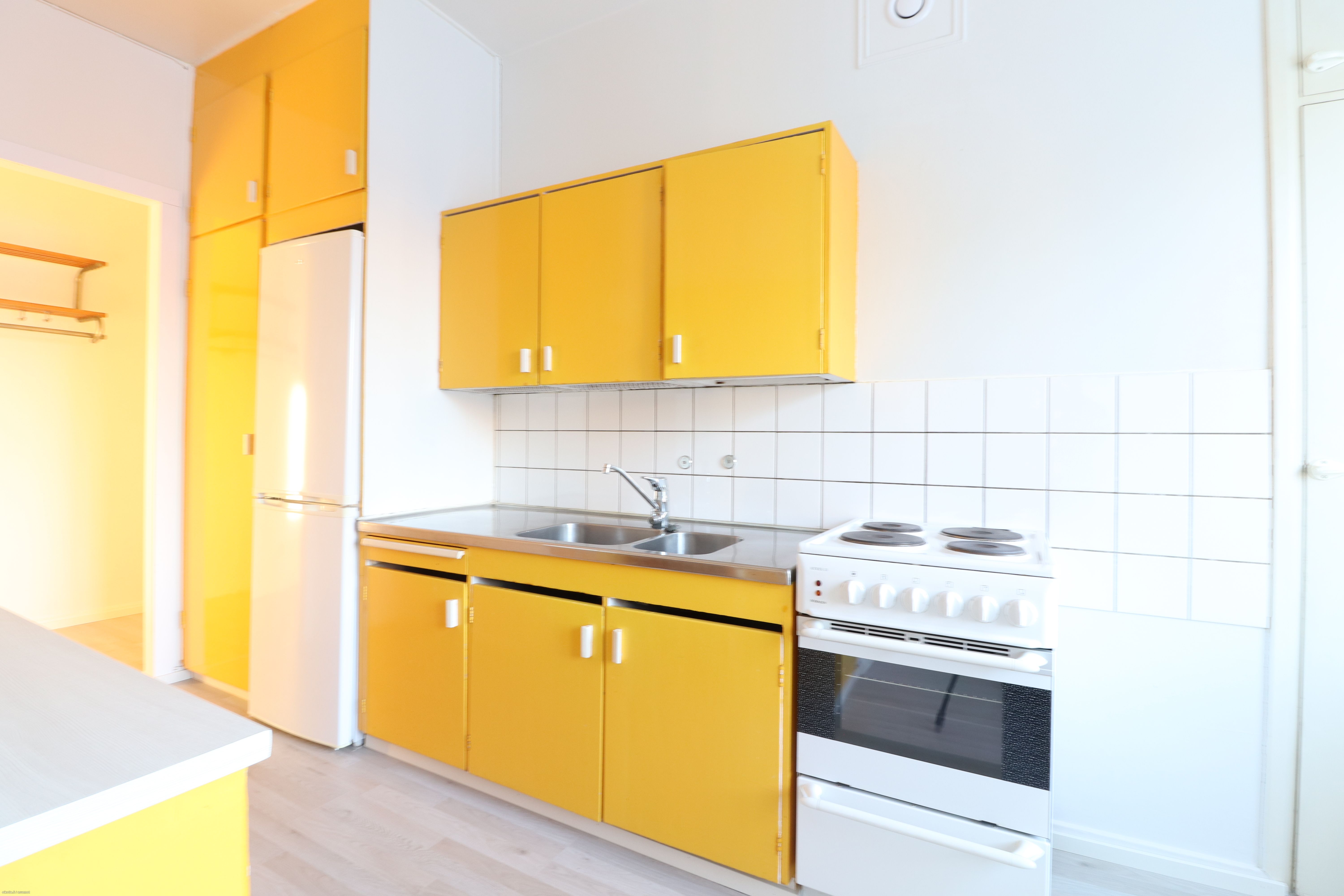 Heinäpäästä, puistomaisessa ympäristössä, vuokrattavana todella tilava toisen (2/5) kerroksen kaksio omalla parvekkeella. Lattiassa laminaatti ja seinät maalattu maalipinnoin. Keittiössä pirteät keltaiset kaapistot tuomassa persoonallisuutta! Uuni/liesi ja jääkaappipakastin kuuluu varusteluun, mutta valitettavasti asuntoon ei saa astianpesukonetta. Kylpyhuoneessa on tila ja liitännät pyykinpesukoneelle.