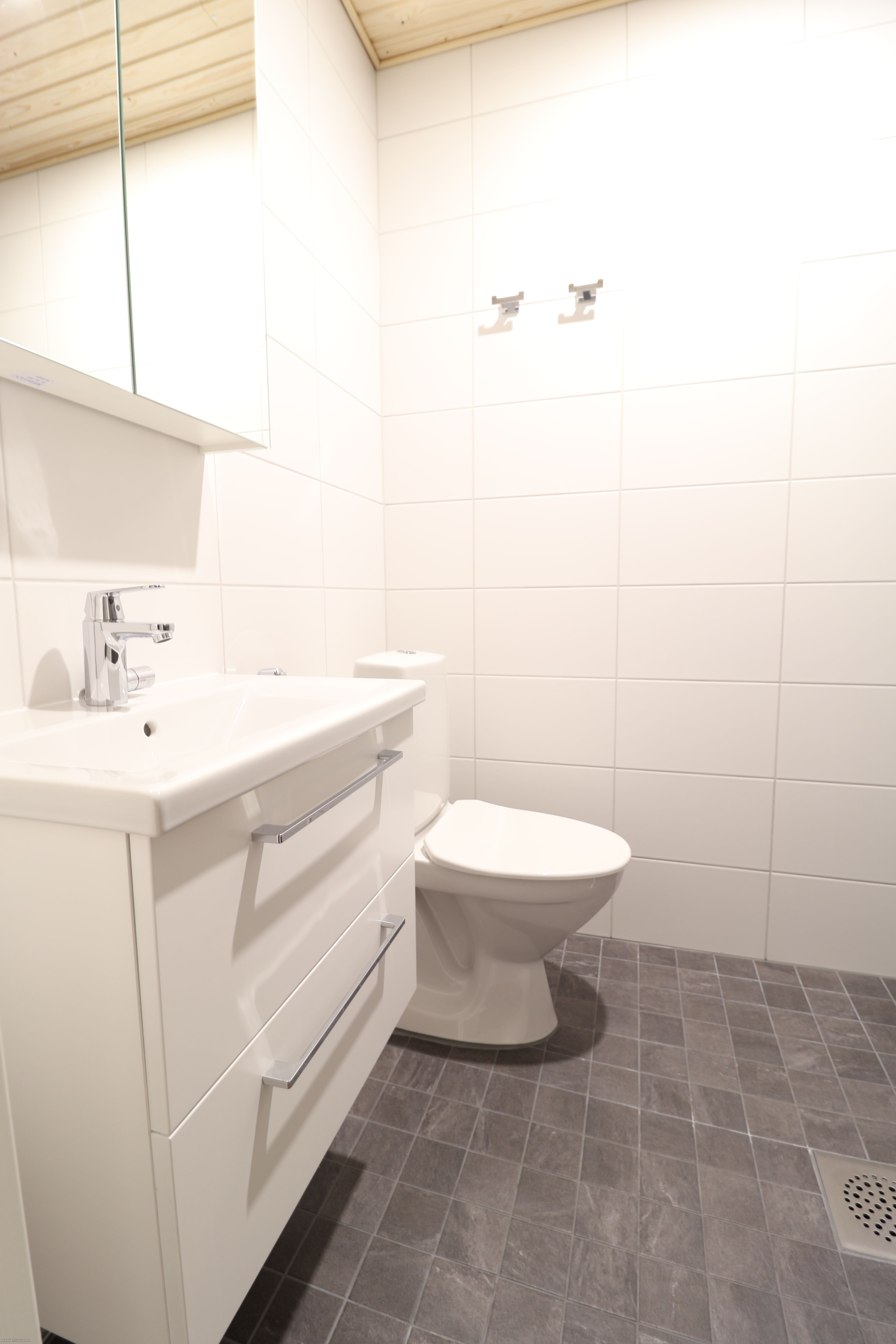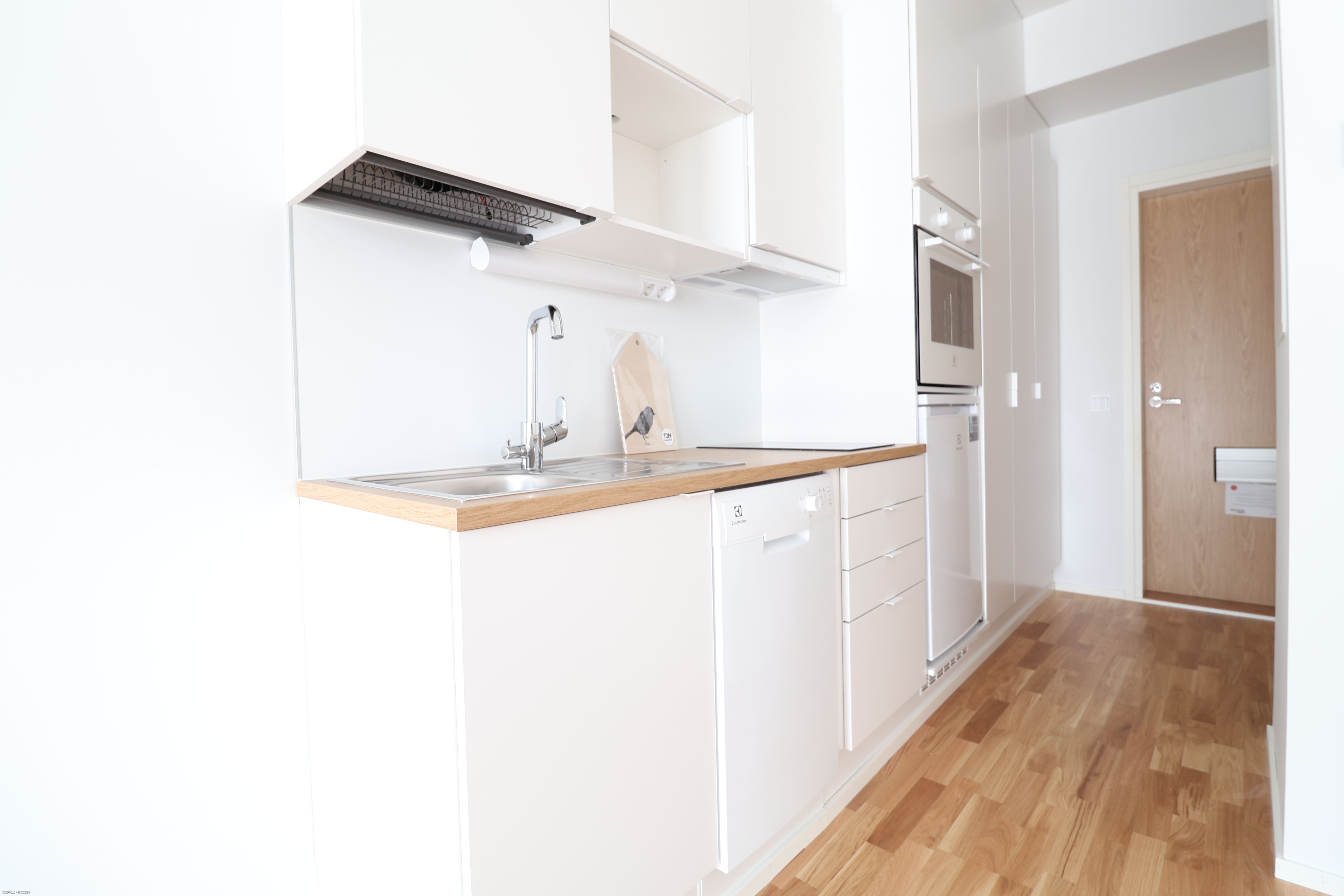 kalusteeseen upotettu erillisuuni, liesikupu ja astianpesukone sekä jääkaappi pakastinlokerolla. Lattiat ovat laadukasta tammilautaparkettia ja seinät vaalein maalipinnoin. Tilavassa kylpyhuoneessa liitännät pyykinpesukoneelle.