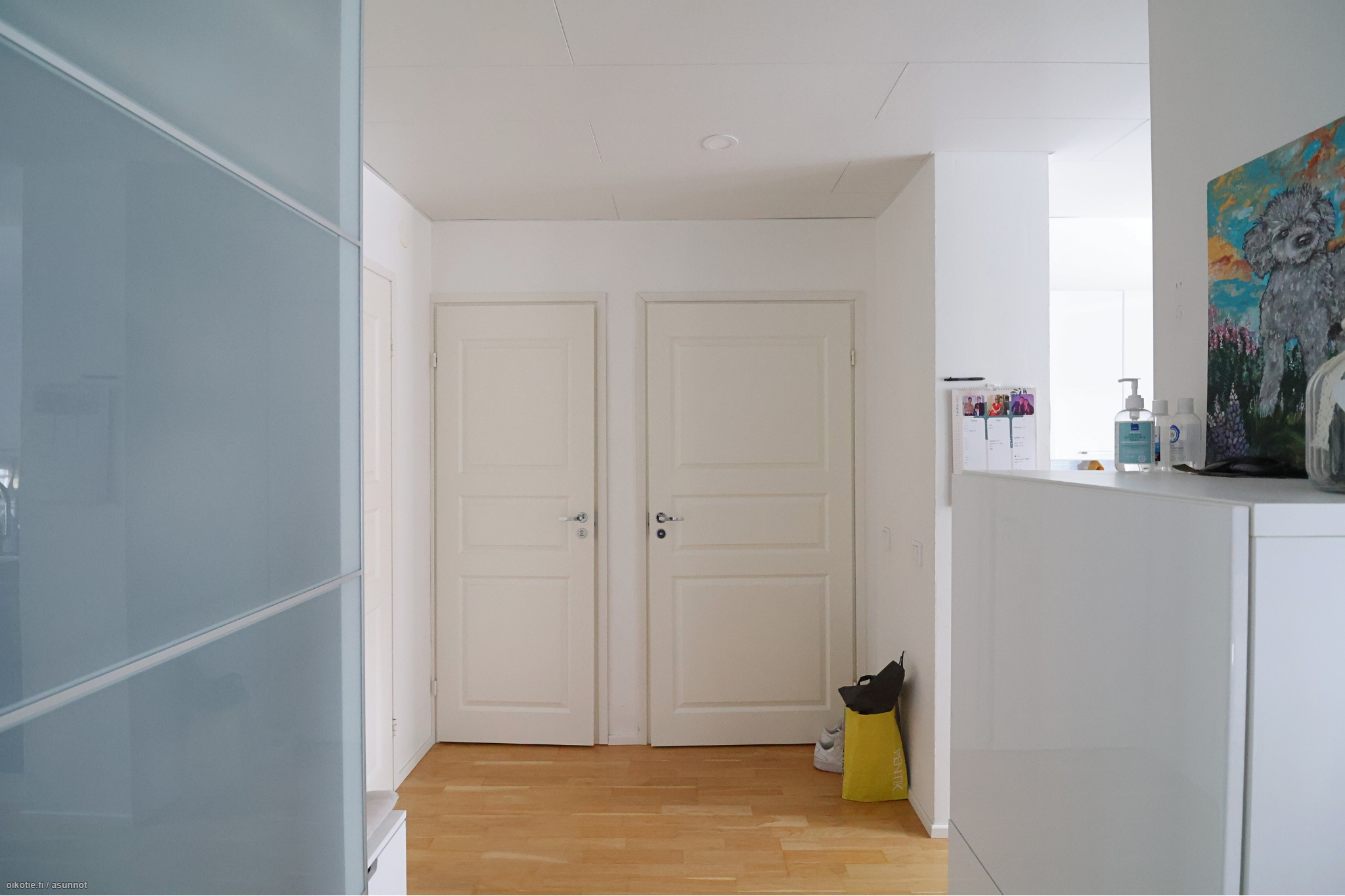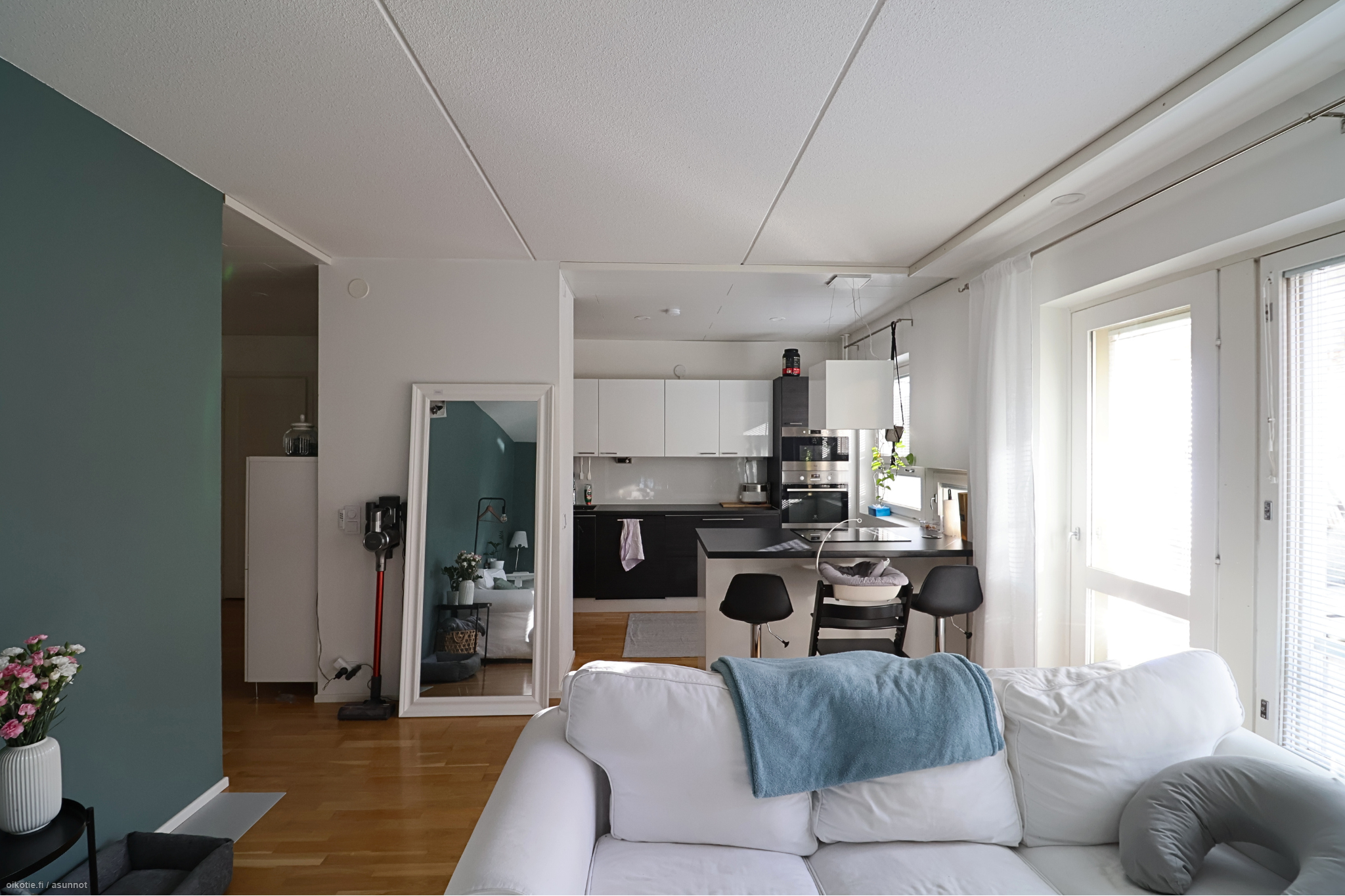 Valoisa ja avara läpitalon kaksio sijaitsee talon toisessa kerroksessa. Olohuoneen suuret lounaaseen avautuvat ikkunat ja lasitettu parveke tuovat kotiin runsaasti luonnonvaloa. Makuuhuoneessa on peililiukuovien lisäksi erillinen vaatehuone, joka tarjoaa runsaasti säilytystilaa. Tilava kylpyhuone on hiljattain täysin remontoitu, ja sieltä löytyy myös valmius pyykinpesukoneelle. Modernissa keittiössä on kattava varustelu: jääkaappi-pakastin, liesi, uuni sekä astianpesukone.