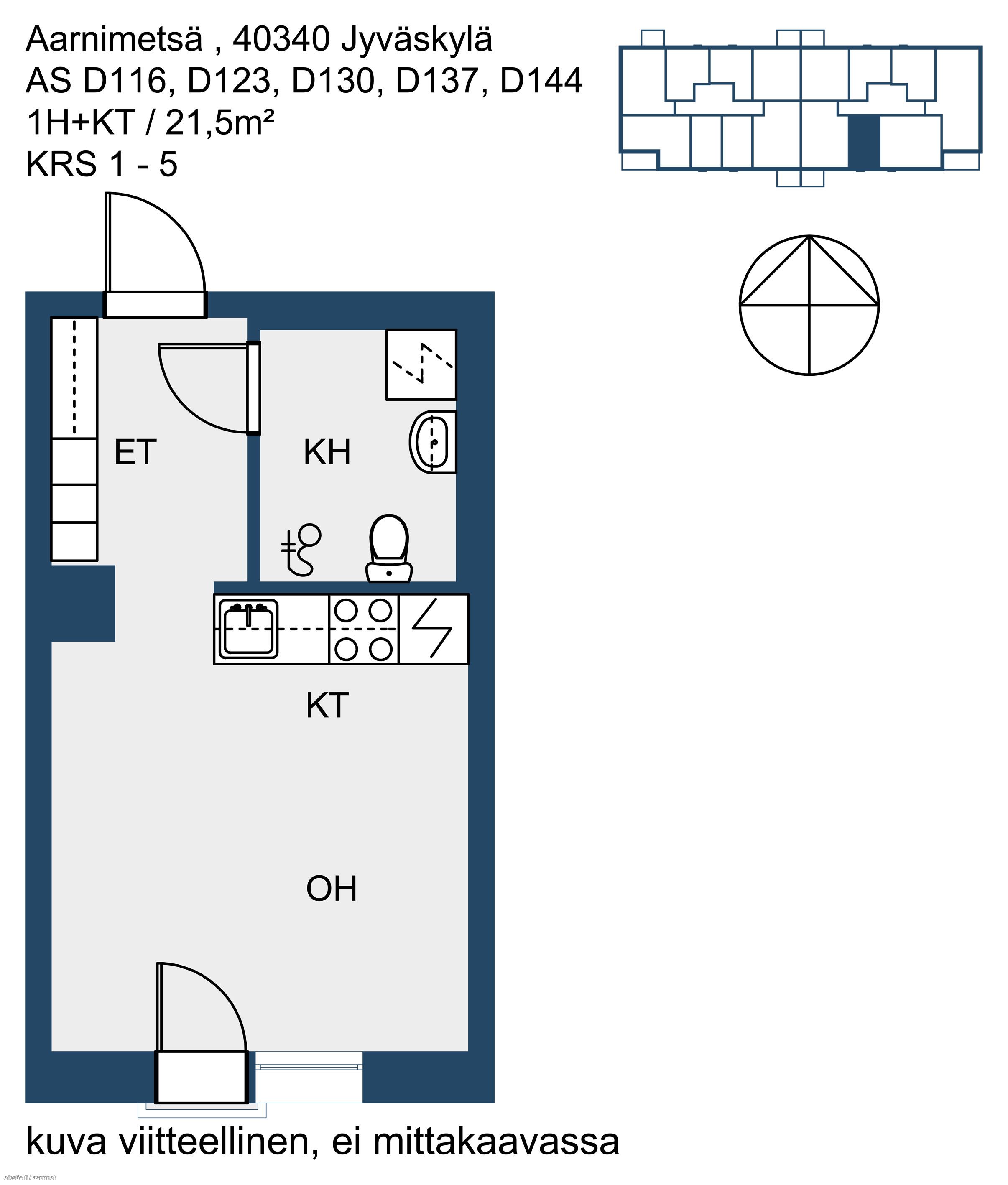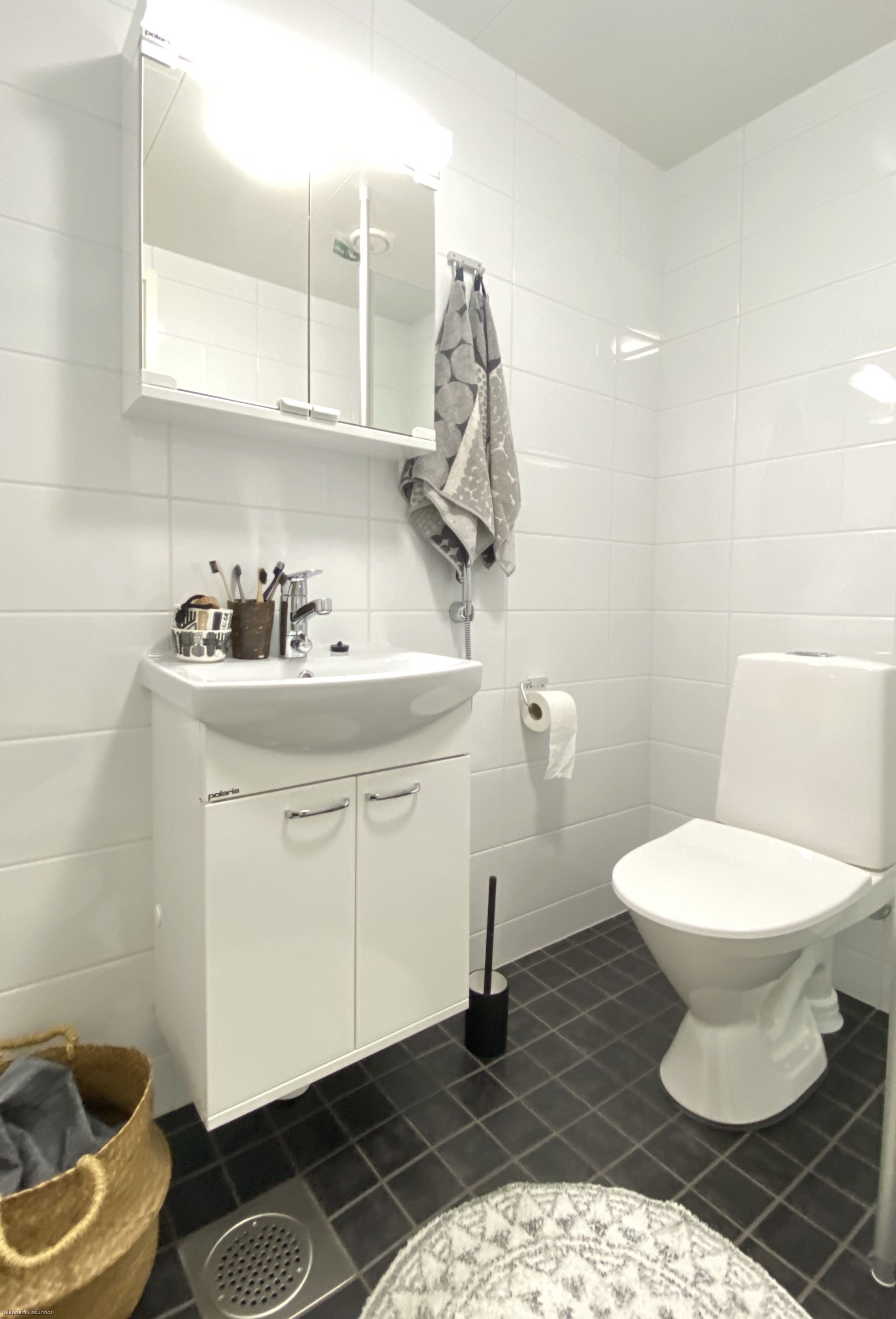 Asunnon lattiat ovat laminaattia, seinät maalipinnoin ja kylpyhuone laatoitettu. Keittiötilassa on yhdistetty jääkaappi ja pakastin, astianpesukone sekä liesi. Pesuhuoneeseen mahtuu hyvin pyykinpesukone. Ikkunoissa sälekaihtimet. Asunnossa on vesikiertoinen lattialämmitys, joka sisältyy vuokraan.