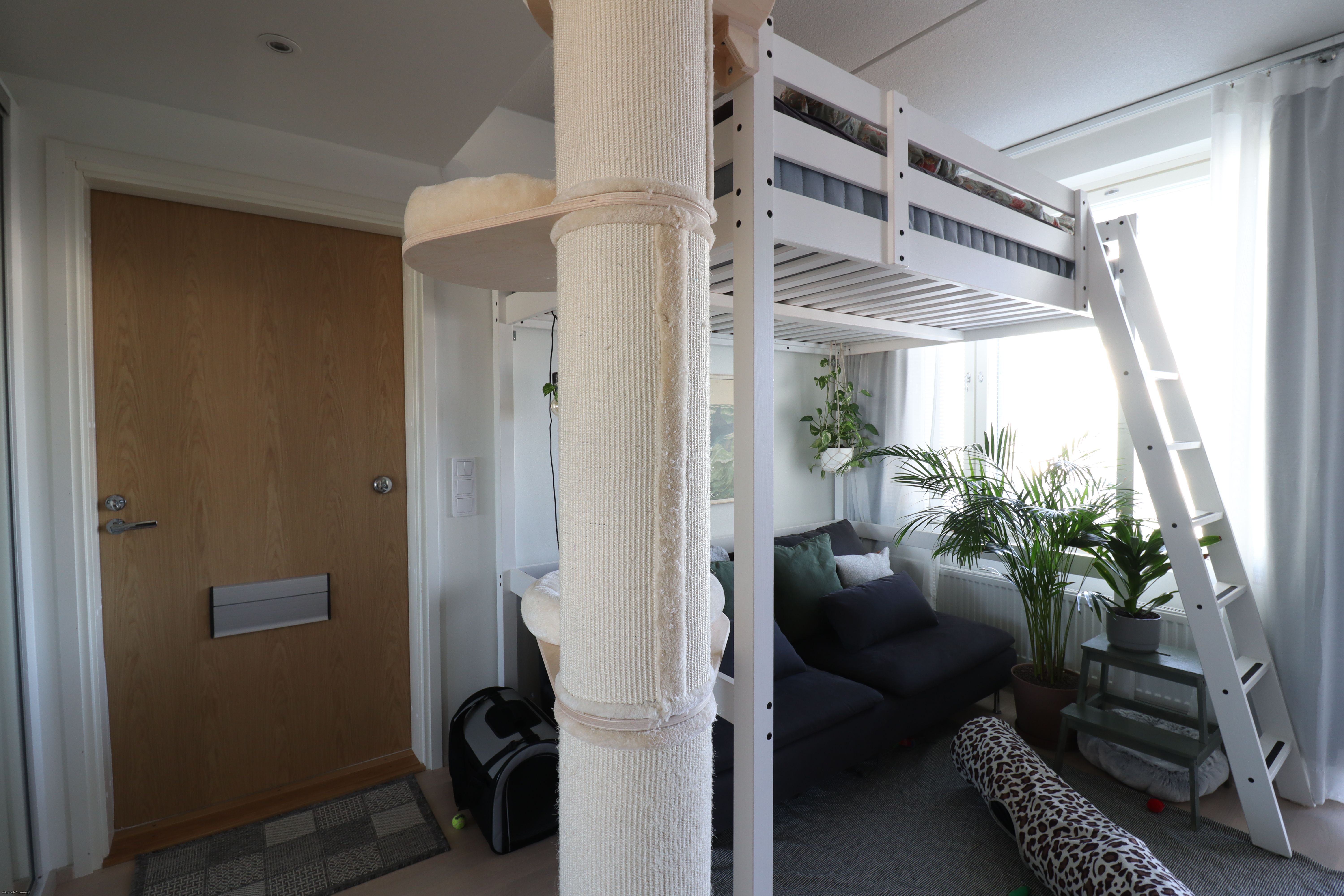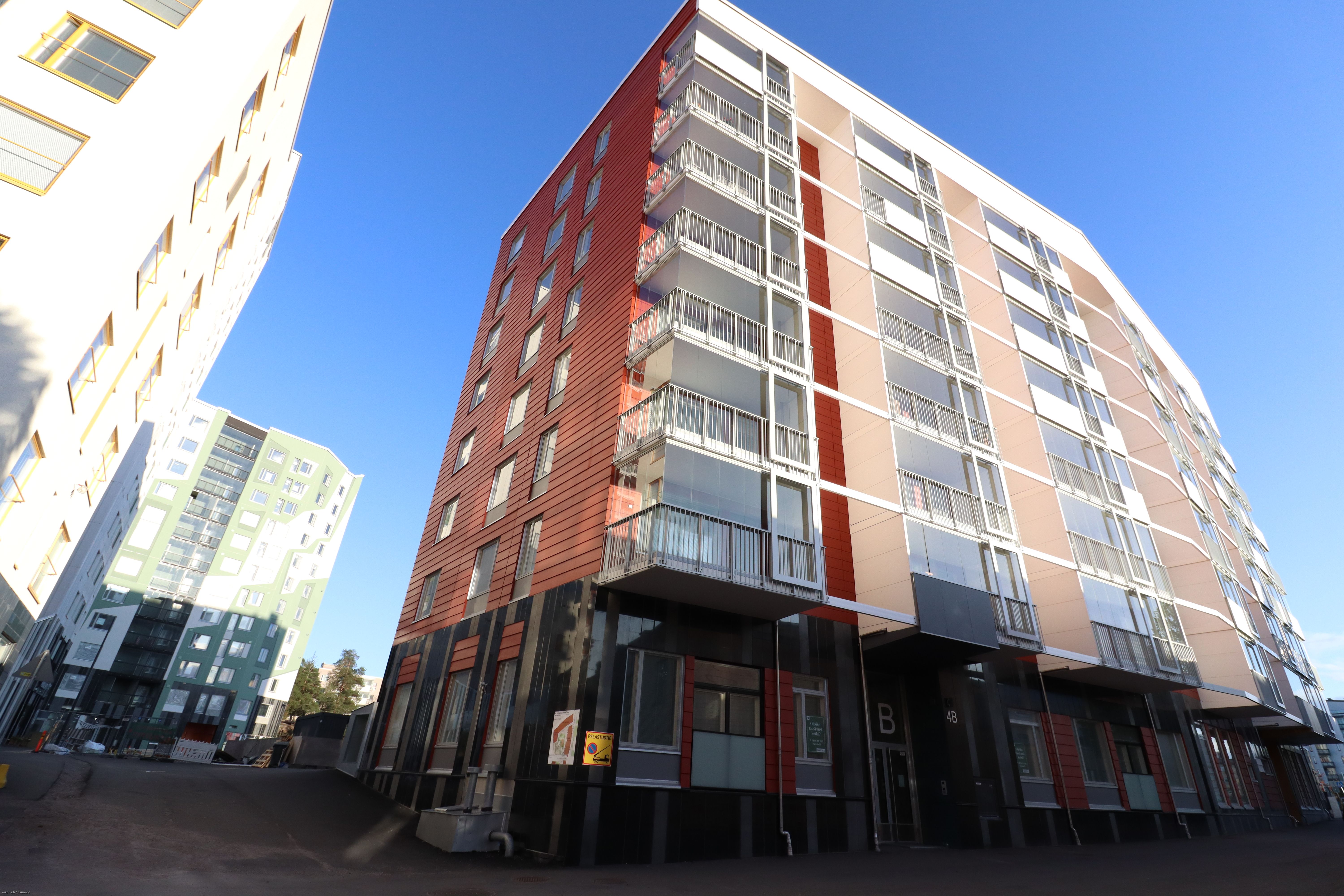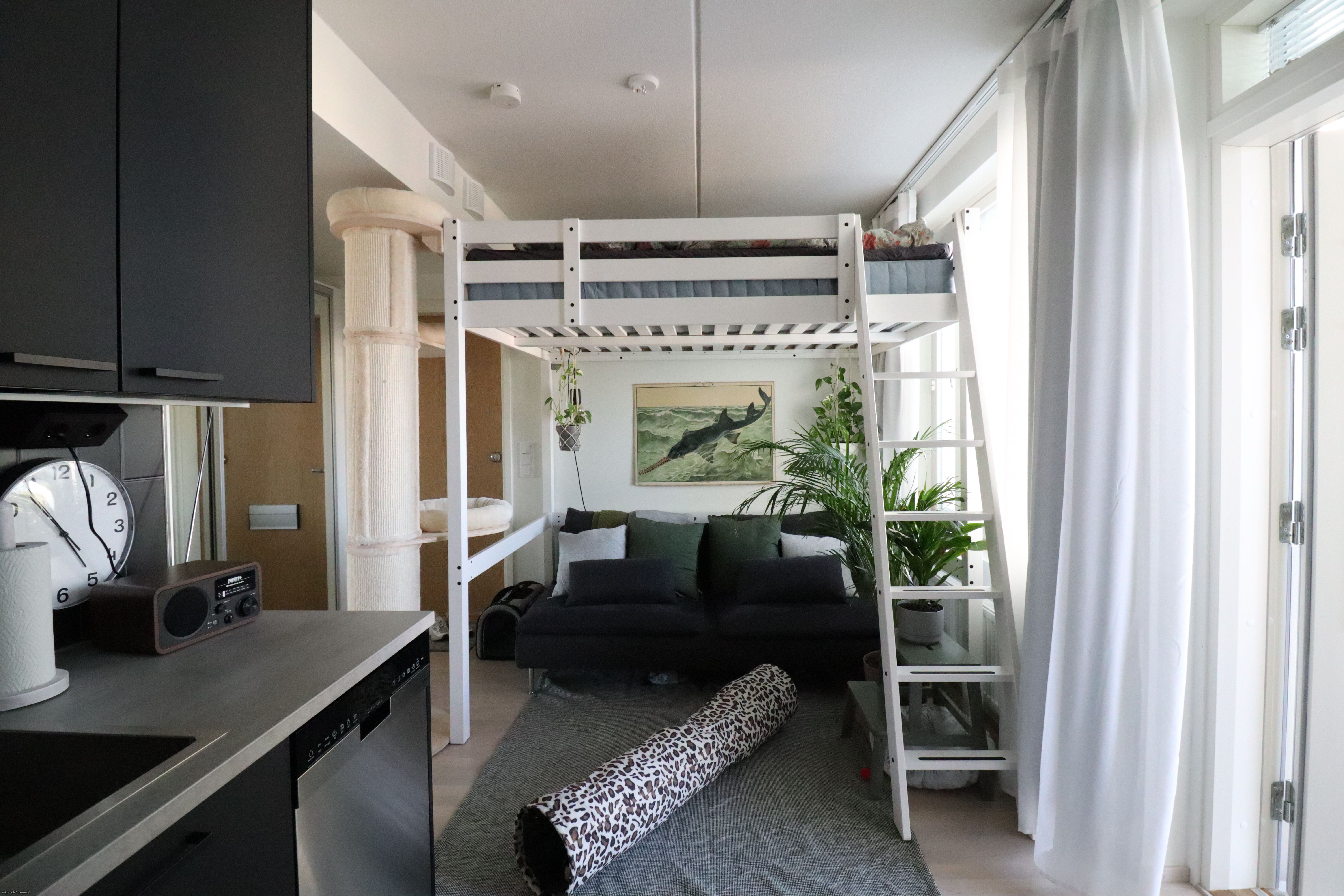 Tässä asunnossa on neliöt käytetty tehokkaasti ja lisätilaa asumiseen tuo lasitettu parveke. Kylpyhuoneessa paikka ja liitännät pyykinpesukoneelle. Upean keittiön varusteluun kuuluu, jääkaappiapakastin, hella/uuni sekä astianpesukone. Seinät vaalealla maalipinnalla ja lattiat lautaparkettia.